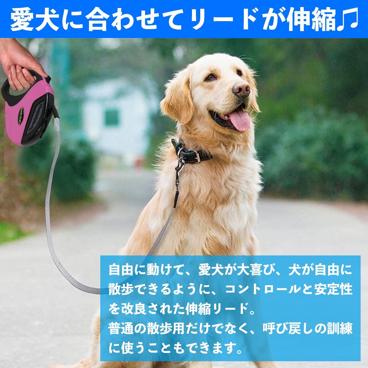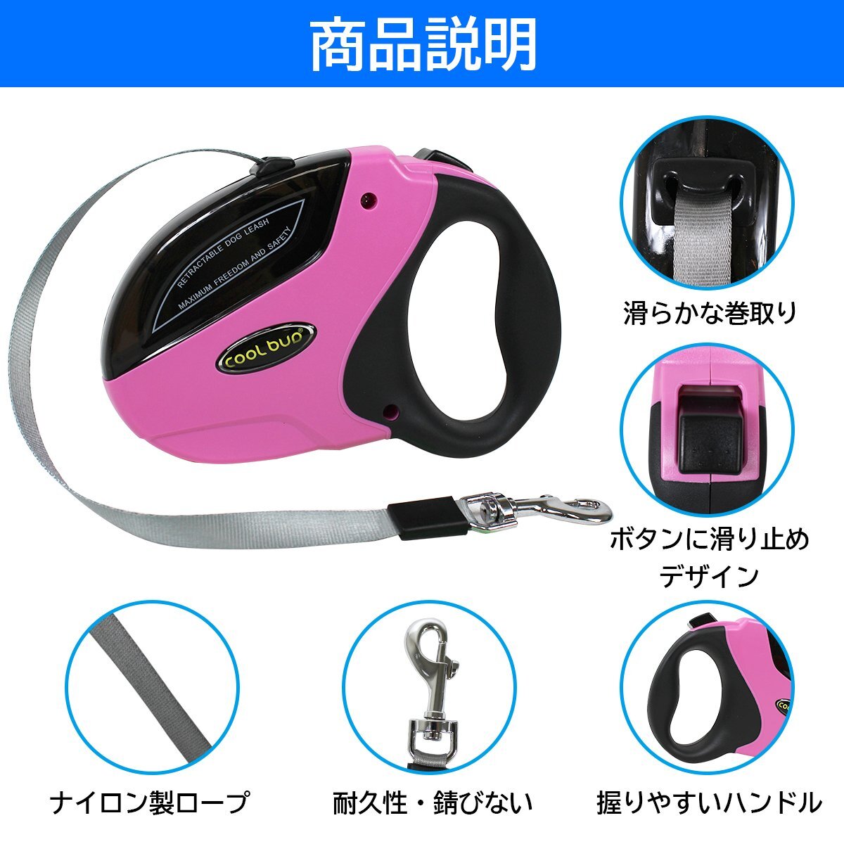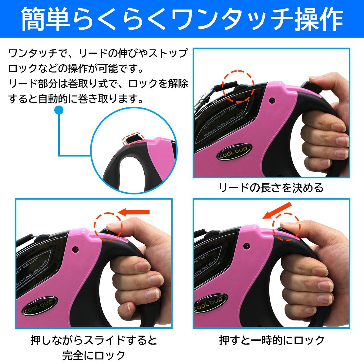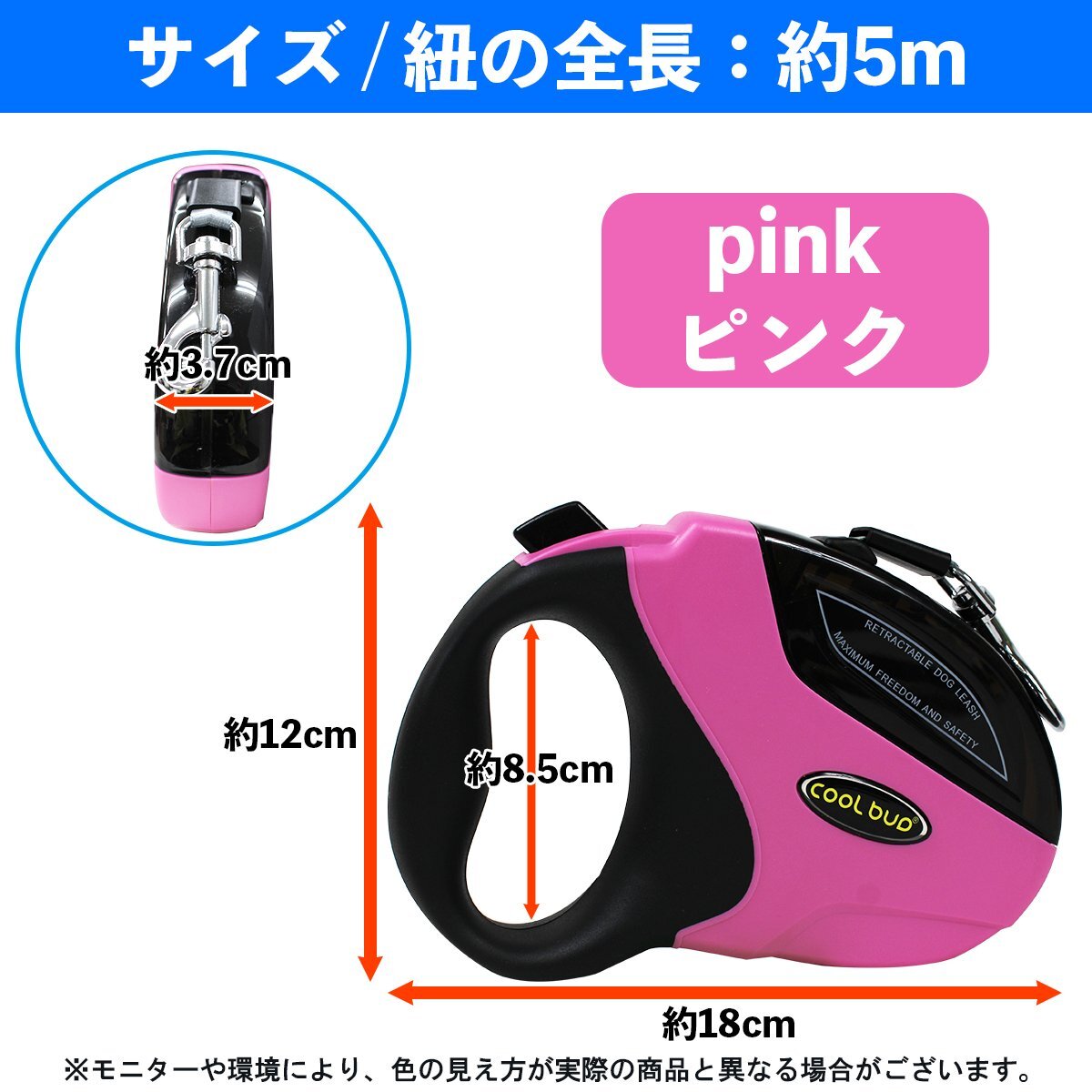 【新品即納】便利なロック機能付き!犬用 伸縮 リード 5m/5メートル 自動巻き取り ピンク 紅 ペット 散歩 小型犬 中型犬 犬 ヒモ