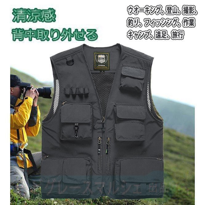 フィッシングベスト カメラマン メンズ アウトドア メッシュ ジャケット ベスト トップス 登山 多機能 速乾 作業服 グレー hw1423.gl.2XL