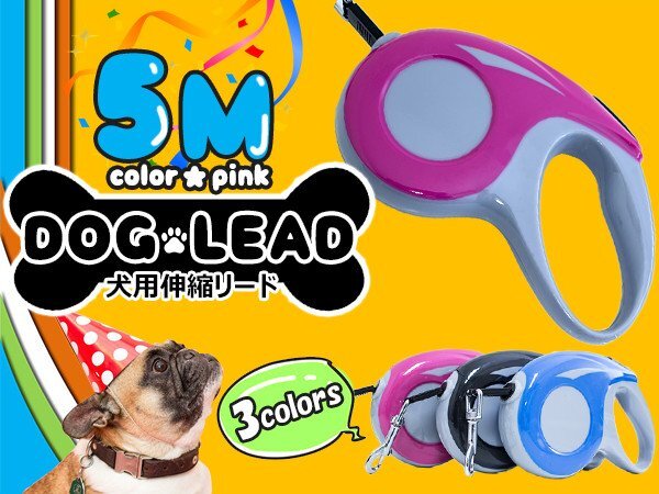 便利なロック機能付き!犬用伸縮リード 5m/5メートル 自動巻き取り ピンク 散歩用リード コンパクト ペット用品 散歩グッズ