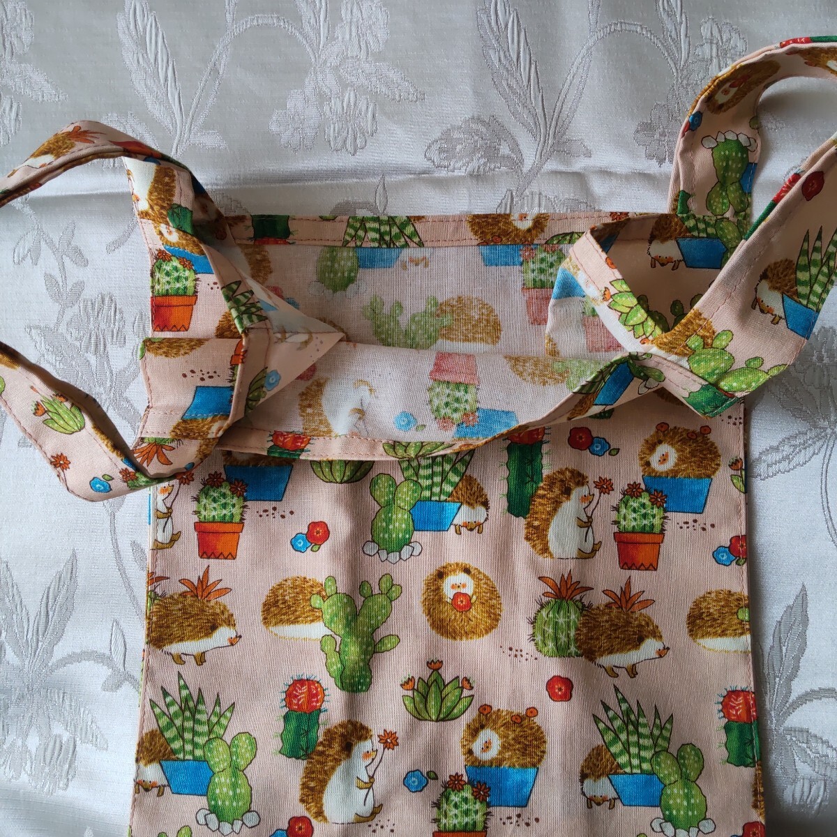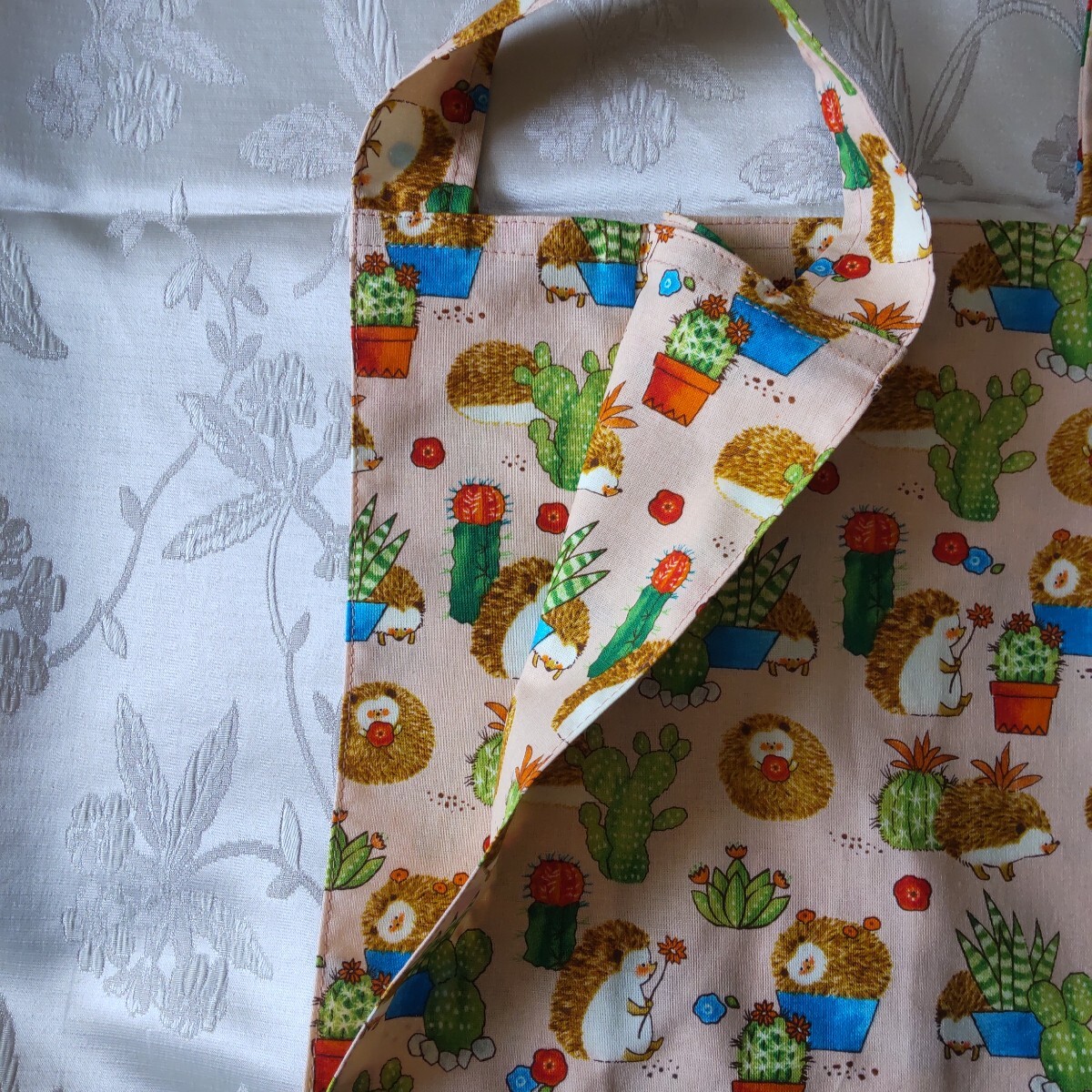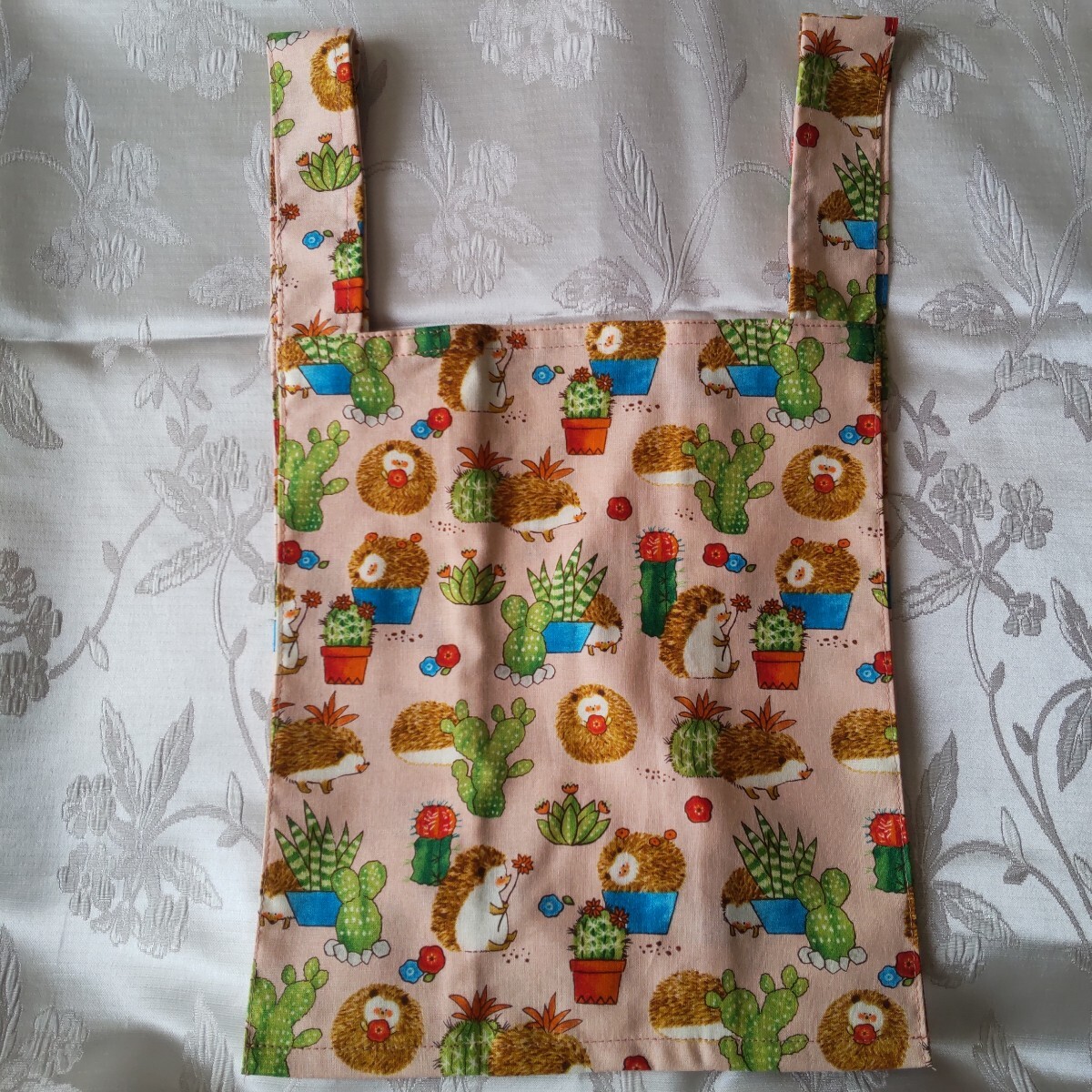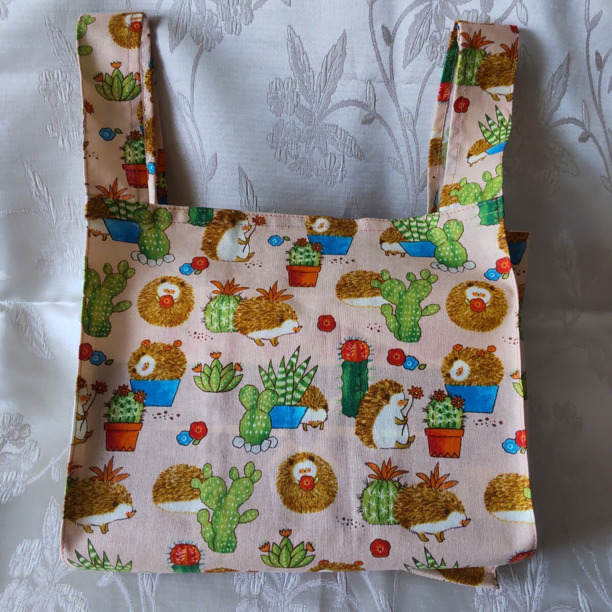 ハンドメイドのハリネズミ柄のコンビニレジ袋型エコバッグです。