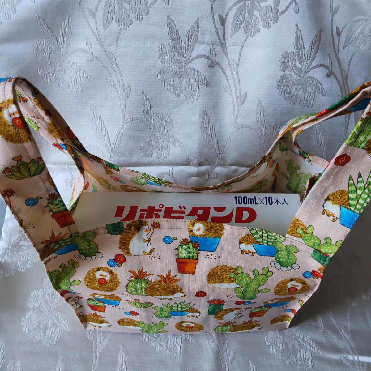 大きさの参考に栄養ドリンクの箱を入れてみました。(商品には含まれません。) 丁寧に作ってはいますが、素人の手作りですのでご理解の上、ご購入検討してください。