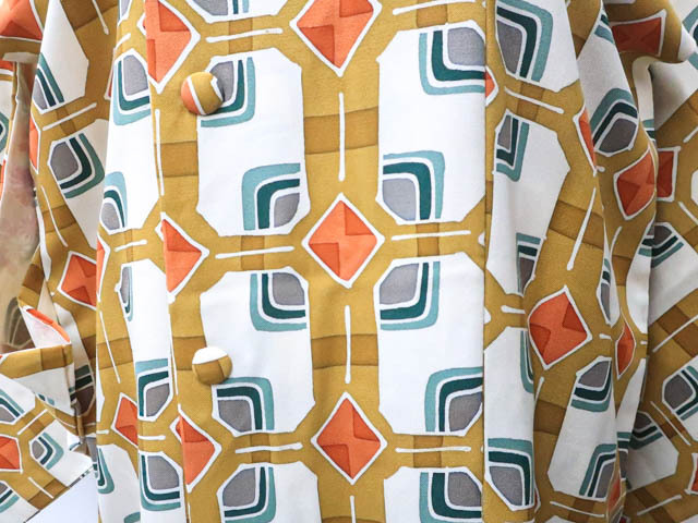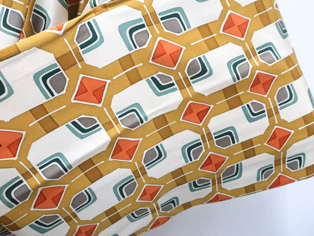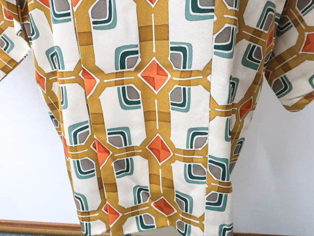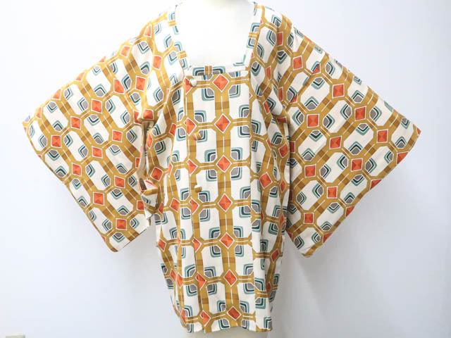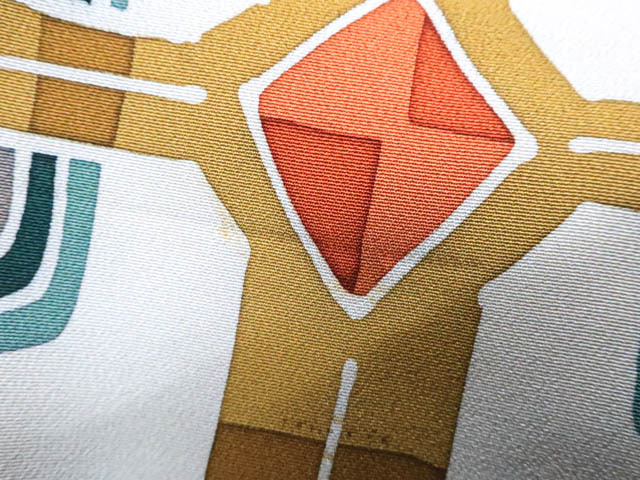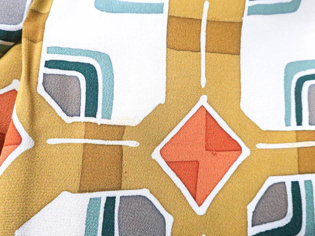 リサイクル商品のため、左前袖に薄しみ、右前身頃に点しみがございますが着用可能なお品です。 地色は アイボリー 黄土です。 1枚目の画像が近いお色かと思われます。 素材は正絹です。 |