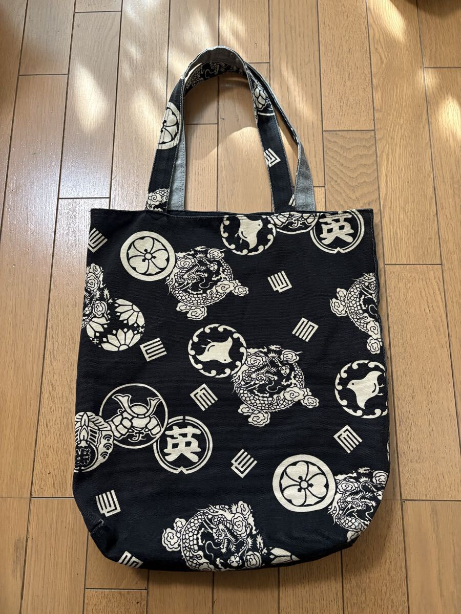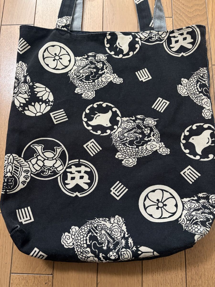 戦国兜など武将デザインと龍のスカジャン風のデザインが非常にインパクト抜群のトートバッグです。