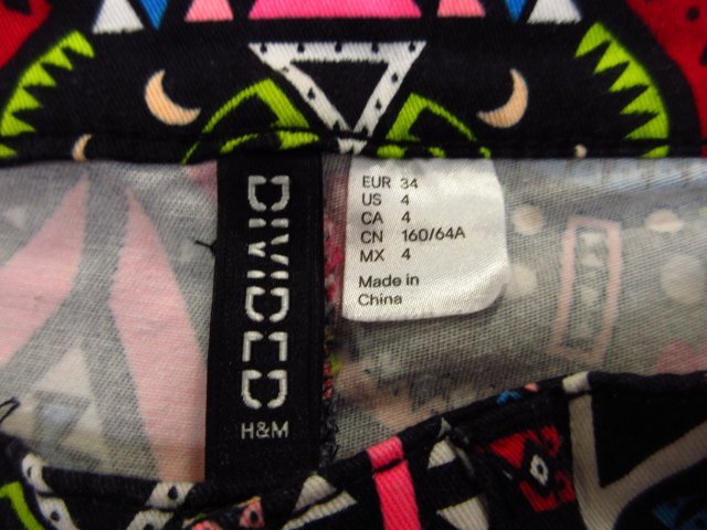 DIVIDED H&M 柄パンツ ズボン 黒×ピンク系 カラフル柄 総柄 幾何学模様 オルテガなど EUR:34 ストレッチ性あり