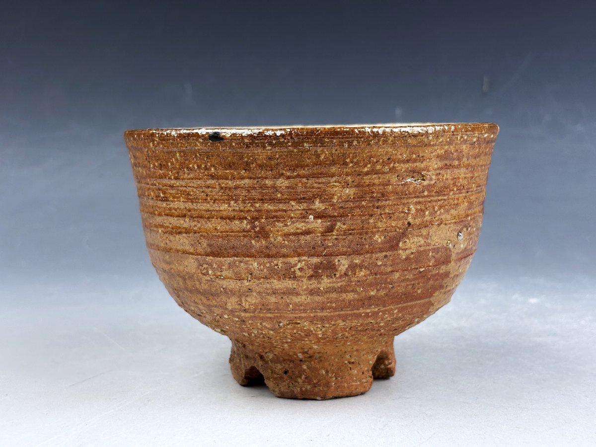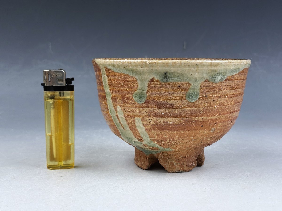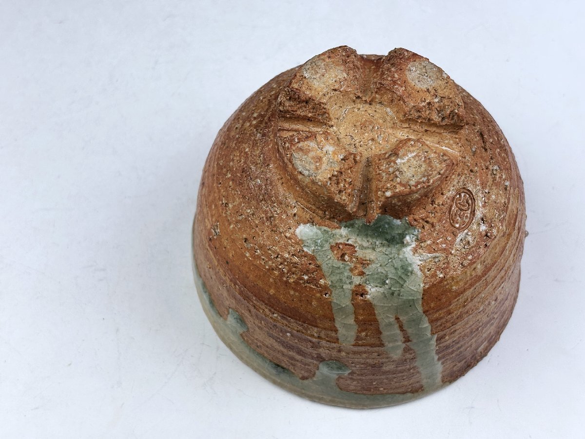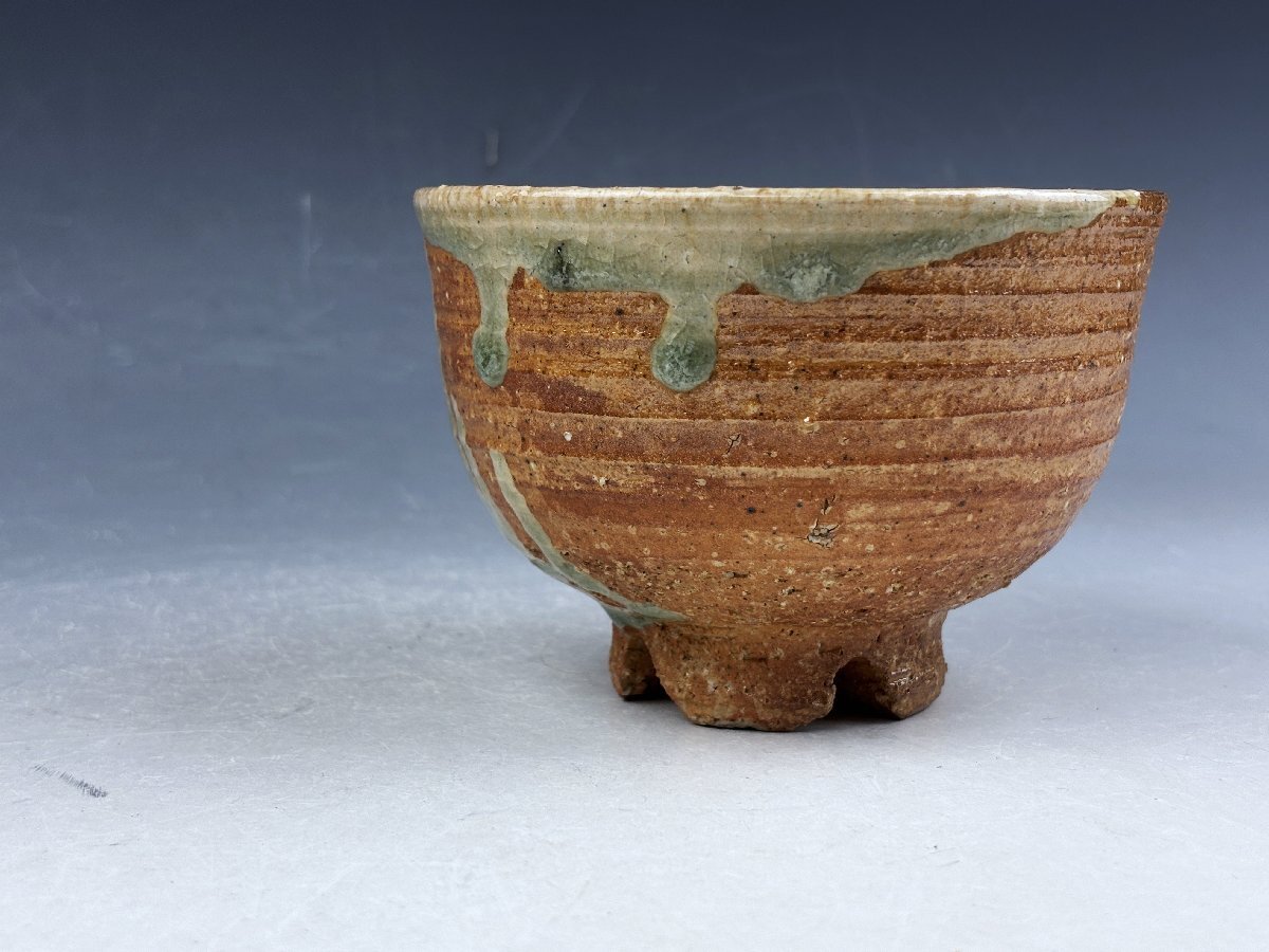 京焼の名工 四代三浦竹泉造の御茶碗です。四つ割高台を施した信楽焼の御茶碗でビードロの釉溜と釉垂の景色が味わい深い御茶碗です。