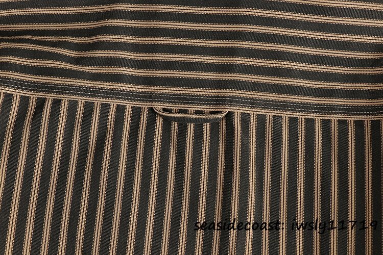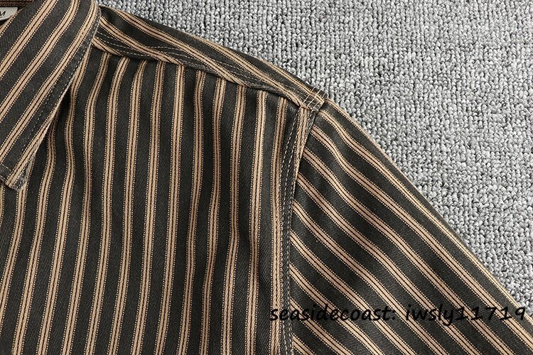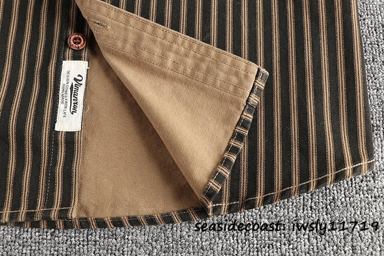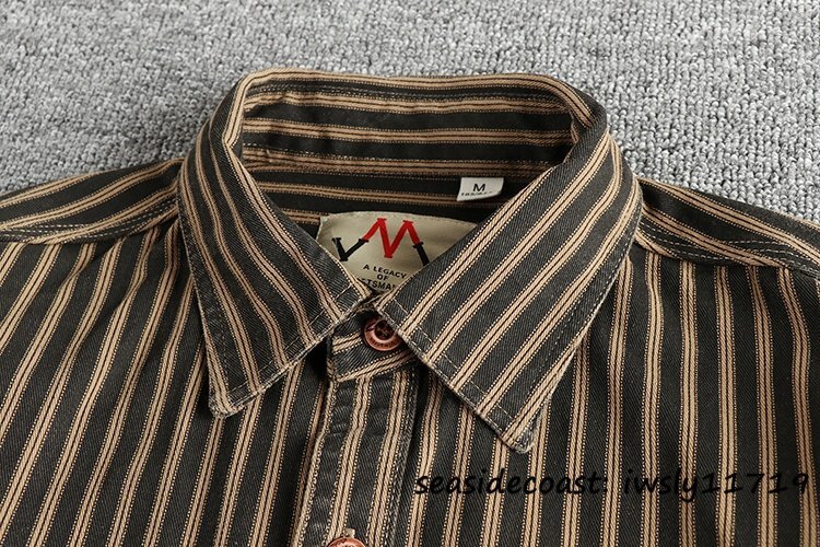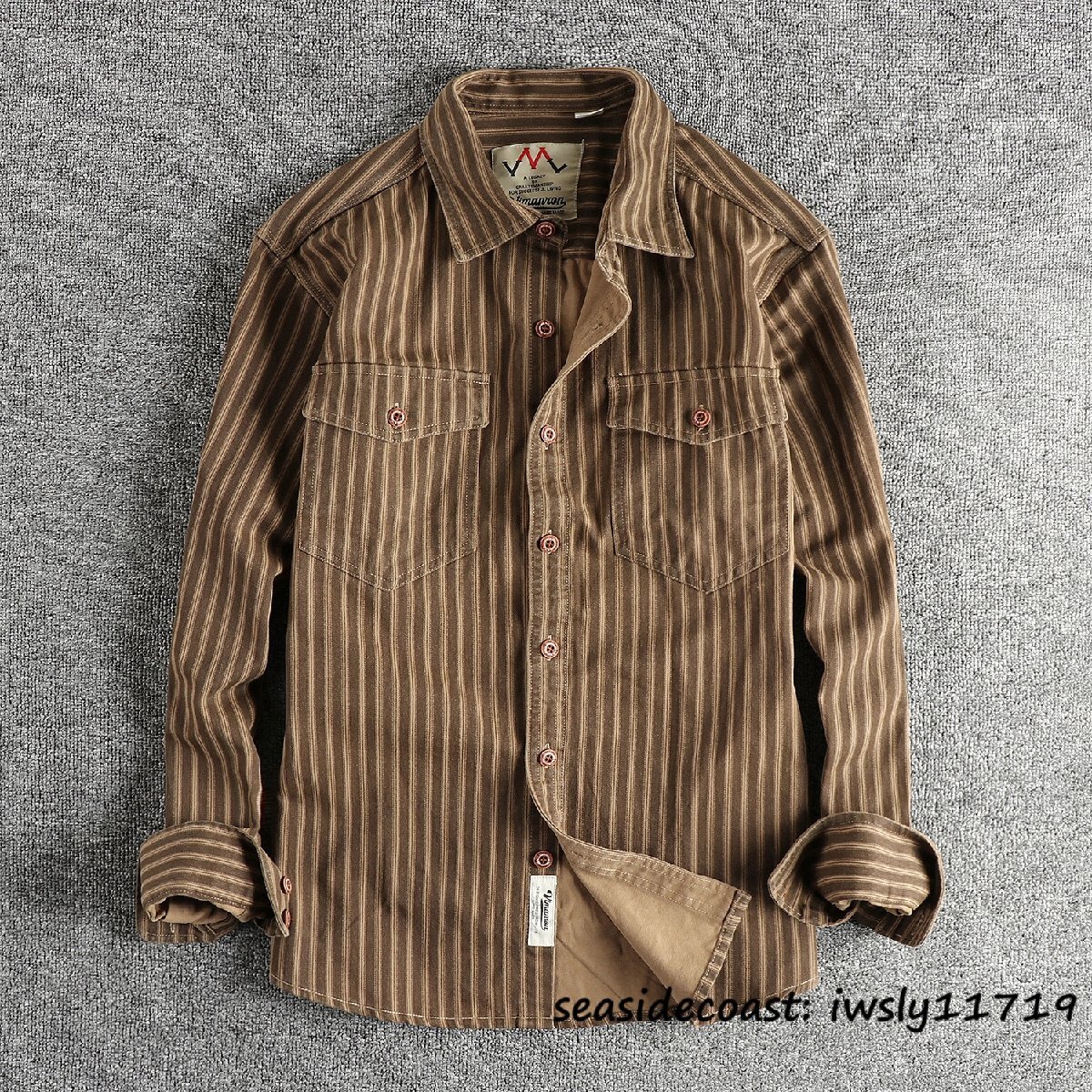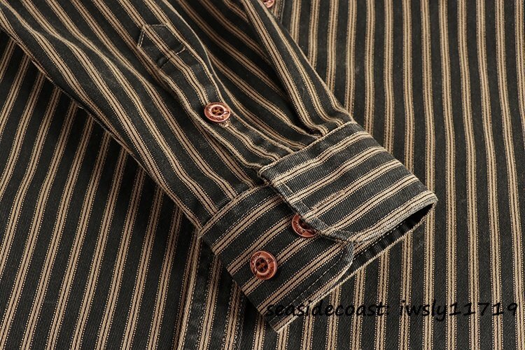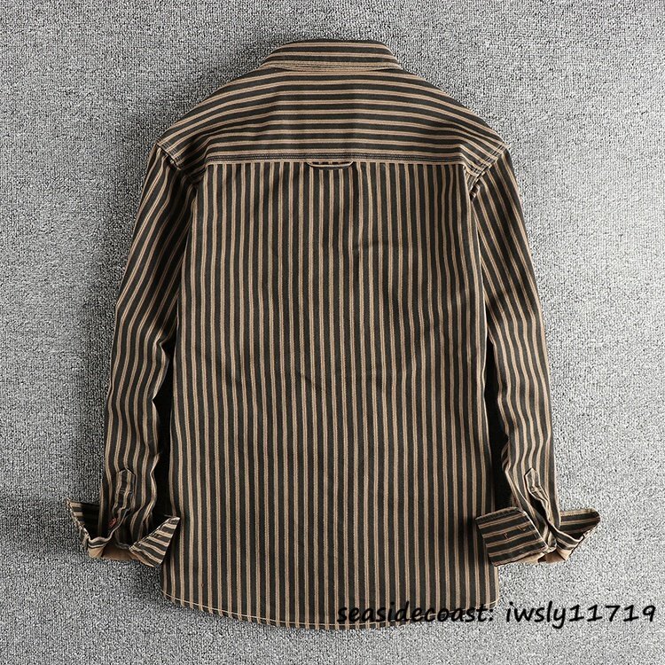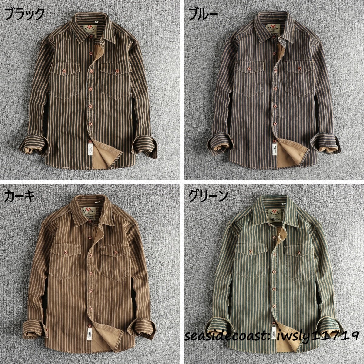 新品■メンズ 長袖シャツ ワークシャツ ストライプ柄 厚手 秋冬 ミリタリー 防風 ビンテージ アメリカン ワッシャー 心地良し カーキ M