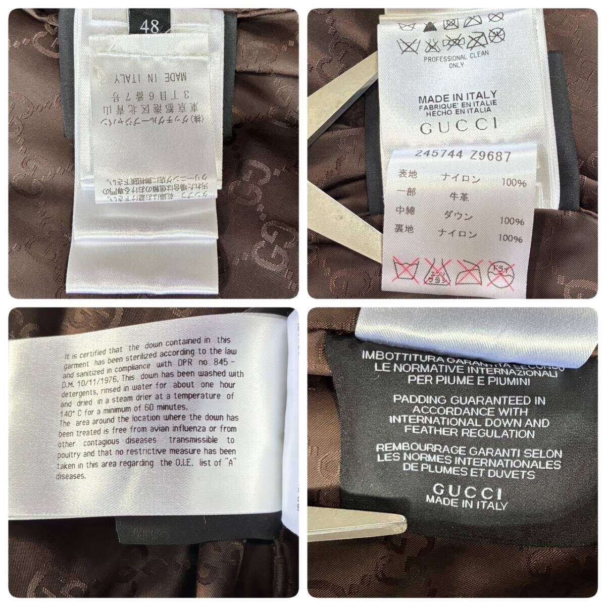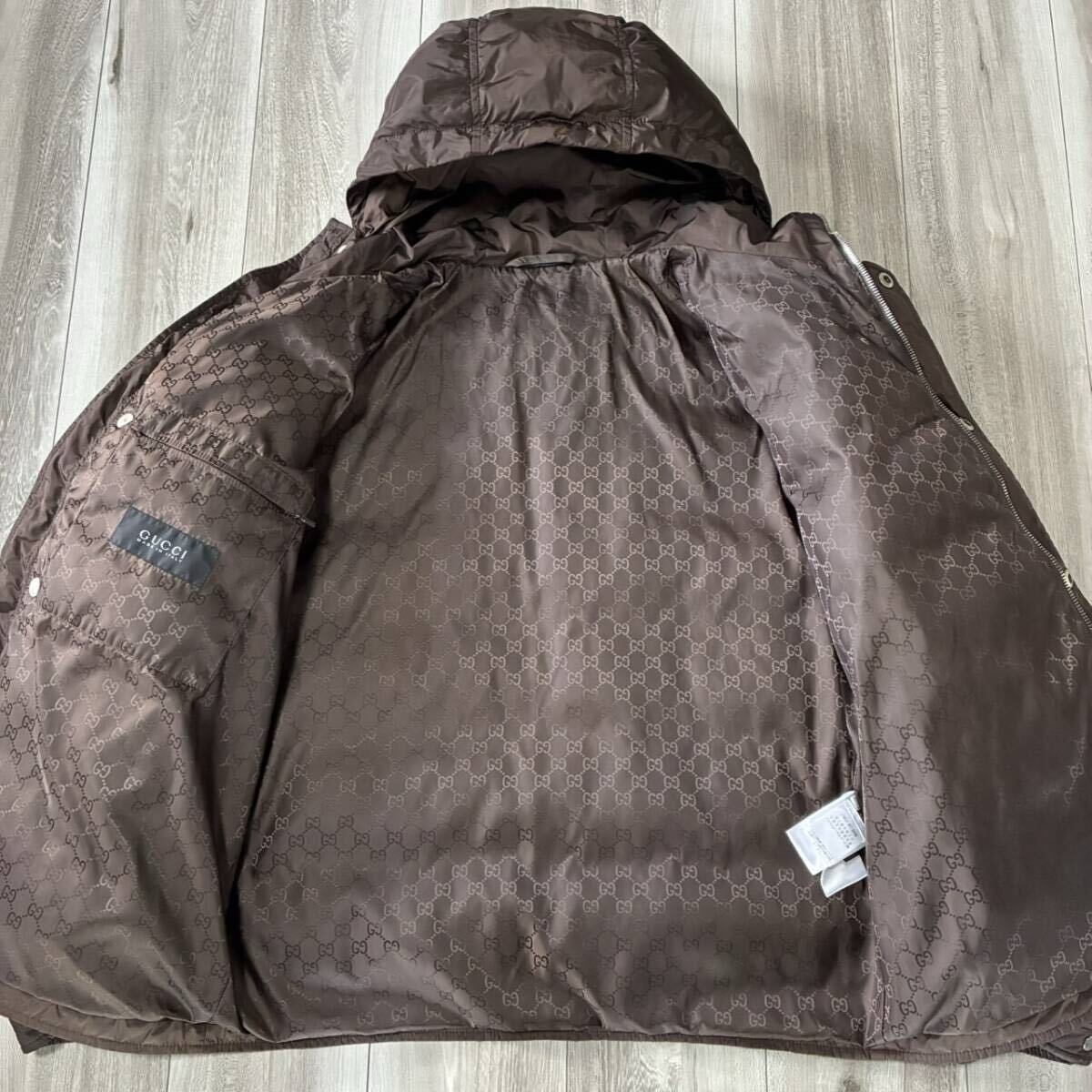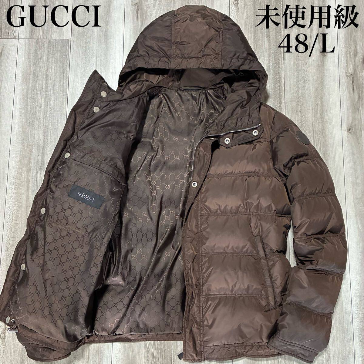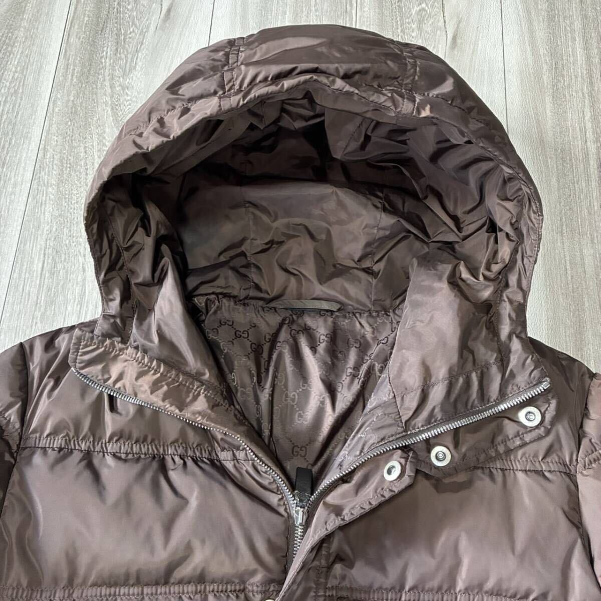 未使用級/L 『GUCCI グッチ』GG総柄 ダウンジャケット 48 エンブレム レザーワッペン 冬 近年モデル ダークブラウン アウター フード 極暖