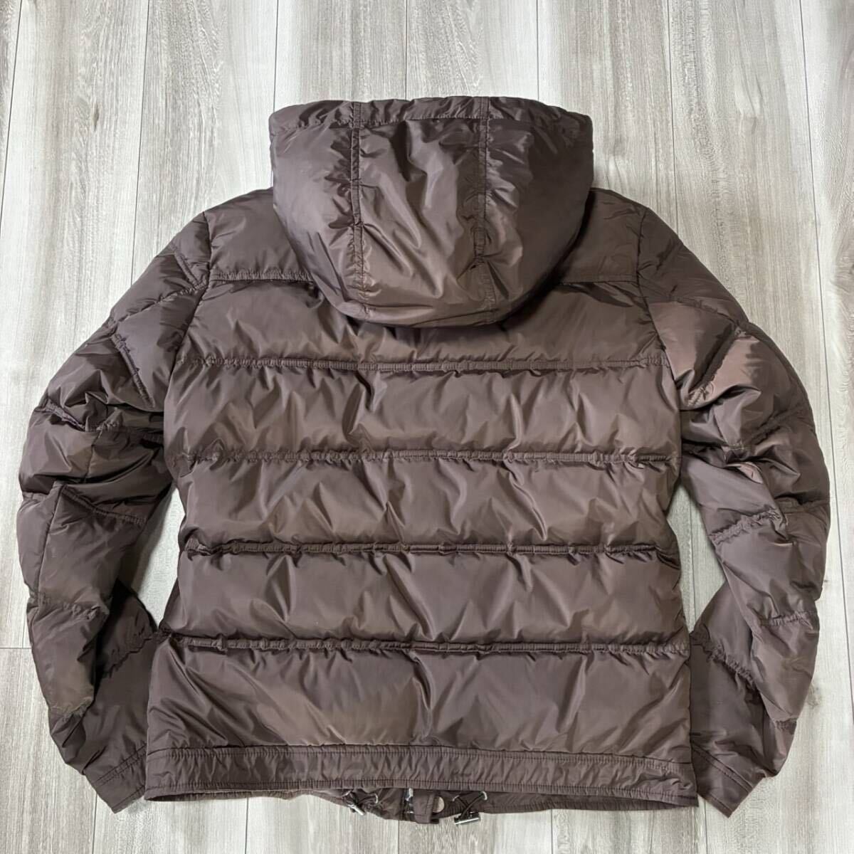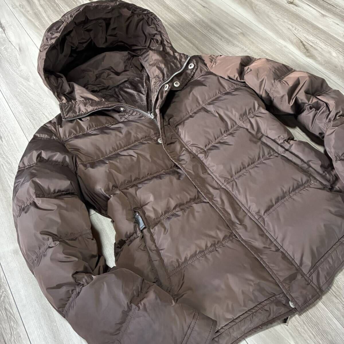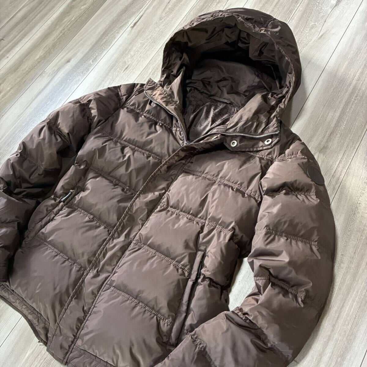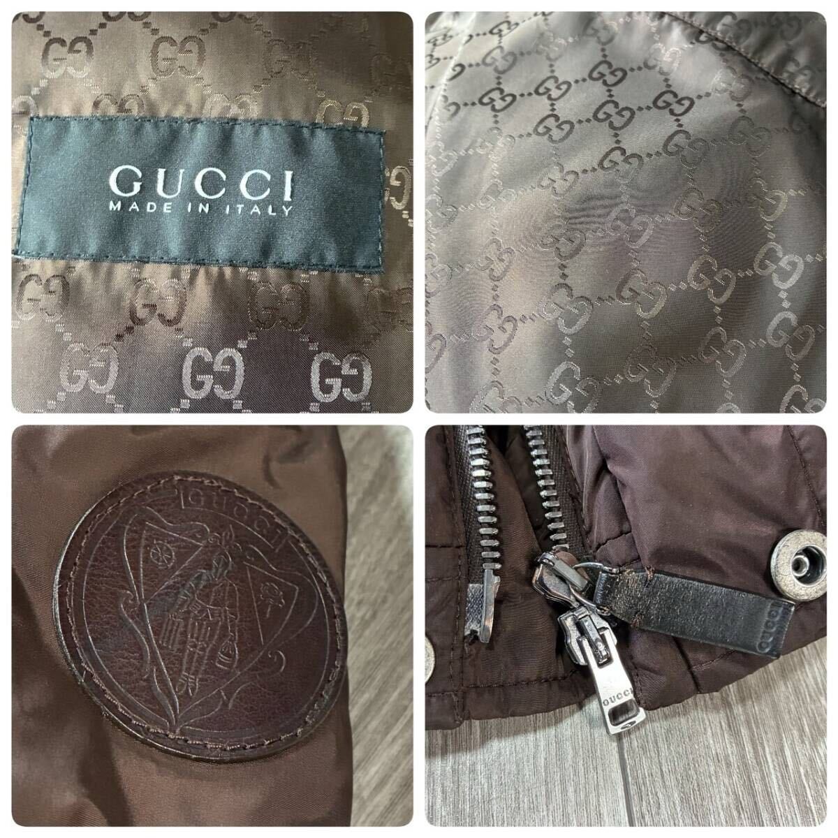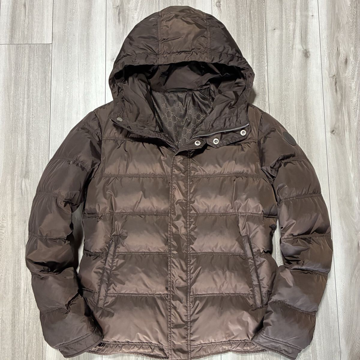 未使用級/L 『GUCCI グッチ』GG総柄 ダウンジャケット 48 エンブレム レザーワッペン 冬 近年モデル ダークブラウン アウター フード 極暖