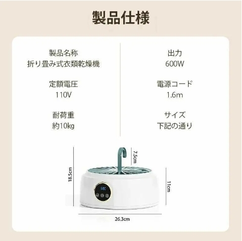 • 【折りたたみ式乾燥機】この乾燥機は折りたたむとわずか26.5*11cmのサイズで、重量は1.6kgと軽量です。このポータブル乾燥機のハンガーと折りたたみ式ホックはスーツケースやクローゼットに簡単に収納でき、軽量でいつでも移動可能です。小さなアパート、寮、RV、キャンプや旅行にも最適です。