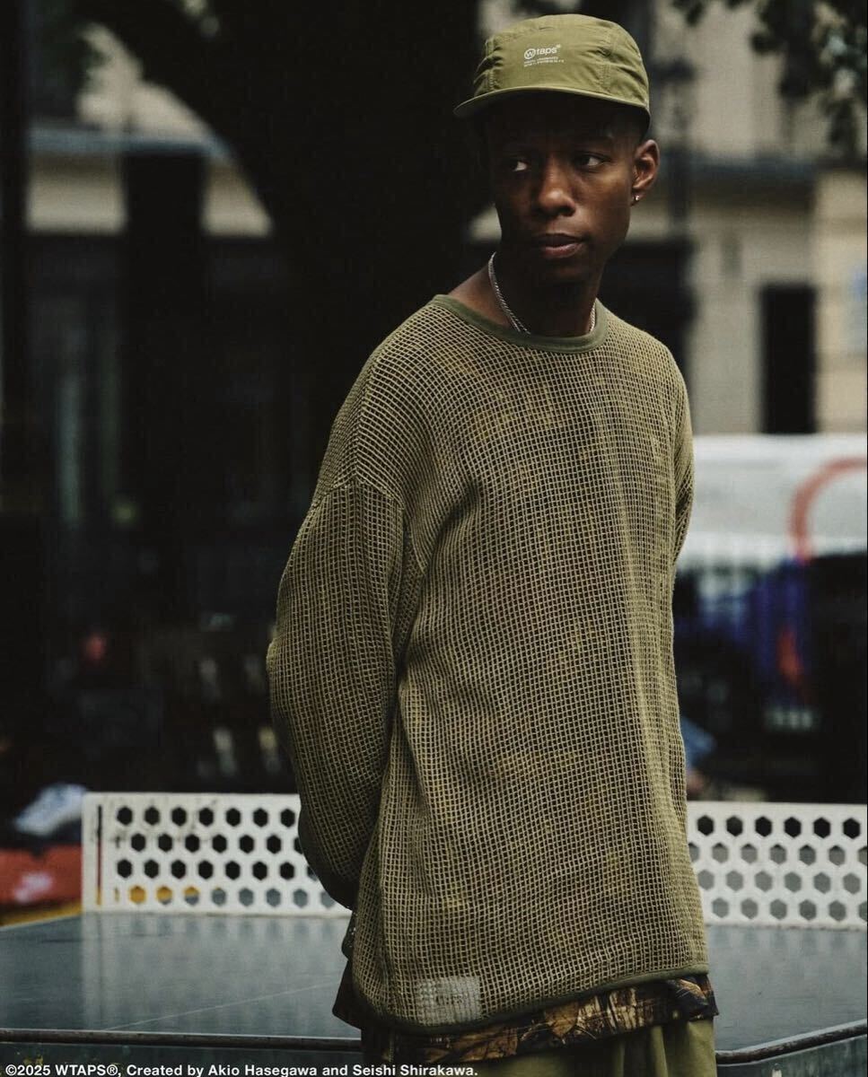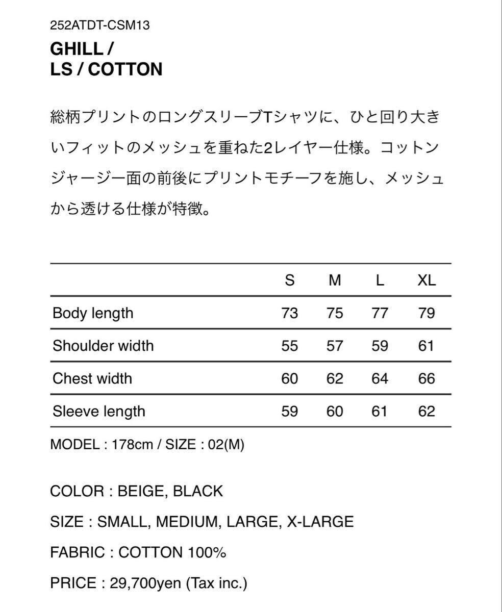 総柄プリントのロングスリーブTシャツに、ひと回り大きいフィットのメッシュを重ねた2レイヤー仕様。コットンジャージ一面の前後にプリントモチーフを施し、メッシュから透ける仕様が特徴。
