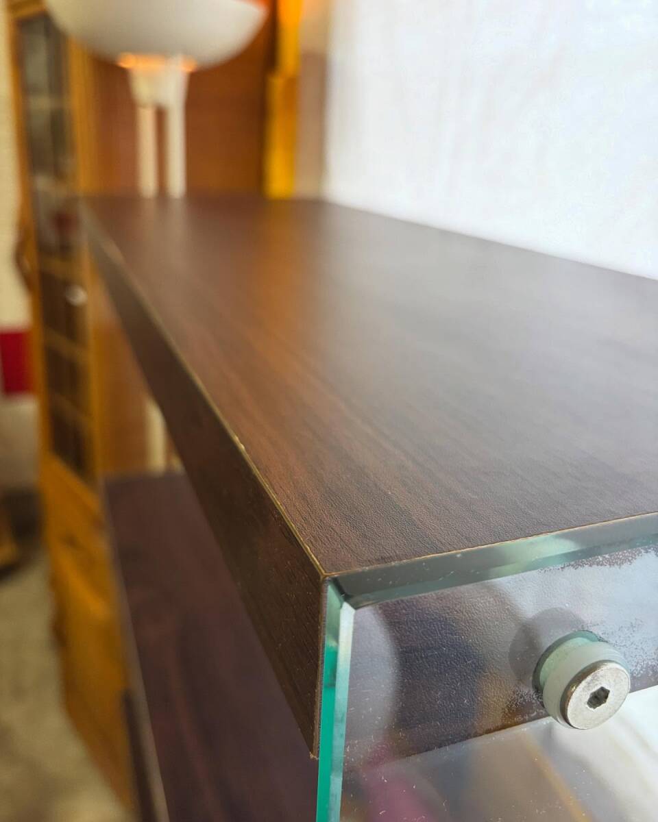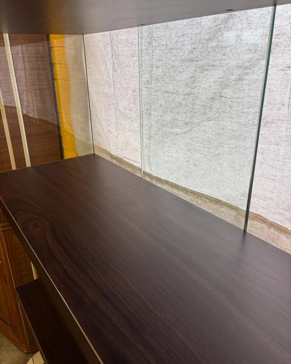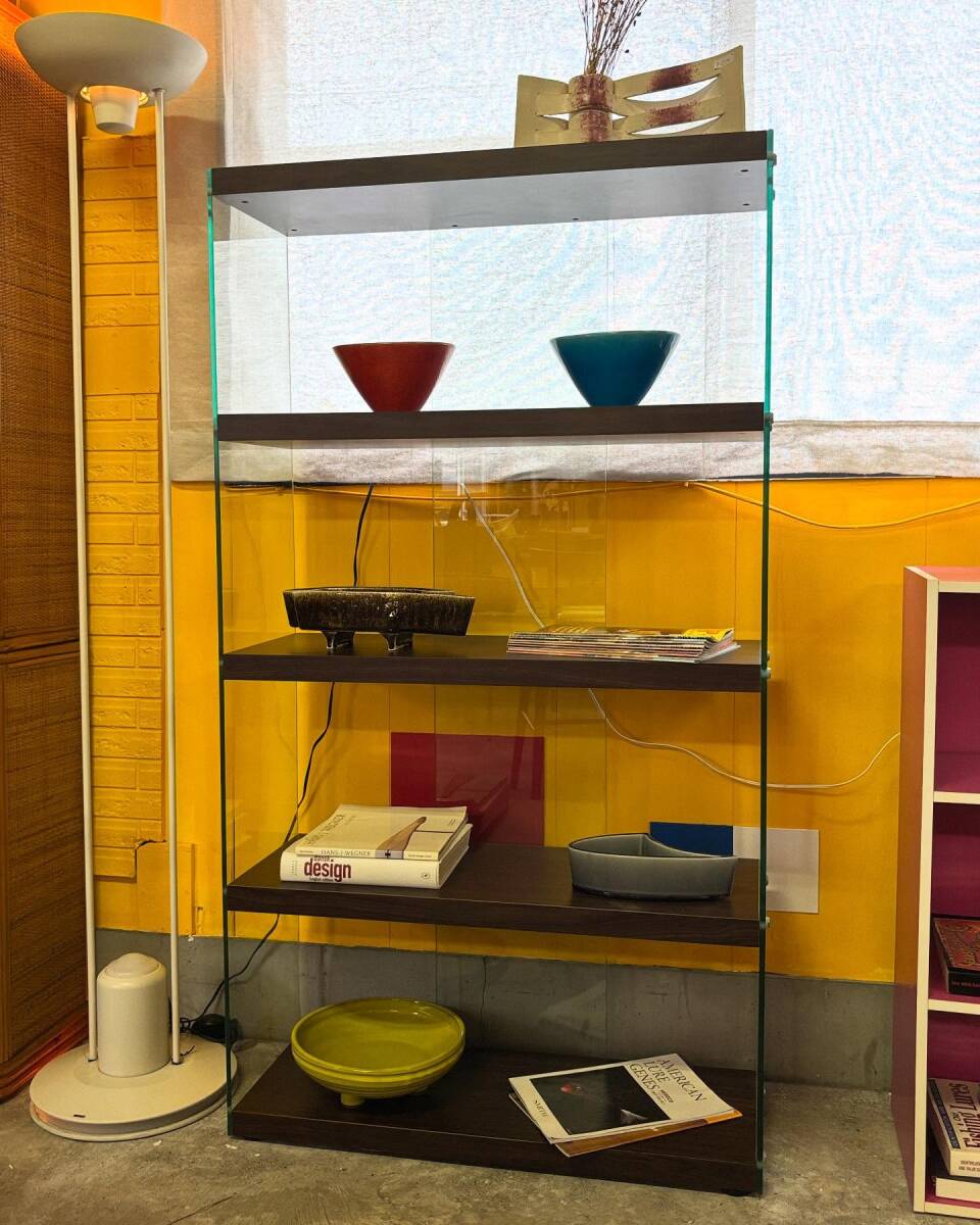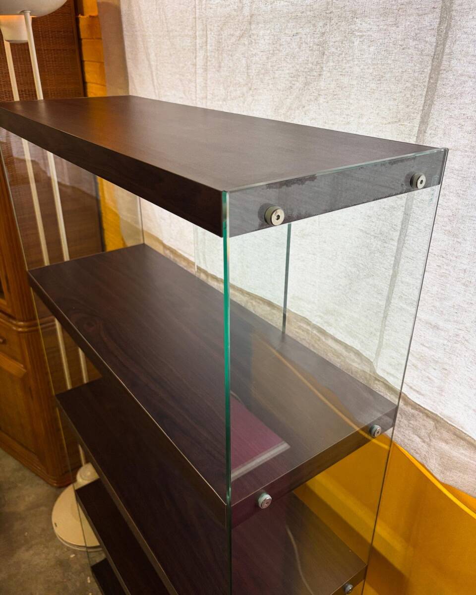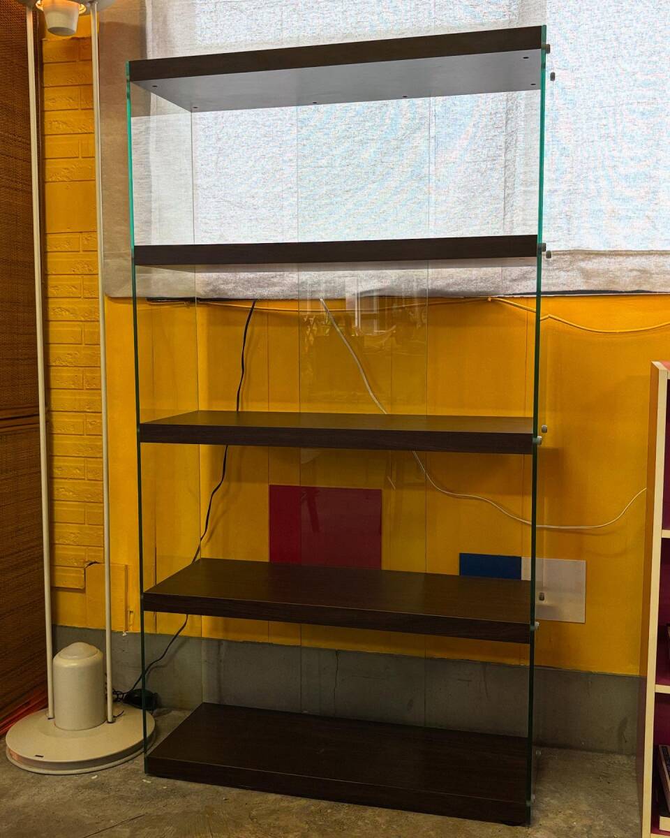 ガラスの側板と背面が軽やかな印象を与えるスタイリッシュなディスプレイラック。濃い木目の棚板が上質さを引き立て、モダンで洗練された空間にぴったりです。見せる収納としても活躍し、雑貨やアートブックのディスプレイにも最適。インテリアに透明感と奥行きを加える一台です。店舗什器としても◎