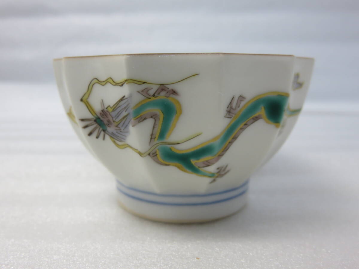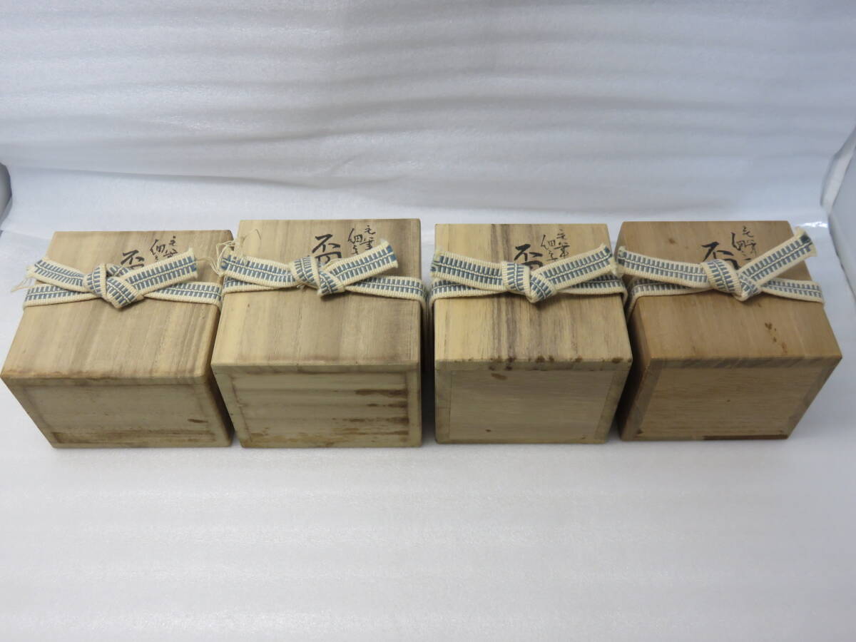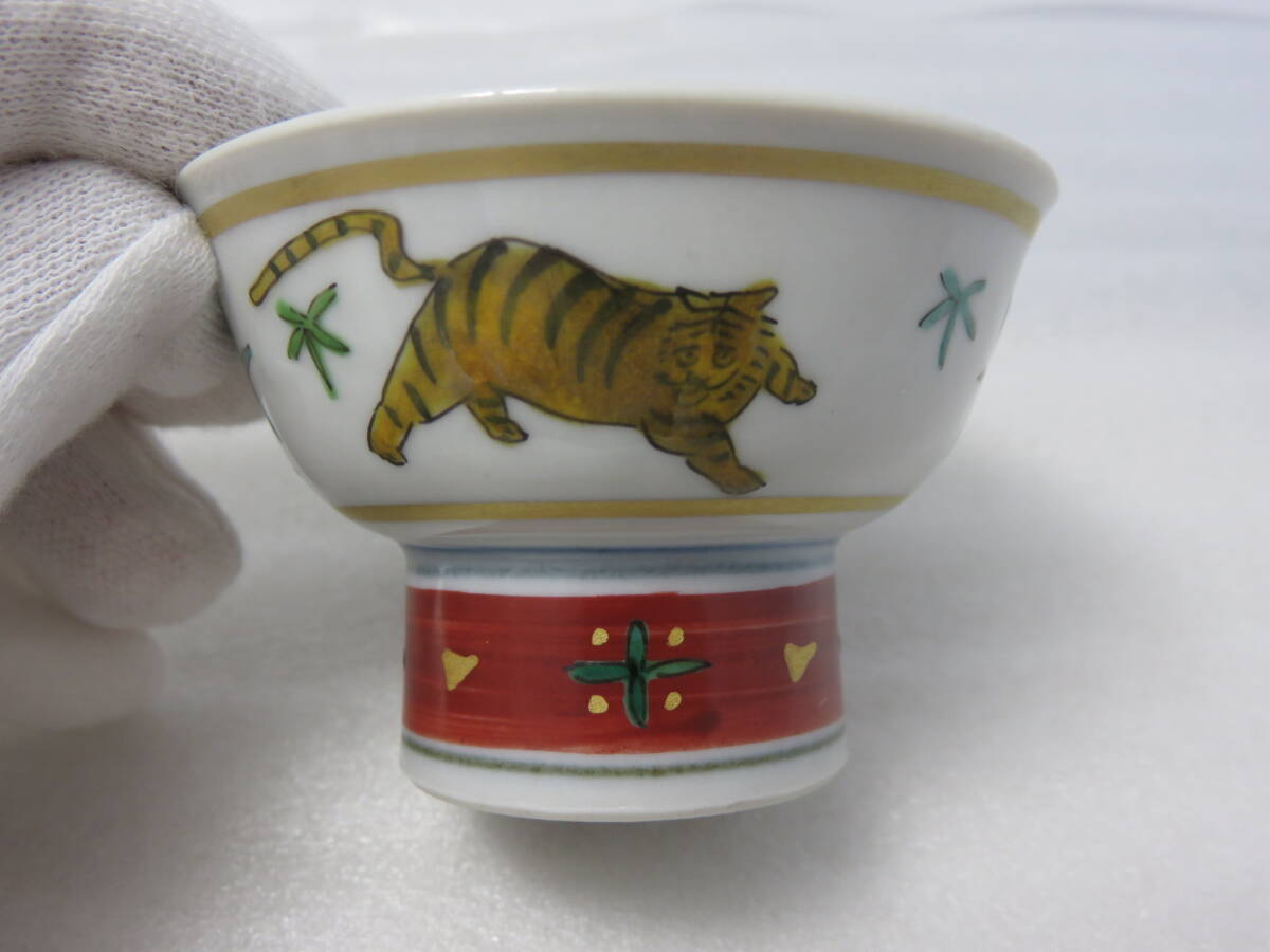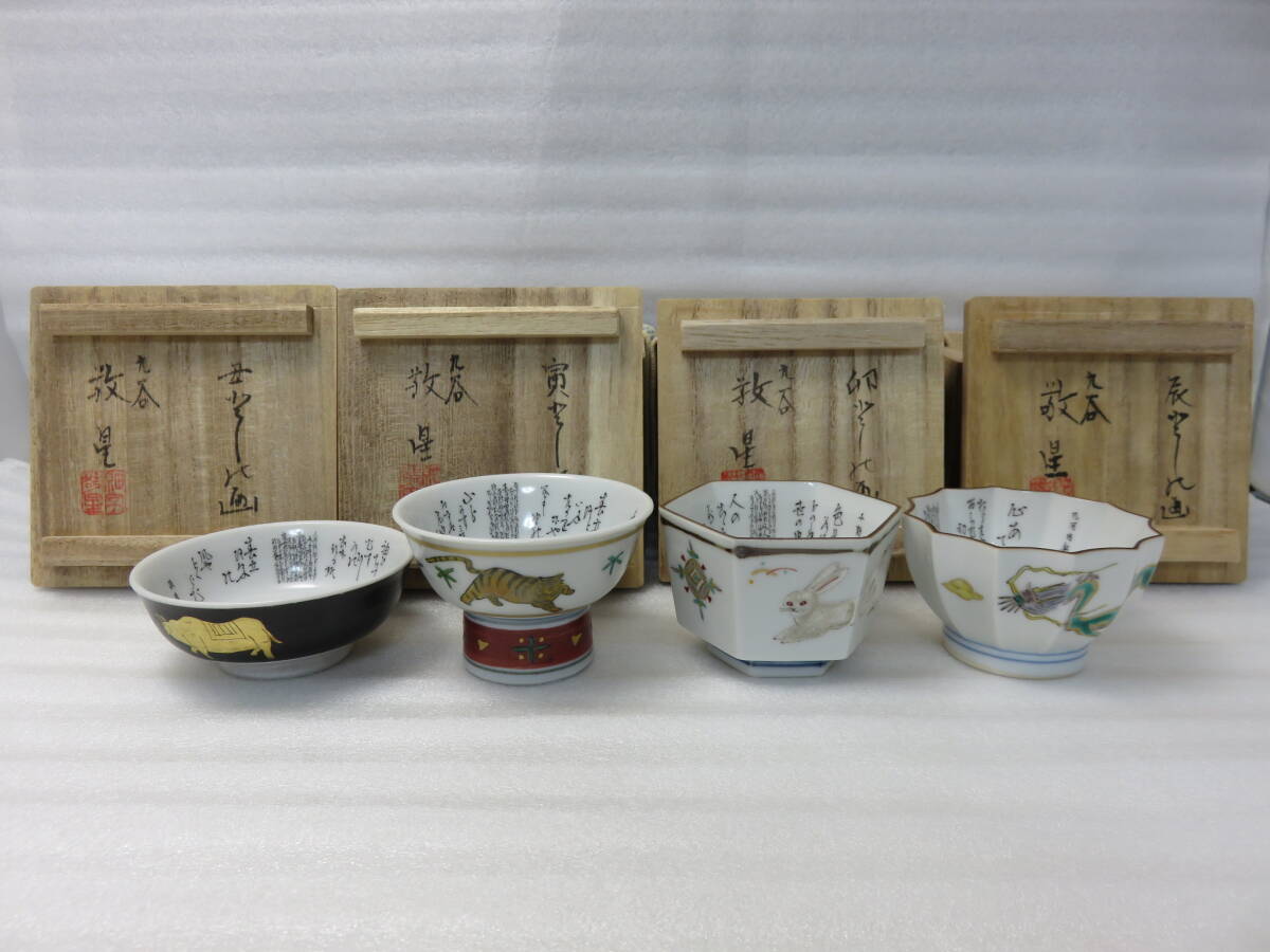 ■大骨董祭■九谷焼 田村敬星 毛筆細字 盃(ぐい呑み) おまとめ4点 丑(牛)/寅/卯(うさぎ)/辰(龍) 干支 陶歴・共布・共箱有 陶器 焼き物 作品
