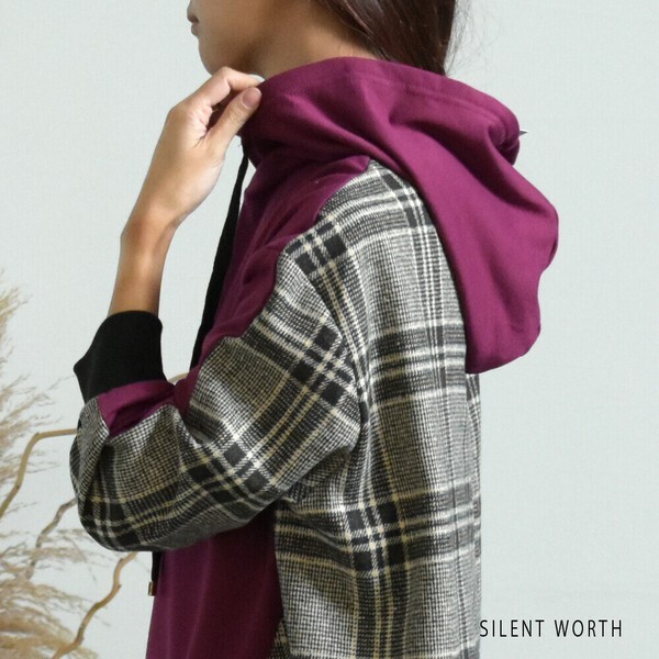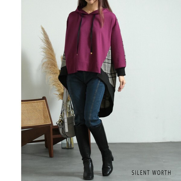 レディース パーカー チュニック ロング丈 チェック柄 異素材 秋冬 ゆったり M〜LL パープル系 体型カバー おしゃれ カジュアル フード付き