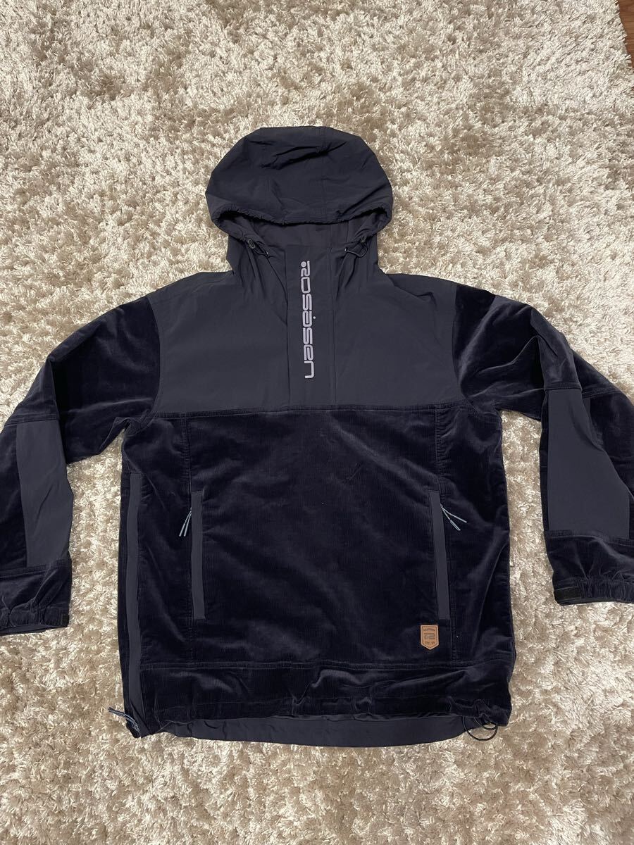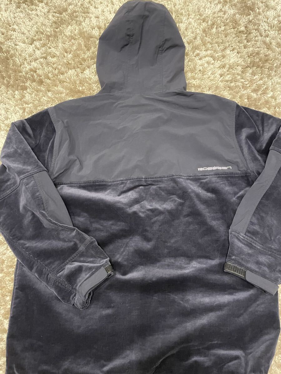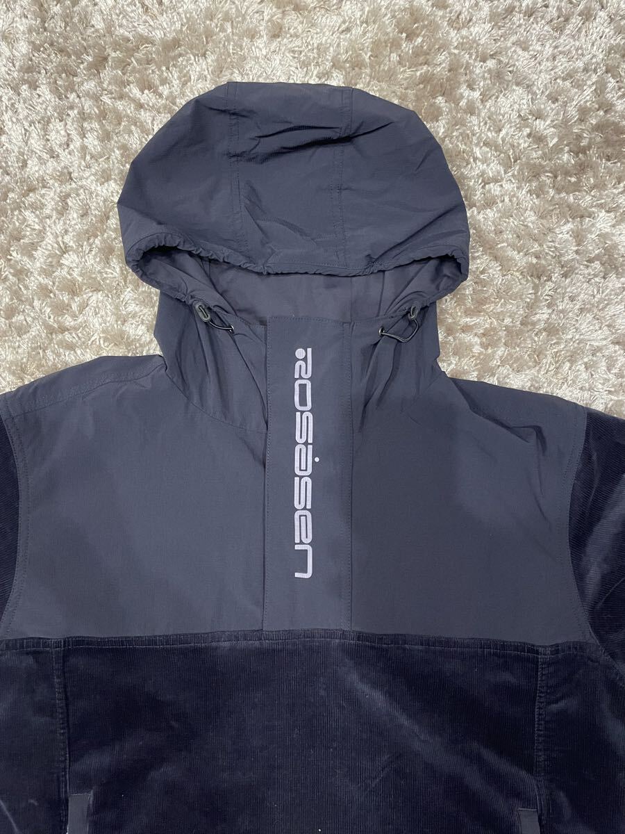 コーデュロイとナイロンのコンビネーションのフーディ、ロサーセンロゴ付き。