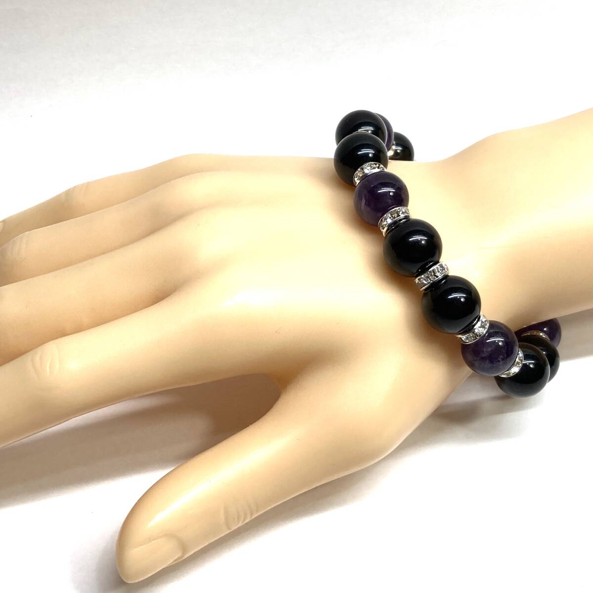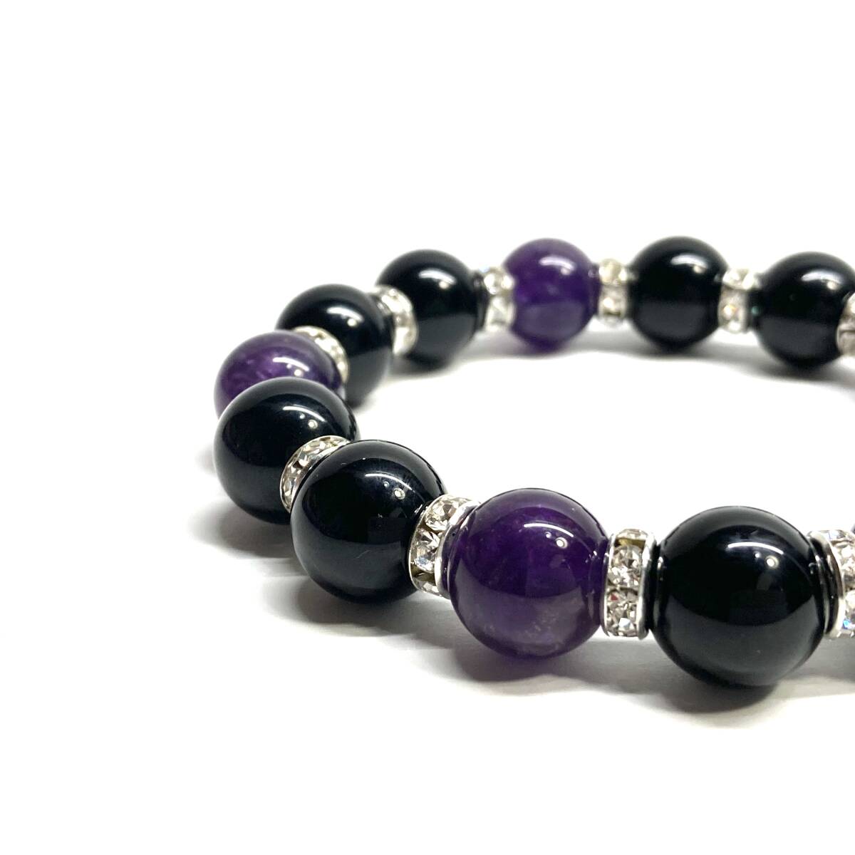 こちらは、モリオンとアメジストを組み合わせたパワーストーンブレスレットです。間にはロンデルを挟み高級感あるデザインに仕上げております。程よくインパクトがある12mm玉を使用して内周約18cmです。(サイズ変更の場合は取引ナビにてご連絡をお願いします。) 数に限りがございますので気になる方はお早めにどうぞ。