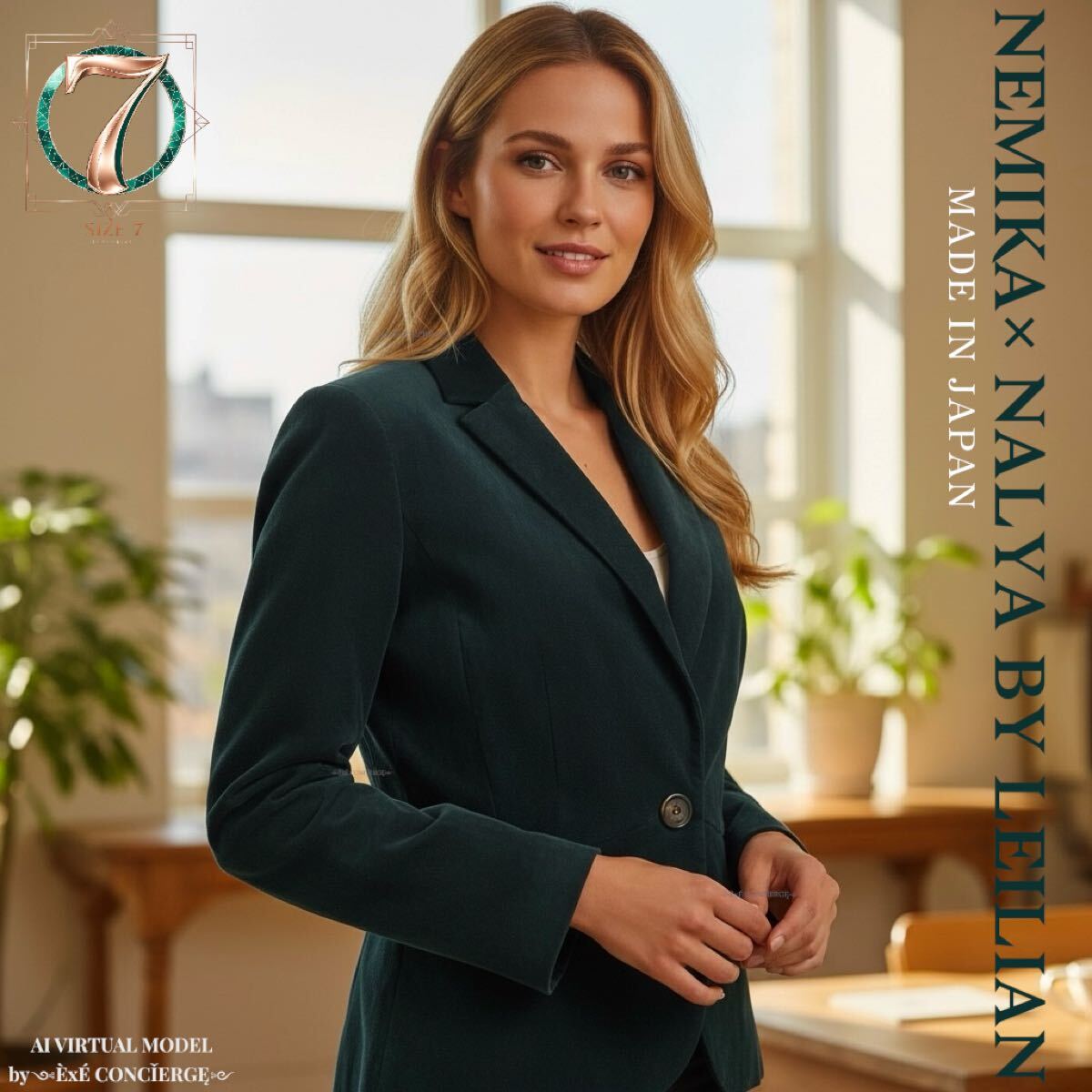 ネミカのシングルブレストテーラードジャケット。完売品。参考定価6万。イタリアファブリックメゾンNALYA社製のコットンベルベットを贅沢に。ストレッチ性を備えたしっかりとした生地感。ボディラインを美しく表現する考え抜かれたシルエット。磨き上げられた美しいコレクションは、上品で心地良く、エフォートレスな雰囲気に溢れています。カラーはダークグリーン。日本製。レリアン取扱い国内正規品。ノーベント。フロント1ボタン。