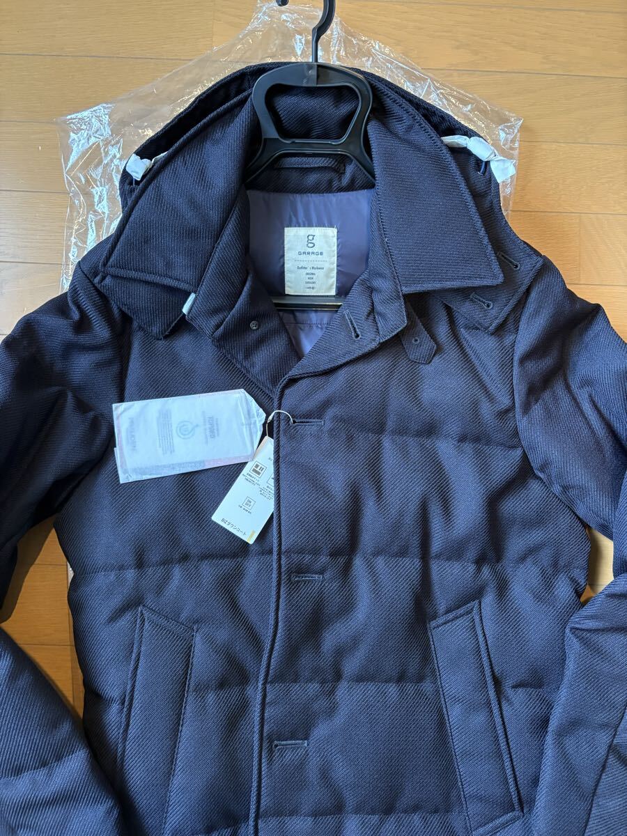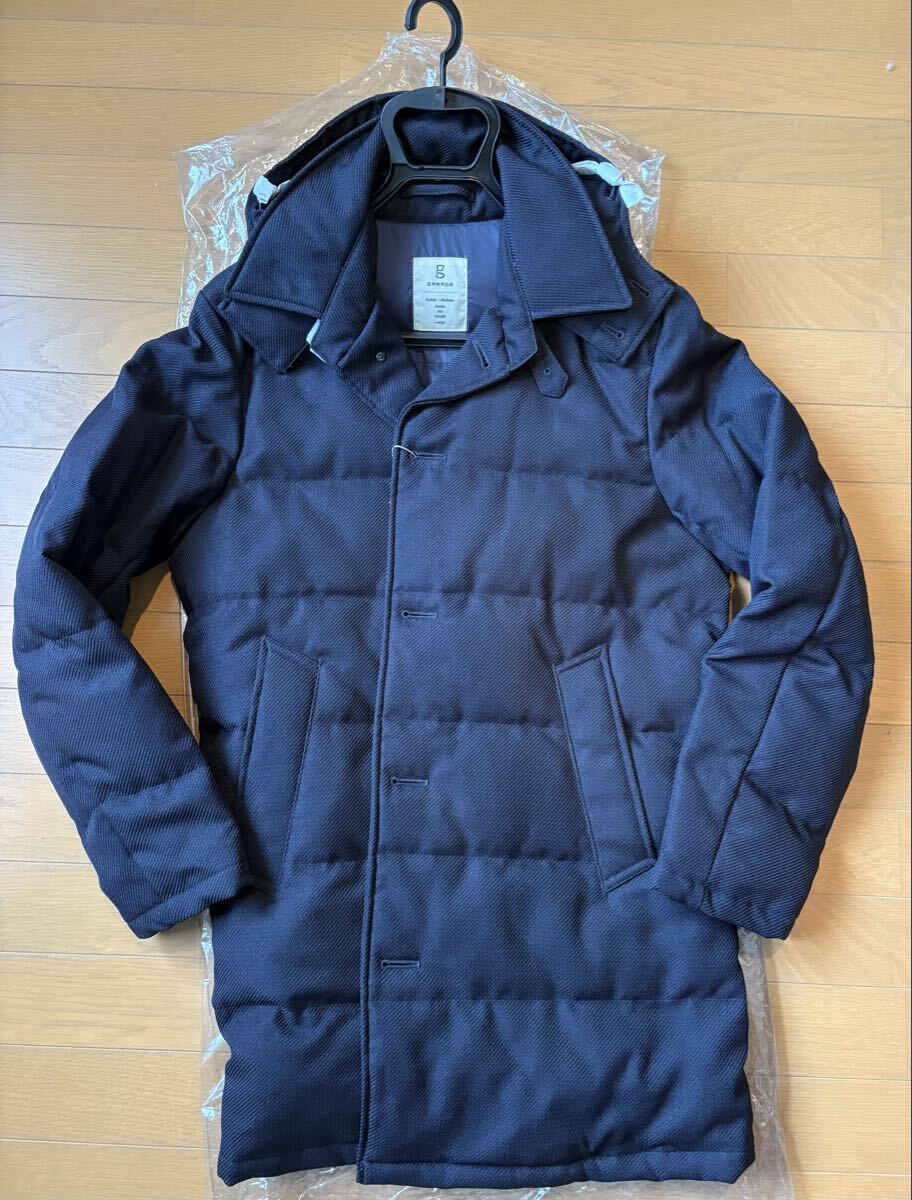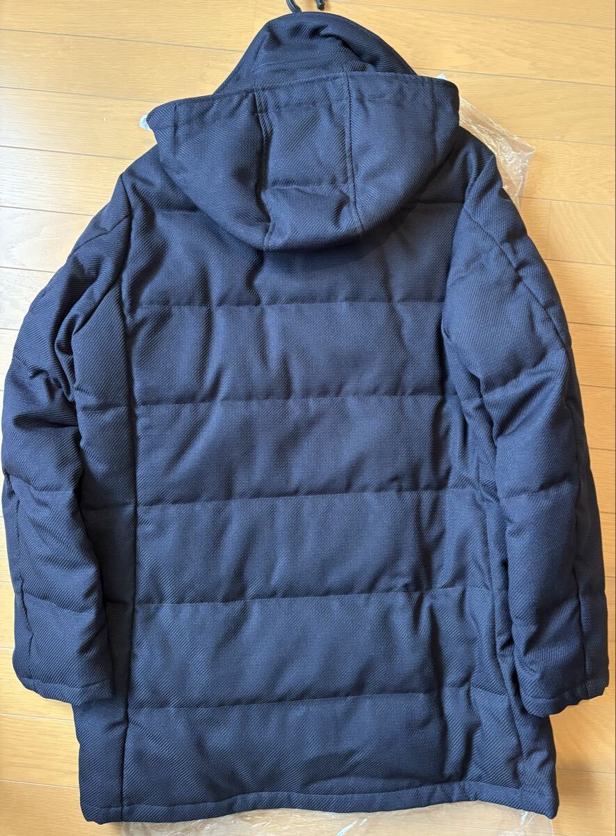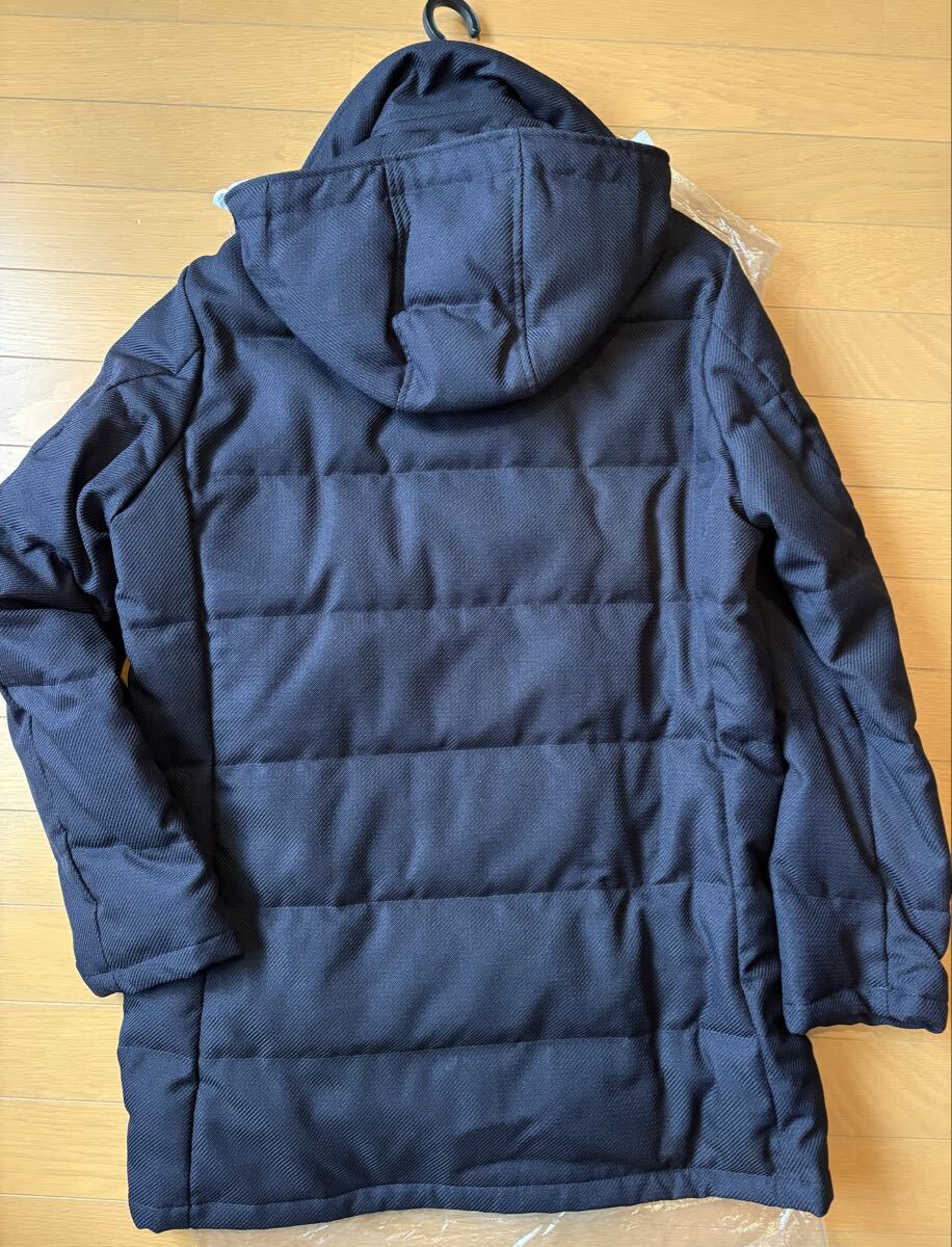 ネイビーのメンズダウンコートです。フード付きで、これからの季節に活躍する一着です。画像を見る限り、使用感はほとんどなく、非常にきれいな状態です。