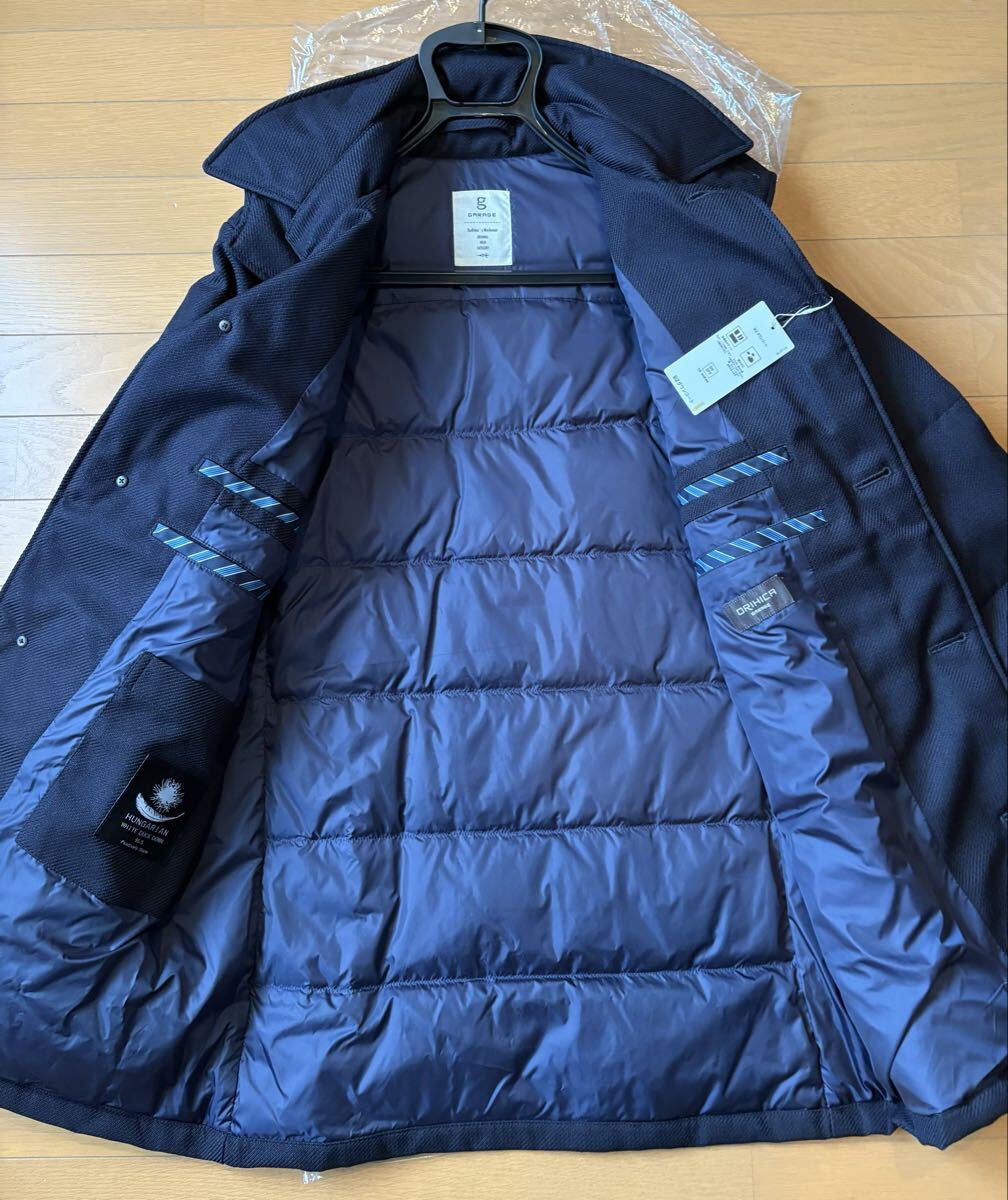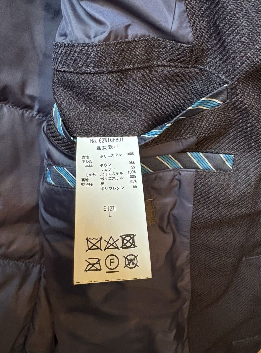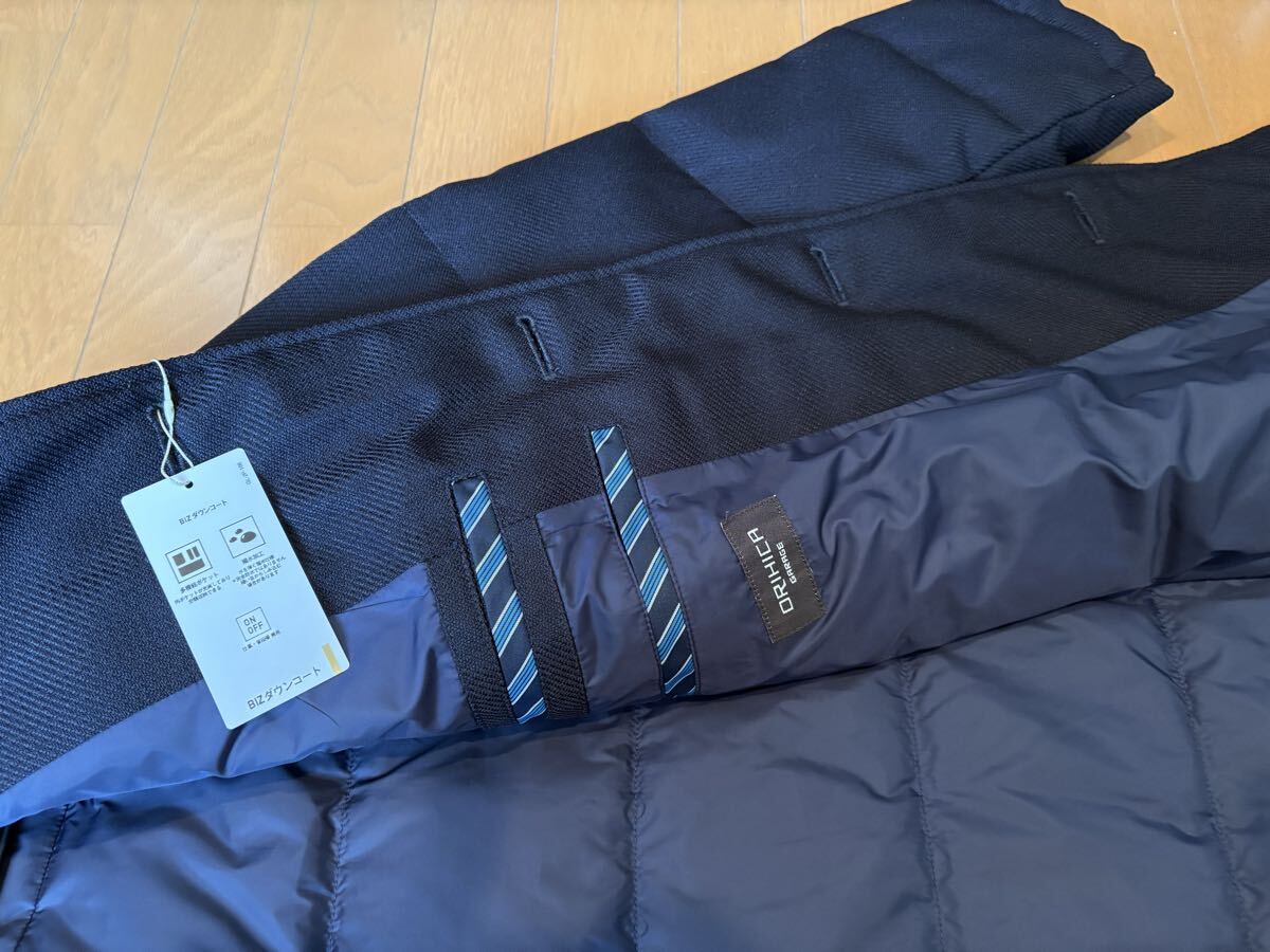 ネイビーのメンズダウンコートです。フード付きで、これからの季節に活躍する一着です。画像を見る限り、使用感はほとんどなく、非常にきれいな状態です。
