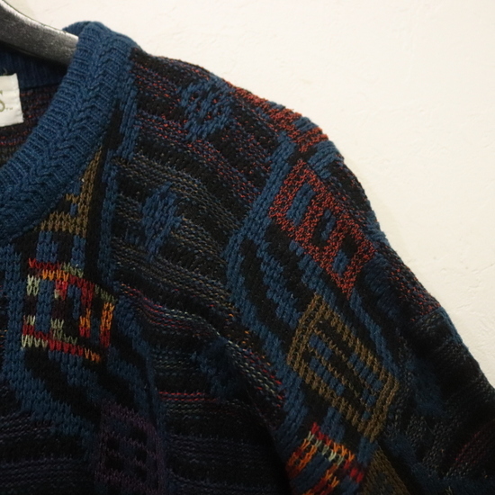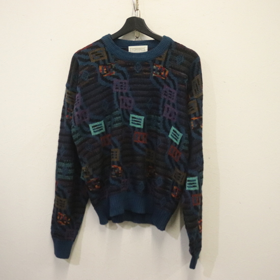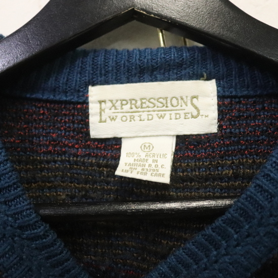 a982 80sビンテージ EXPRESSIONS WORLDWIDE アクリルニットセーター■1980年代製 表記Mサイズ ブルー マルチカラー 柄 アメカジ