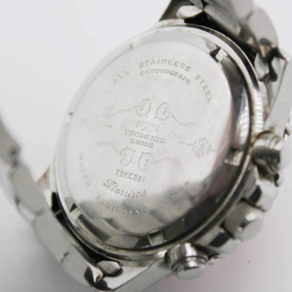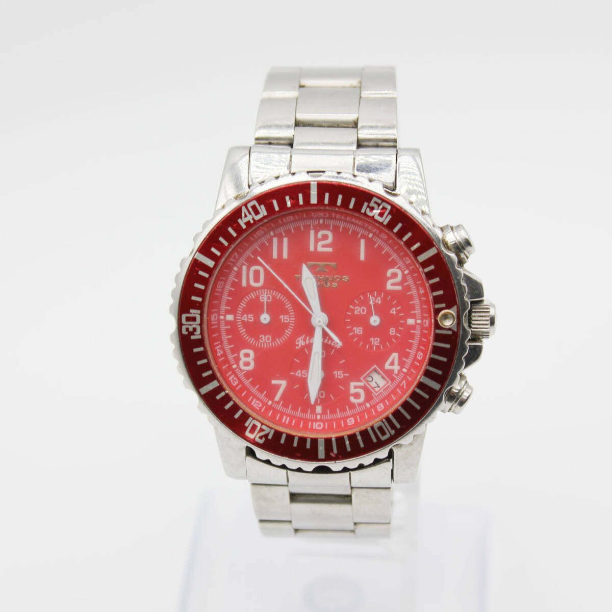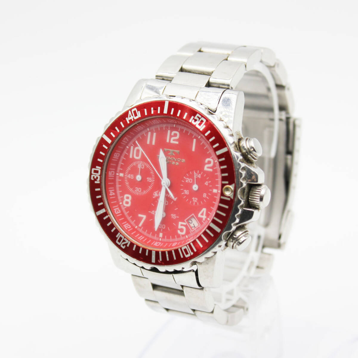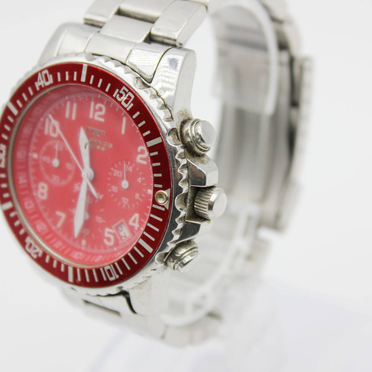 W251127-16 TECHNOS SWISS テクノス TBKC851 メンズ腕時計 クォーツ クロノグラフ デイト ジャンク 文字盤レッド 赤 シルバー ラウンド