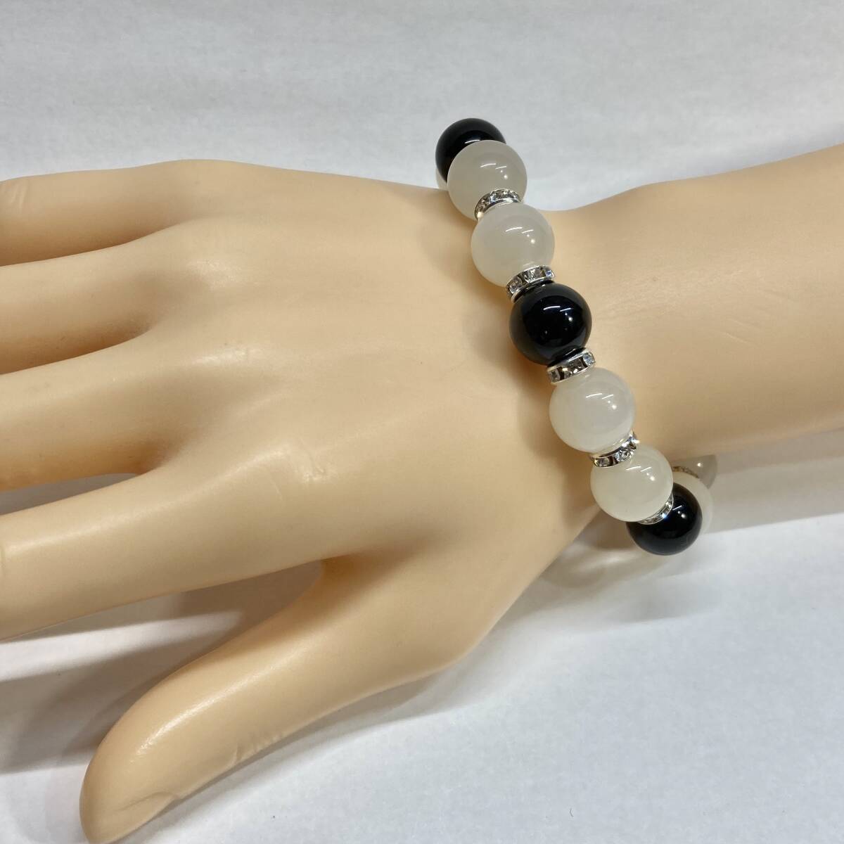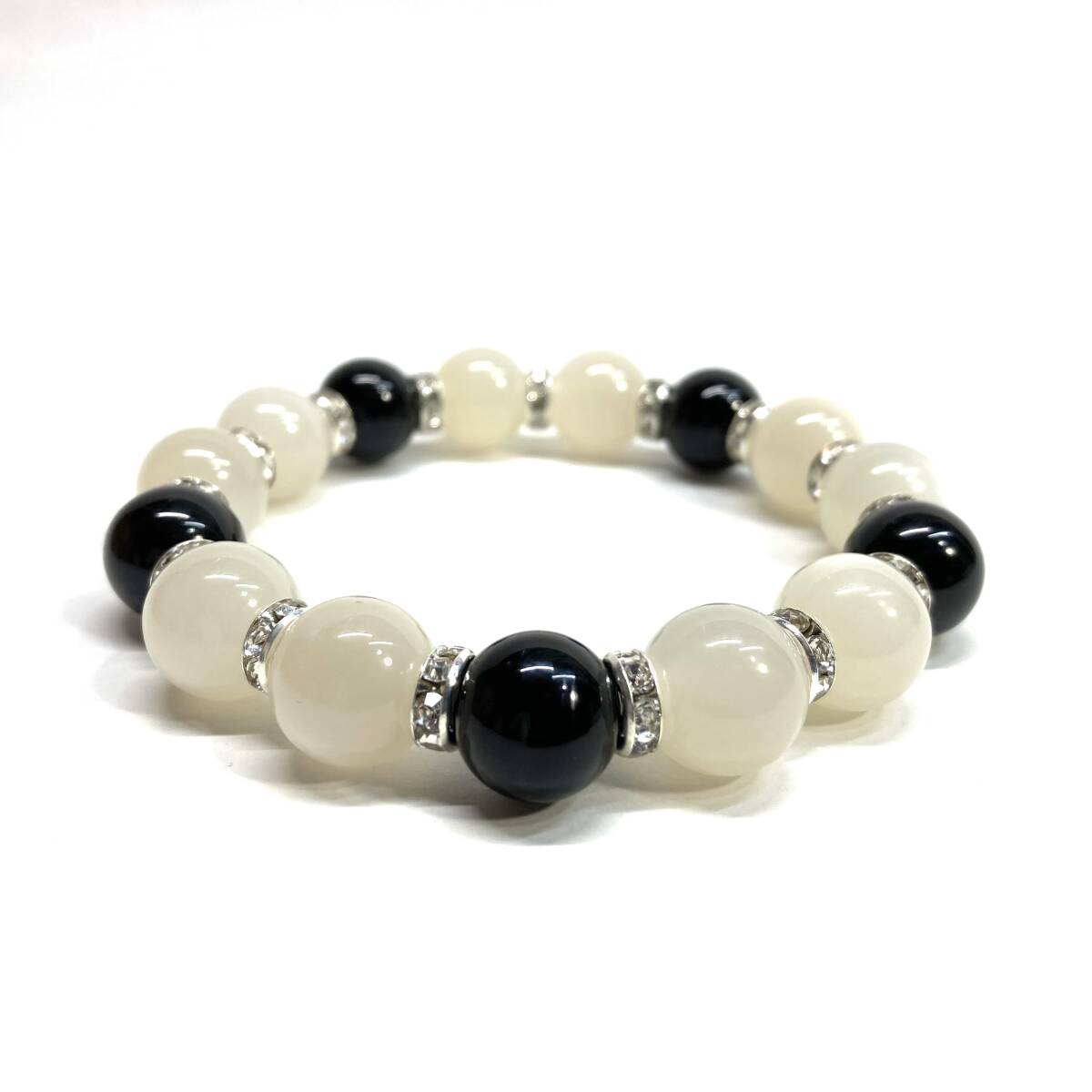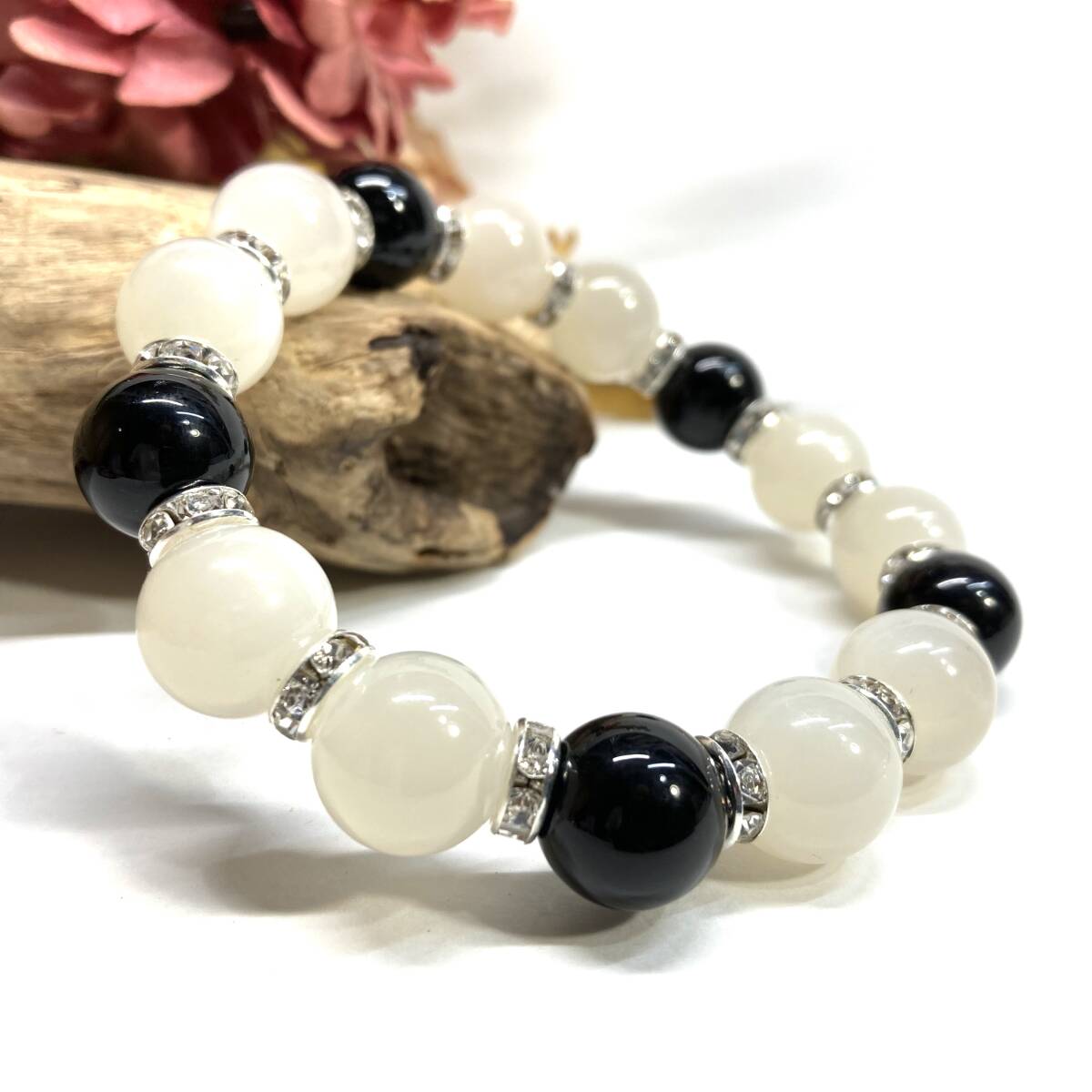 こちらは、12mm玉のムーンストーンとオニキスを組み合わせたパワーストーンブレスレットです。間にはロンデルを挟み高級感あるデザインに仕上げております。石大きさは12mm玉を使用して内径約18cmです。気になる方は是非この機会にどうぞ。