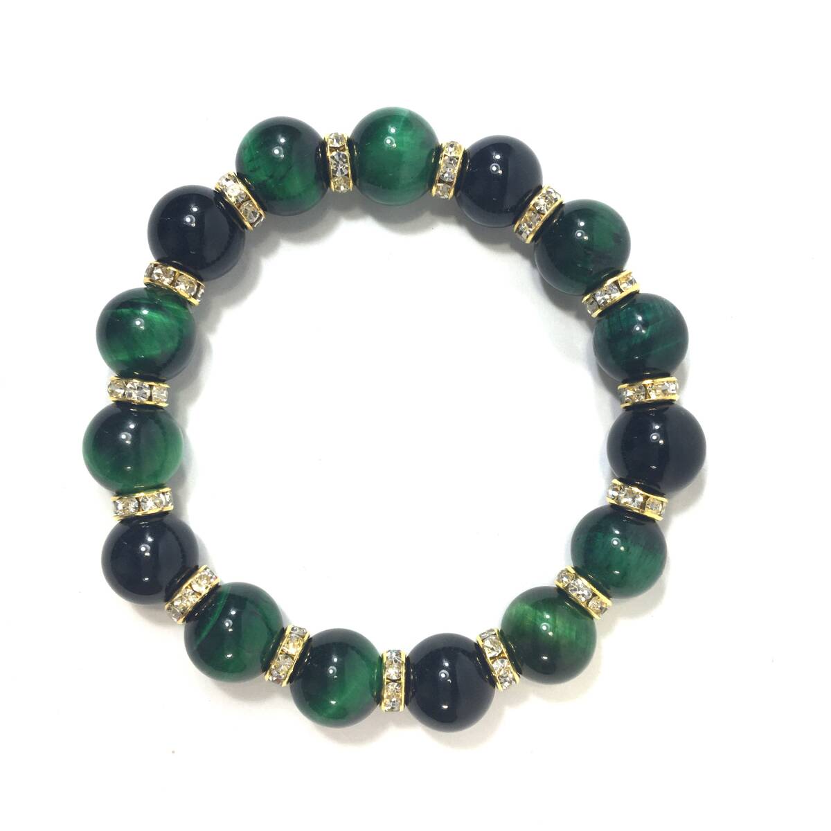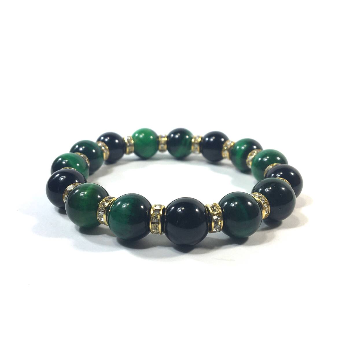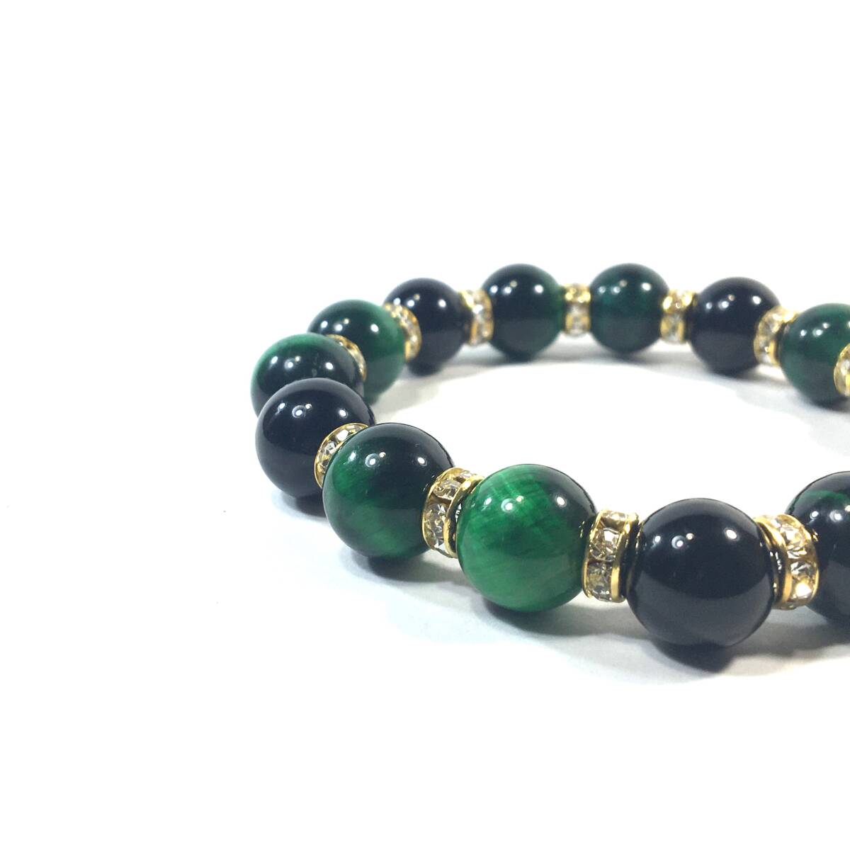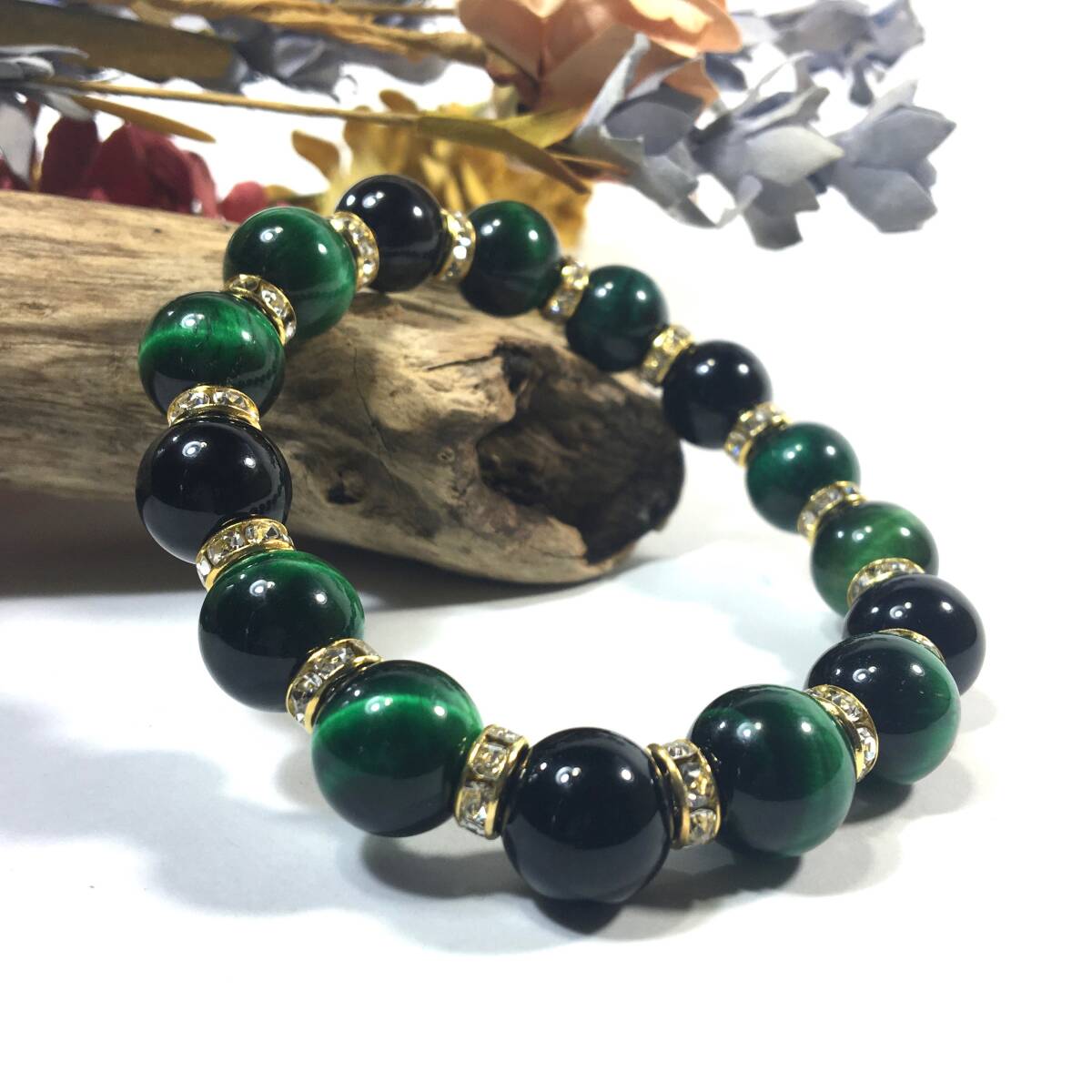 こちらは、グリーンタイガーアイとオニキスを組み合わせたパワーストーンブレスレットです。間にはロンデルを挟み高級感あるデザインに仕上げております。石大きさは12mm玉を使用して内径約18cmです。気になる方は是非この機会にどうぞ。