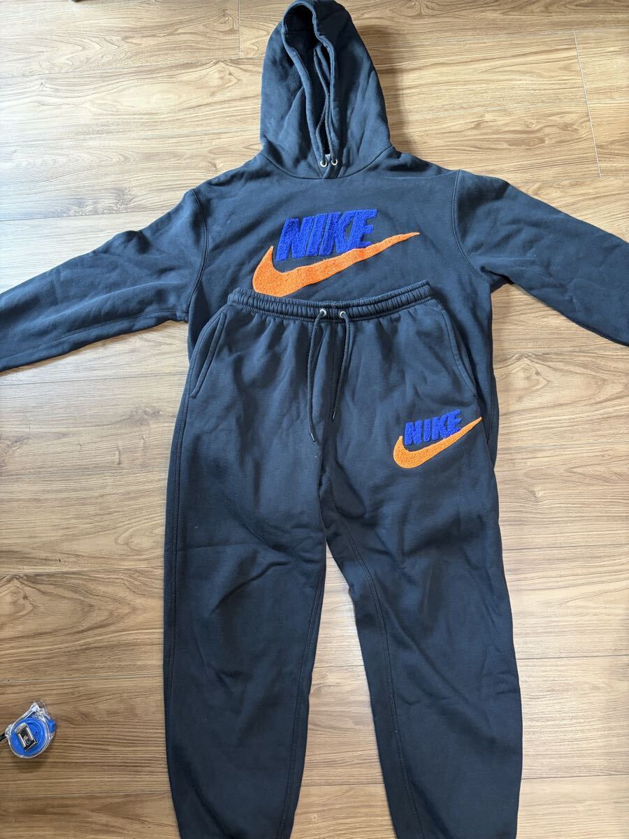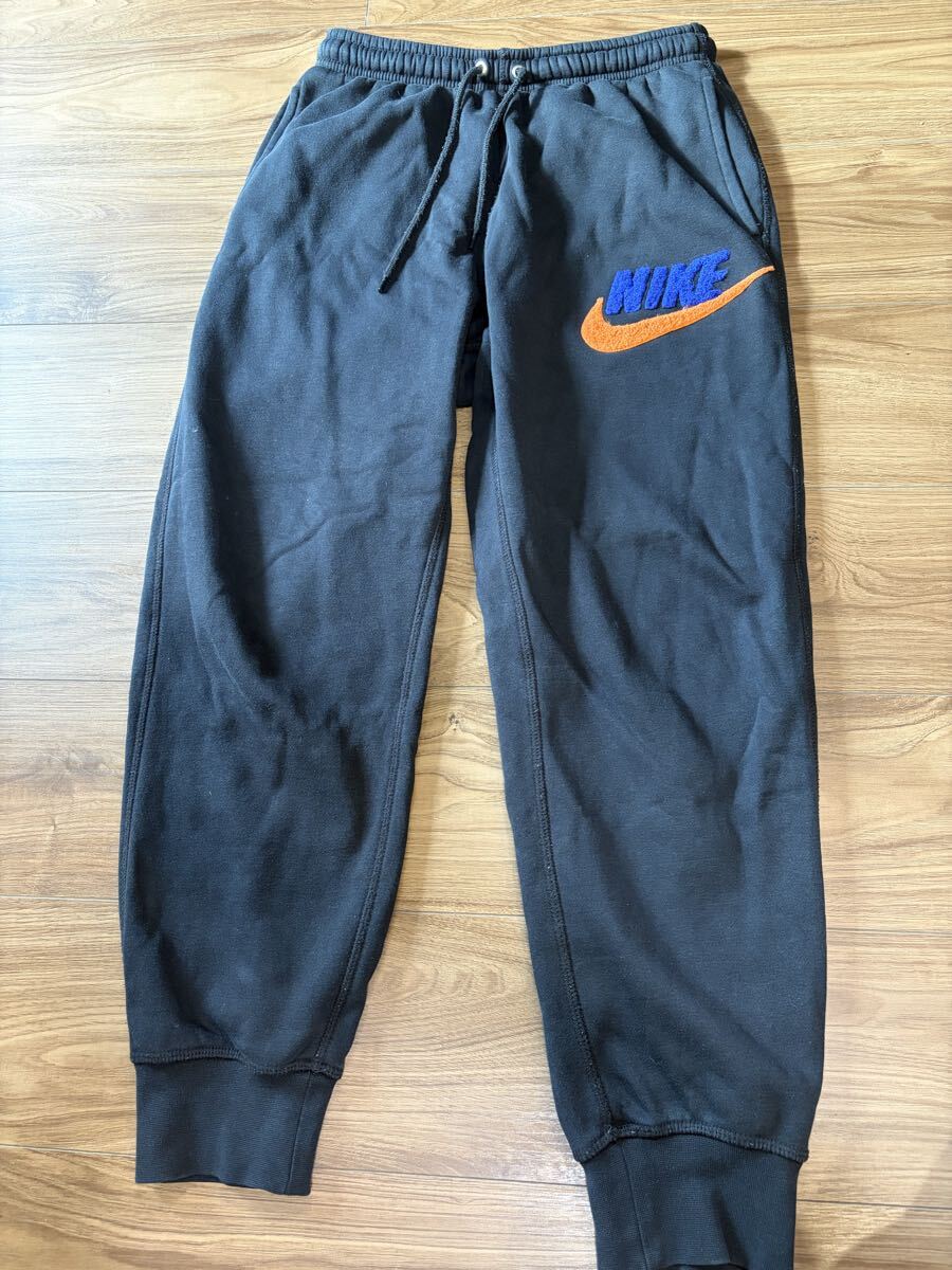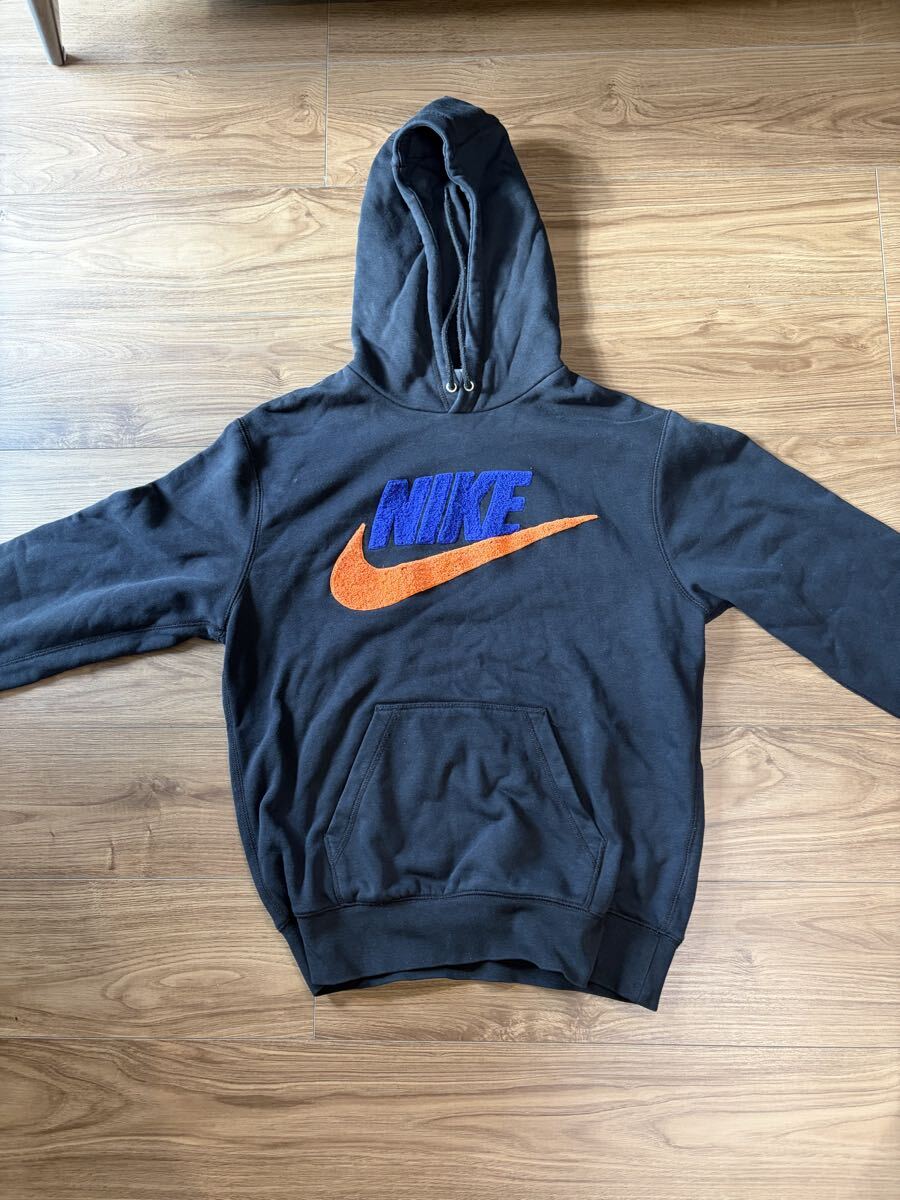 ブラック地にブルーの「NIKE」ロゴとオレンジのスウッシュが映える、存在感のあるデザインです。