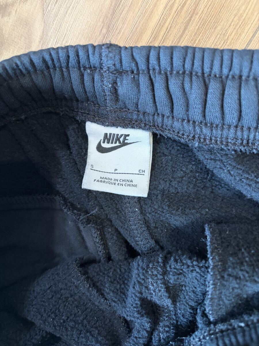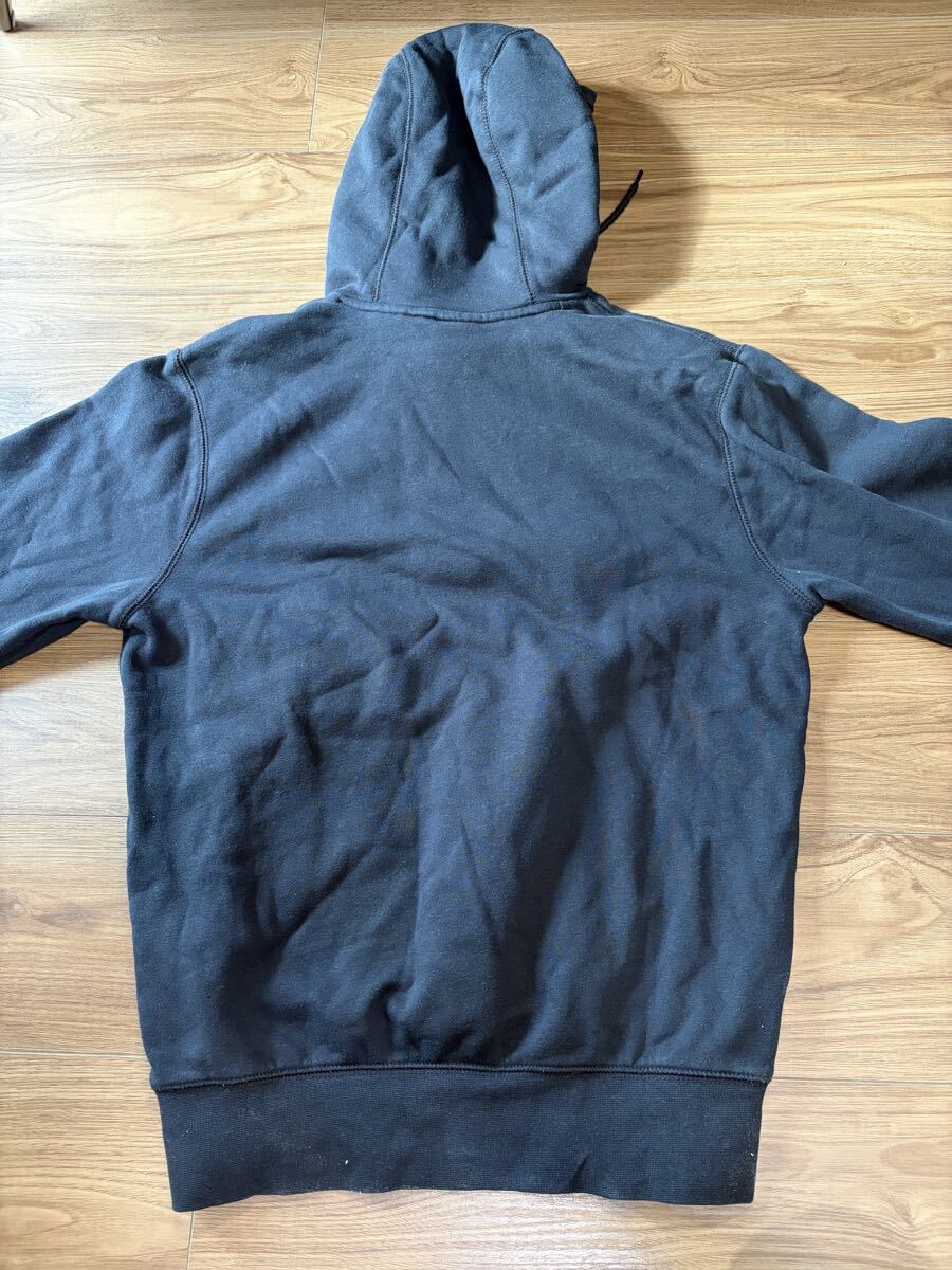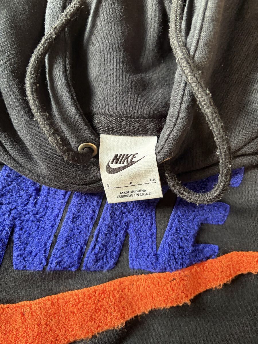 ブラック地にブルーの「NIKE」ロゴとオレンジのスウッシュが映える、存在感のあるデザインです。