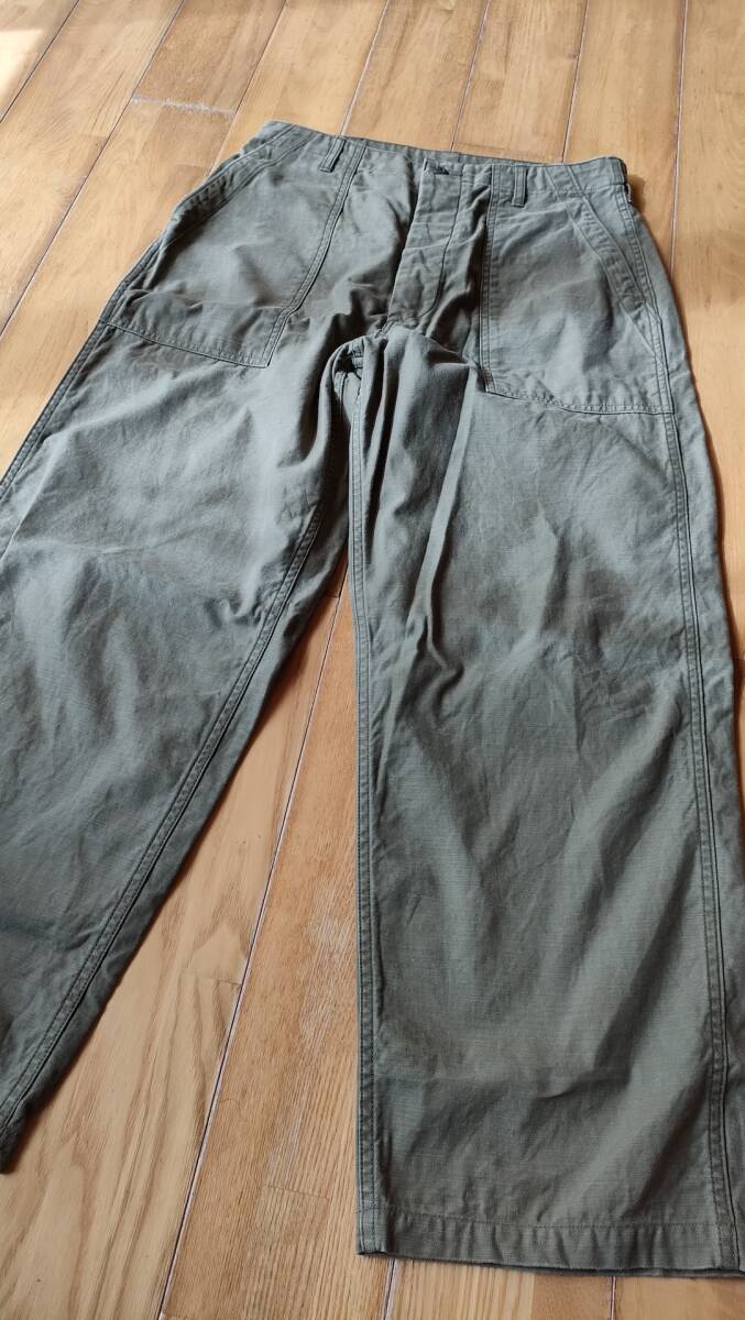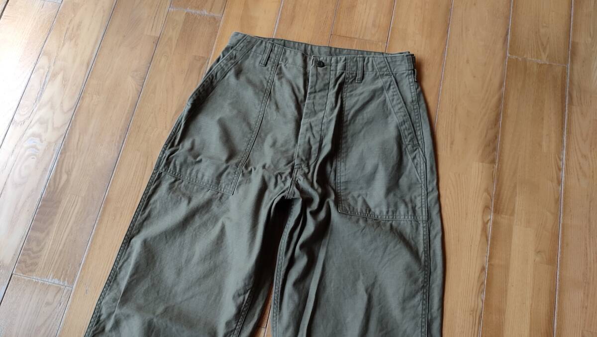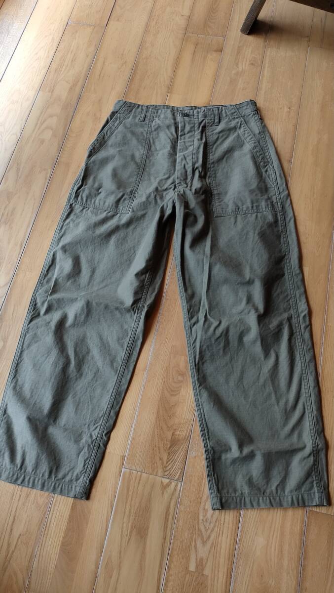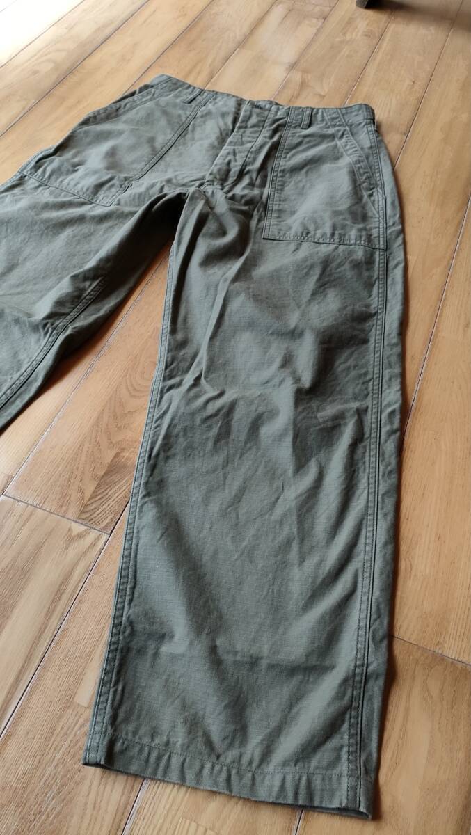 TCBベイカーズパンツ。中古古着。まだカーキ色は色濃くは残っております。裾を短めにしてカッコよく着用してました。若干の着用感はあります。