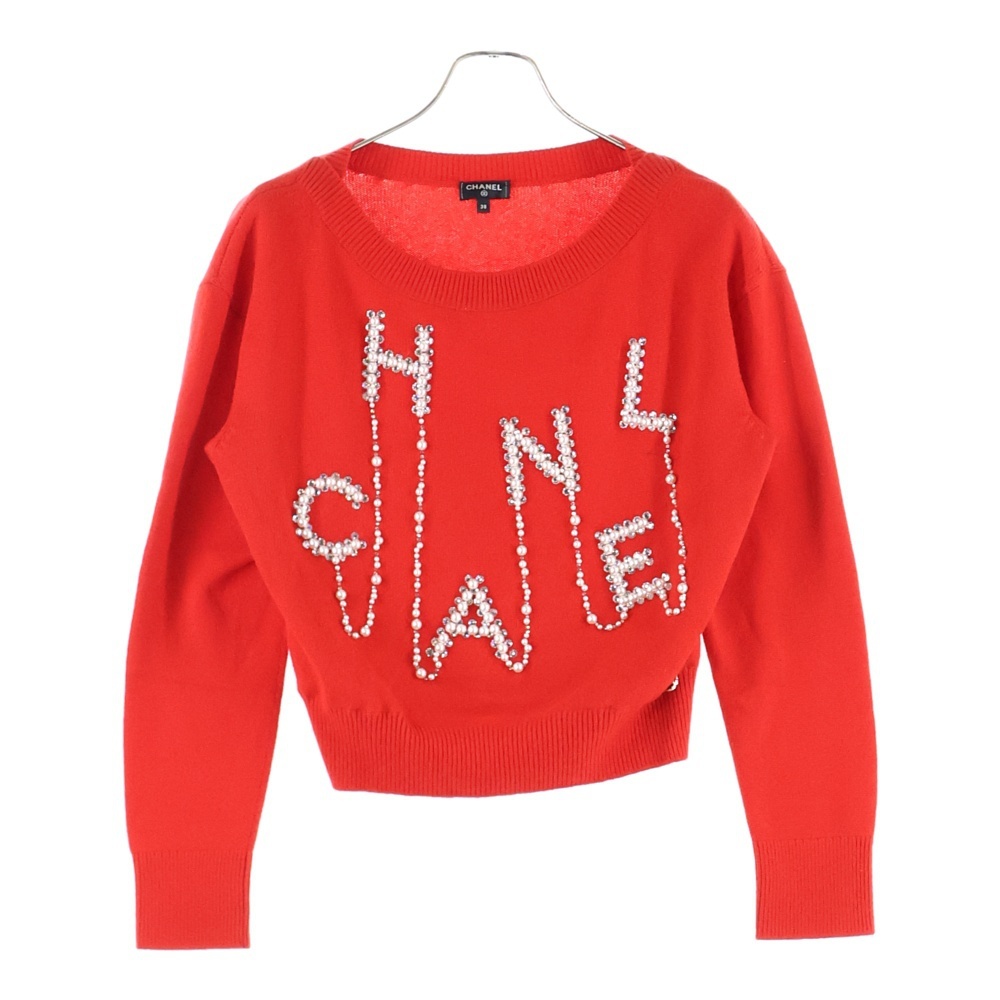 CHANEL シャネル ココマーク パール ビジュー ロゴ刺繍 カシミヤ プルオーバー 長袖 ニット セーター レッド レディース P70834K10086