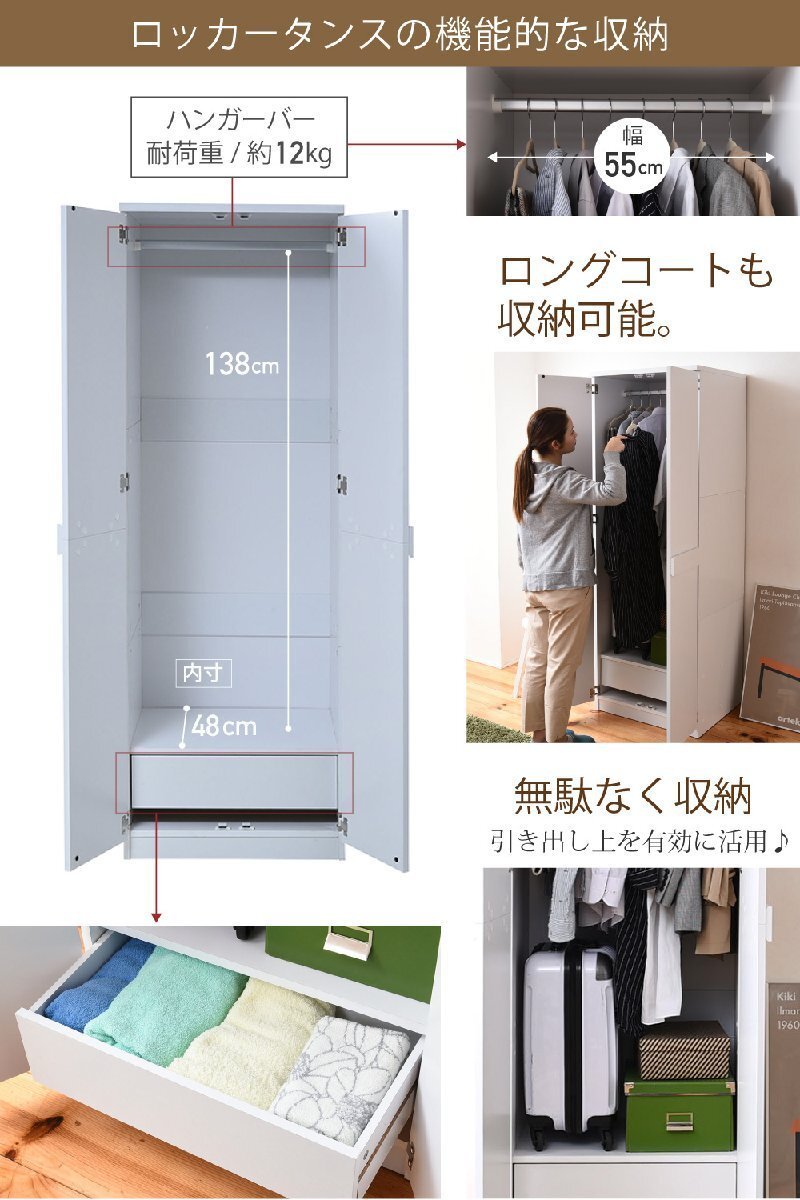 | ■商品説明 丈の長いコートもジャケットやシャツも掛けられるワードローブ。引き出しが付いているので、下着や靴下、タオルなどもまとめて片づけられます。 |
