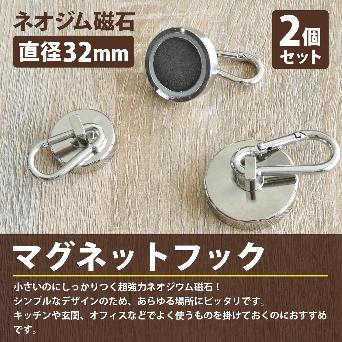 『2個set 直径32mm』カラビナ マグネットフック 超強力 マグネット ネオジム 磁石 フック 防錆 ステンレス製 耐荷重42KG