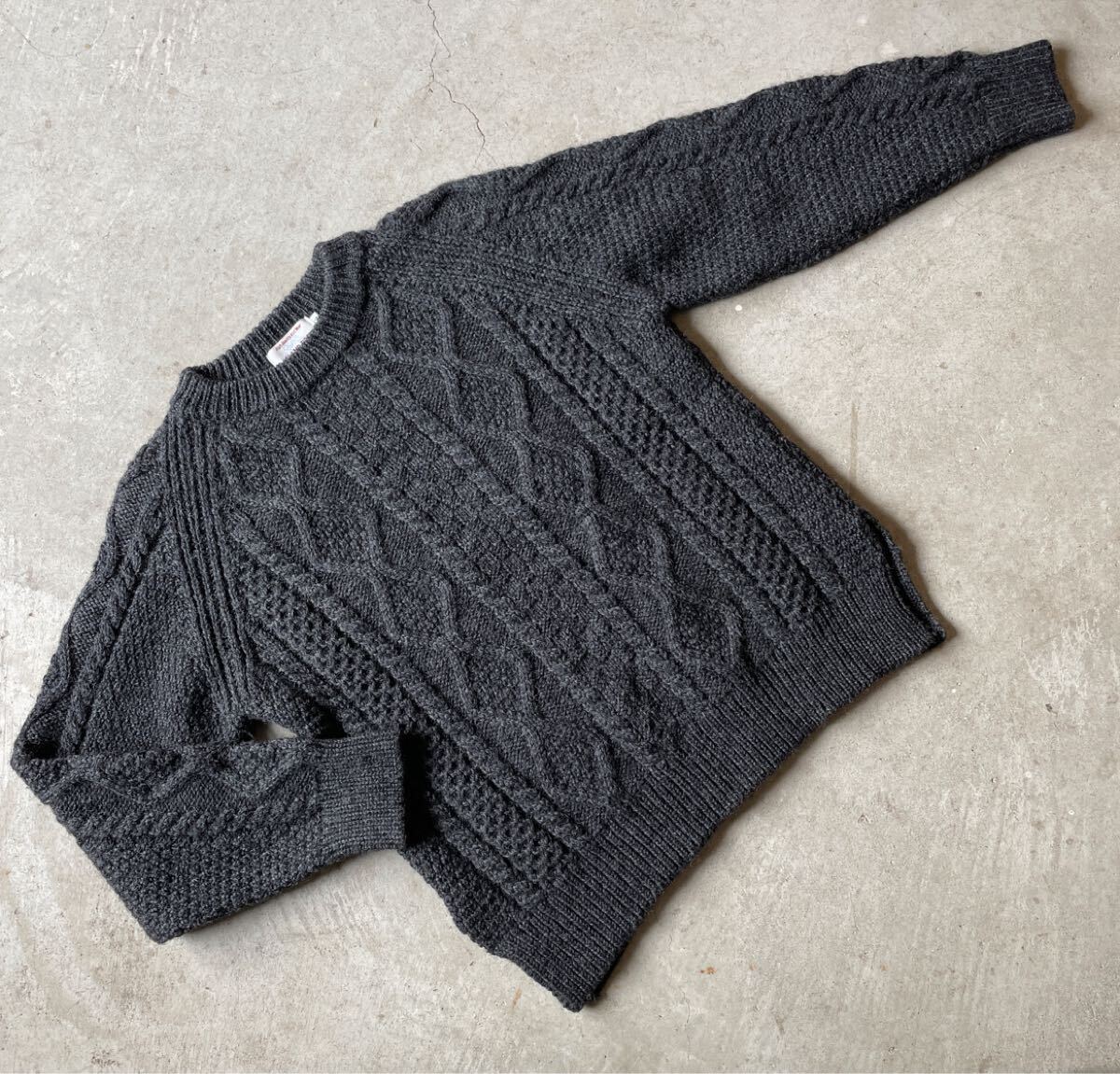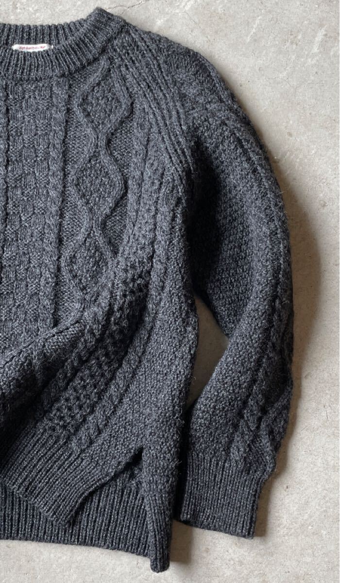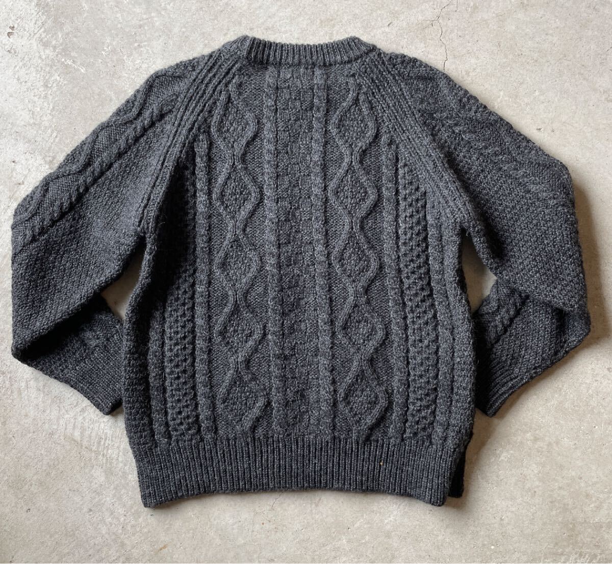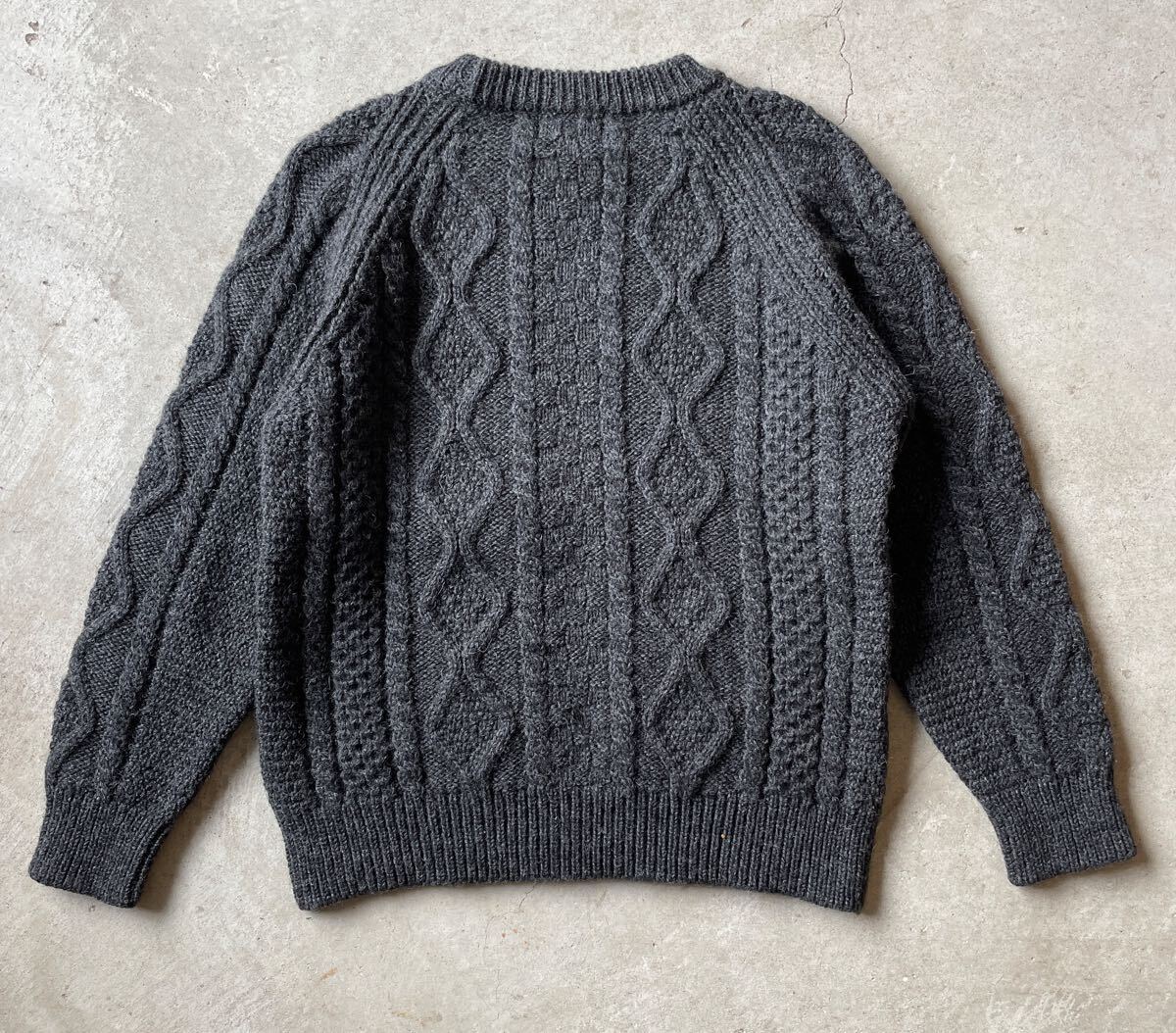 上質ウール100% 。ダークグレー系。アランニット フィッシャーマンセーターになります。肉厚で複雑繊細に編み込まれています。サイドスリット。34 Sサイズ。ラグランスリーブで肩のおちるサイズ感フォルムの良い品です。男女問わずざっくりと着て頂けるかと思います。