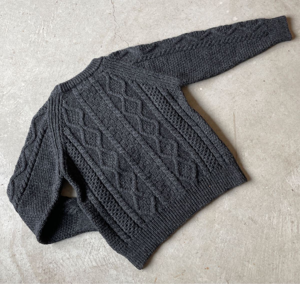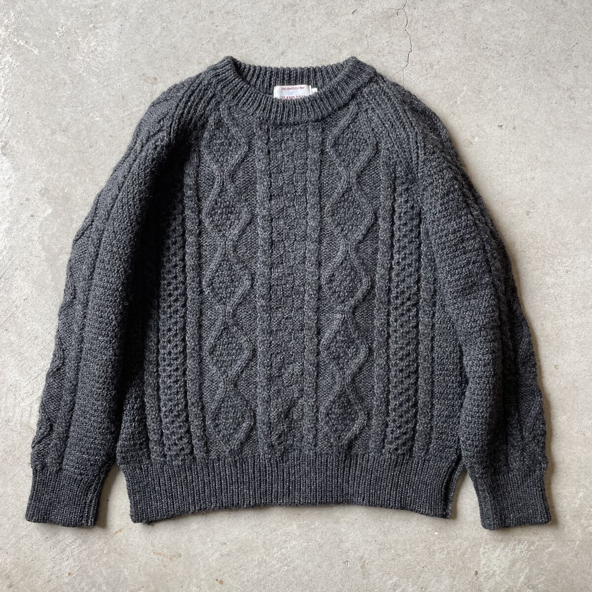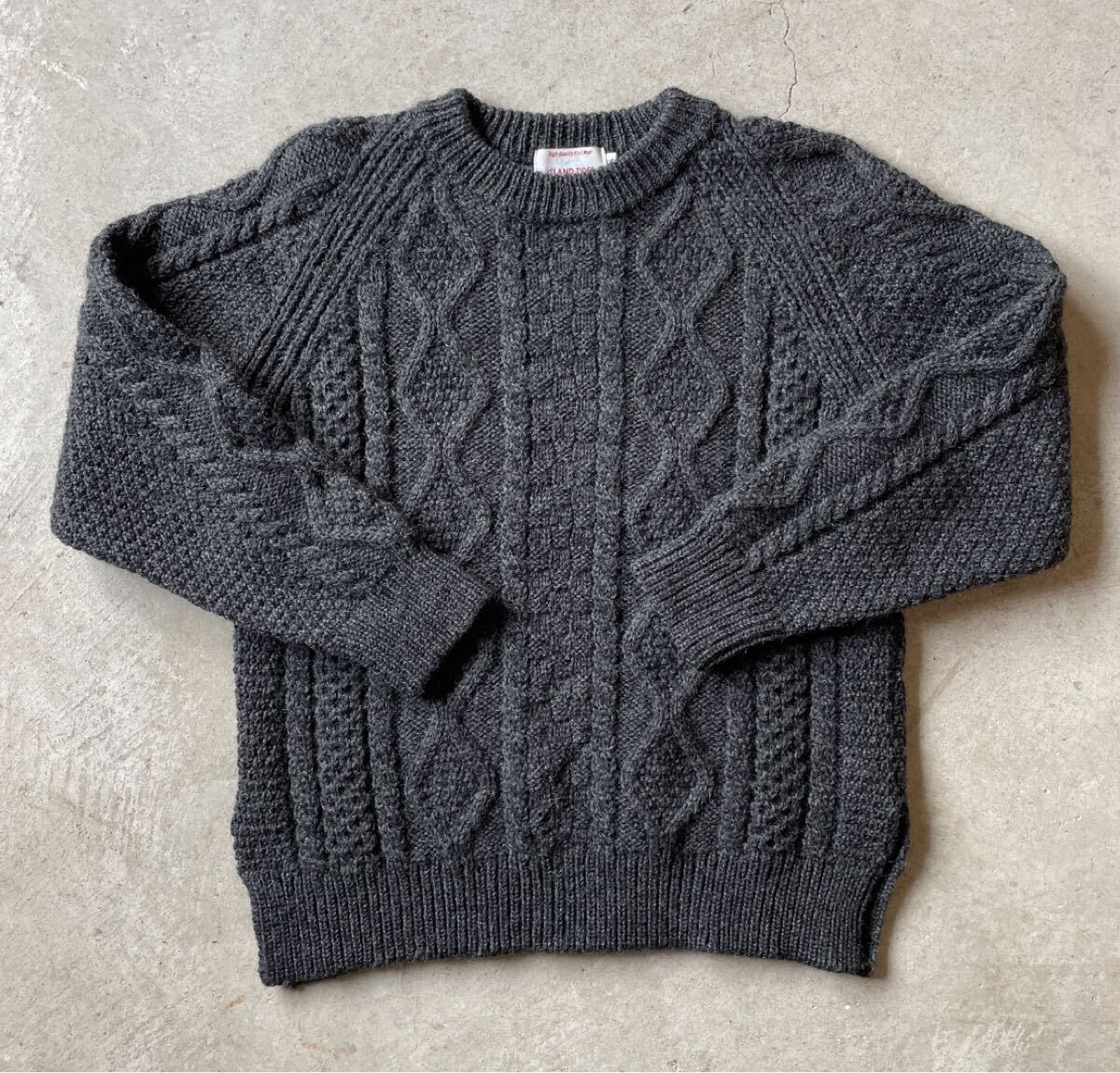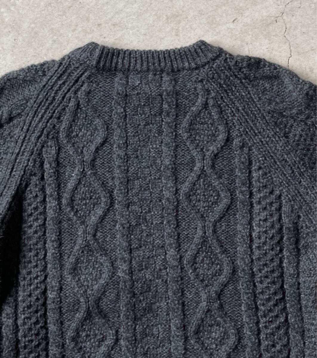 上質ウール100% 。ダークグレー系。アランニット フィッシャーマンセーターになります。肉厚で複雑繊細に編み込まれています。サイドスリット。34 Sサイズ。ラグランスリーブで肩のおちるサイズ感フォルムの良い品です。男女問わずざっくりと着て頂けるかと思います。