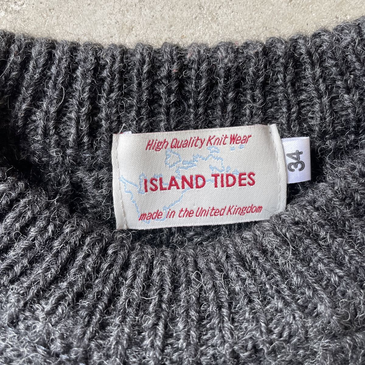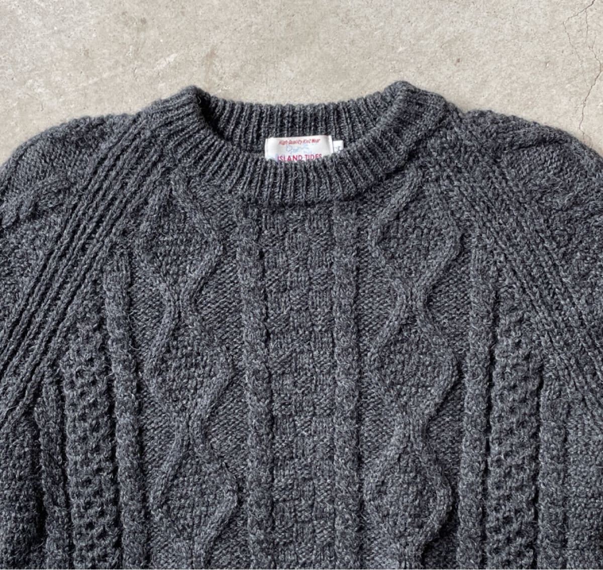 ヴィンテージ イギリス製 ISLAND TIDES フィッシャーマンセーター アランニット ラグランスリーブ 肉厚 ウール100% グレーサイドスリット S 英国製 古着になります。