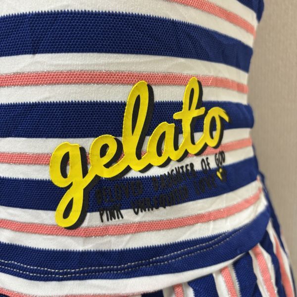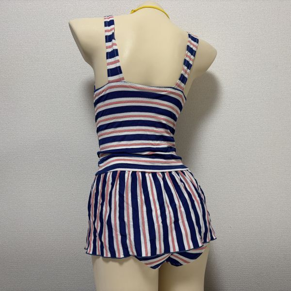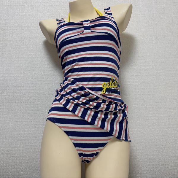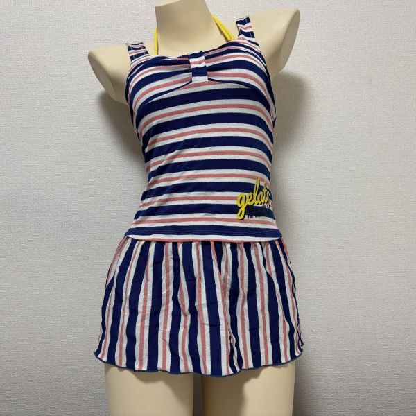 14関西ファッション連合女子競泳水着160(Lサイズ程度)★ホルターネック・スカート・股上ハイレグ★濃紺ネイビー白ピンクボーダーラメ入り