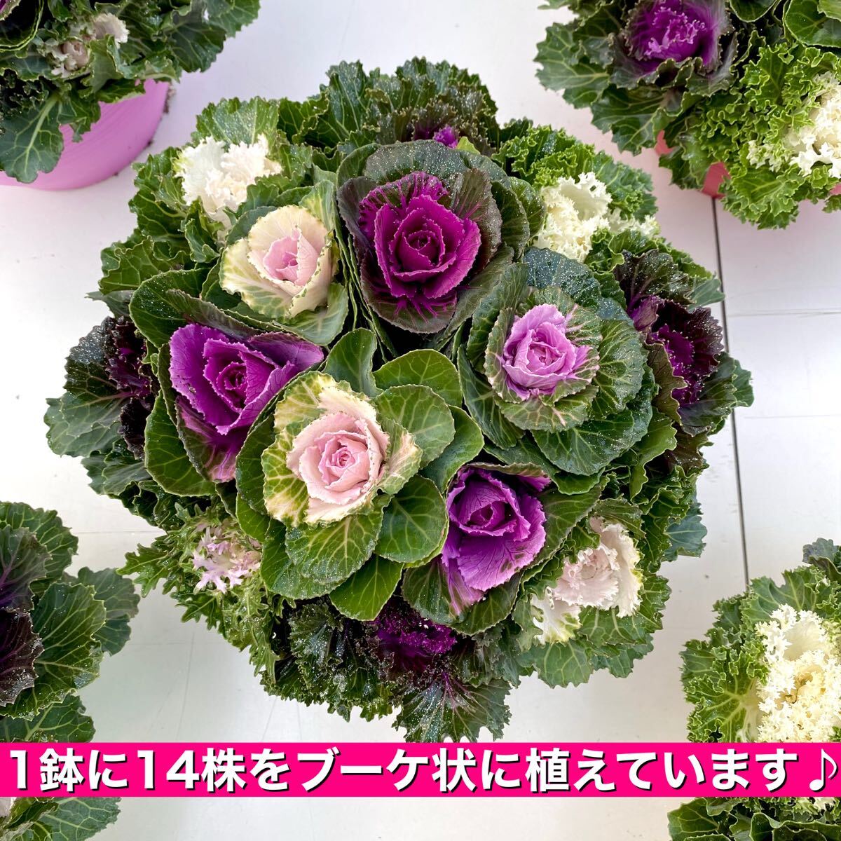 年末までの出品で葉牡丹苗は来年の3月に花芽があがるまで、形も崩れず楽しめます。