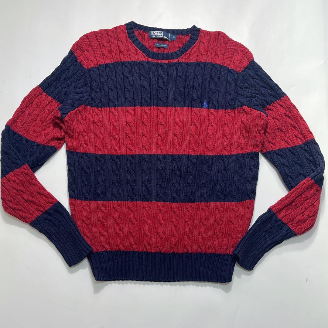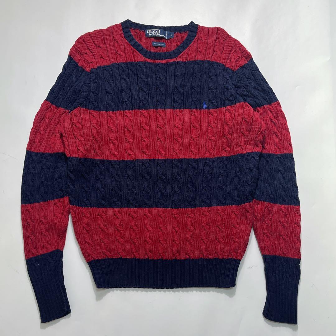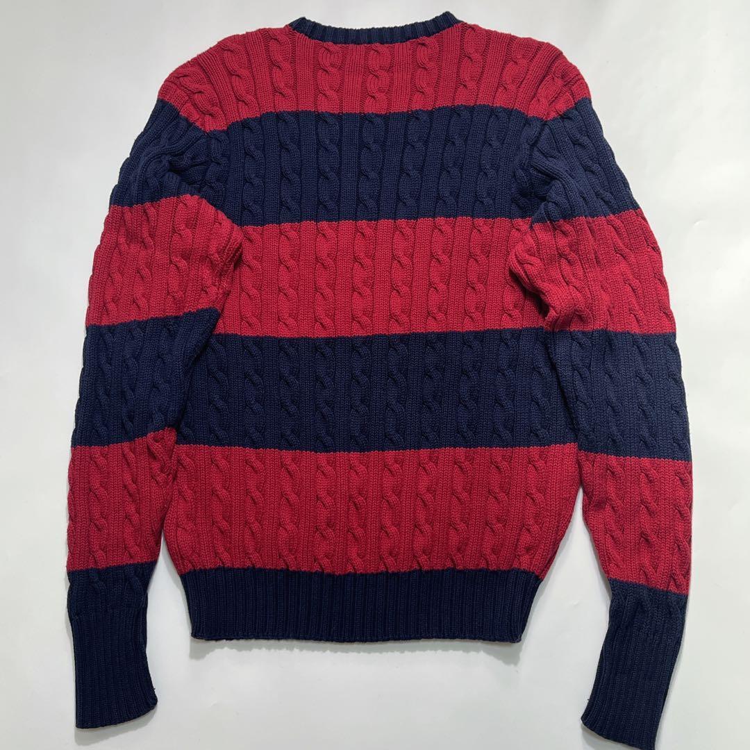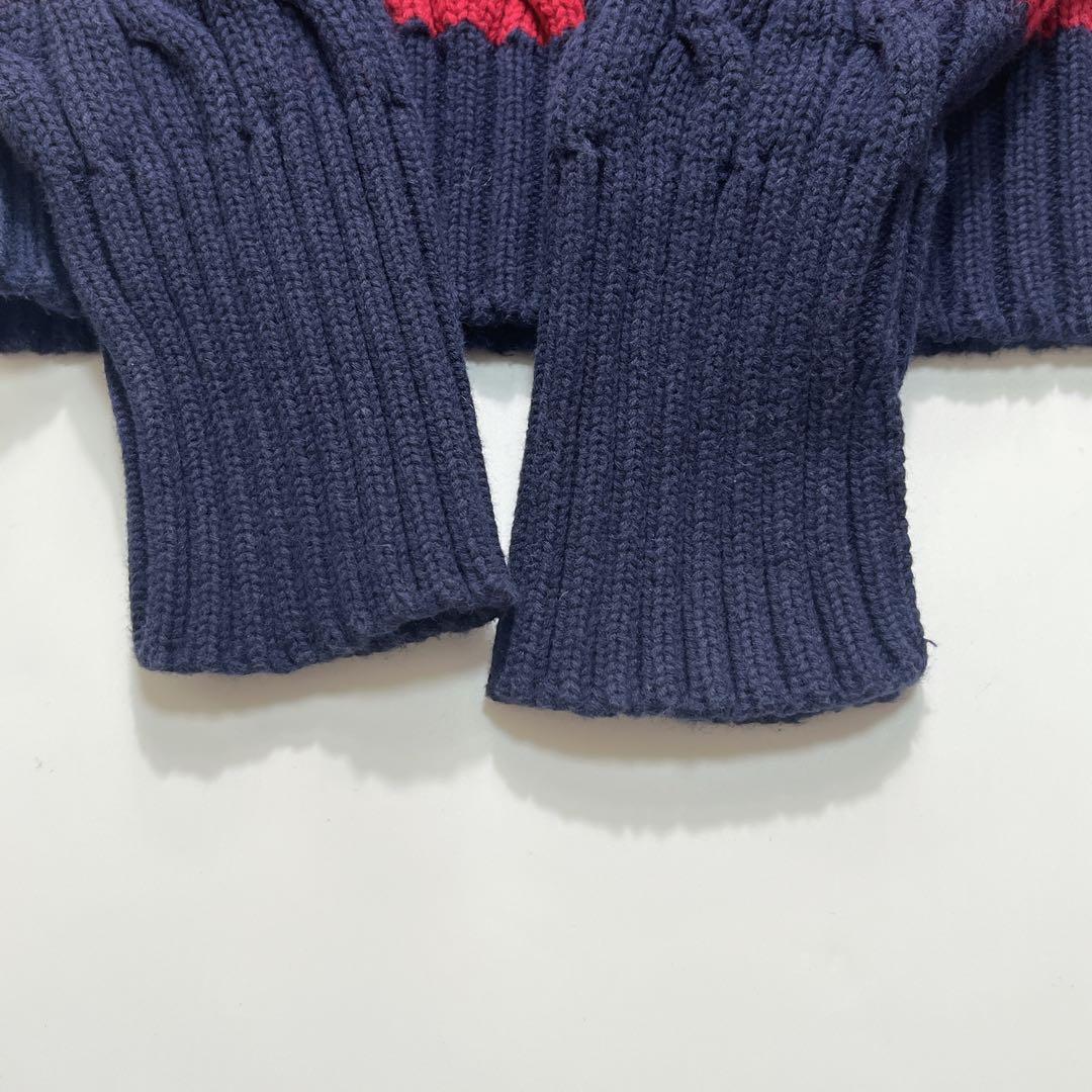 【90’s POLO RALPH LAUREN Cable Knit Sweater Navy Red Border L】