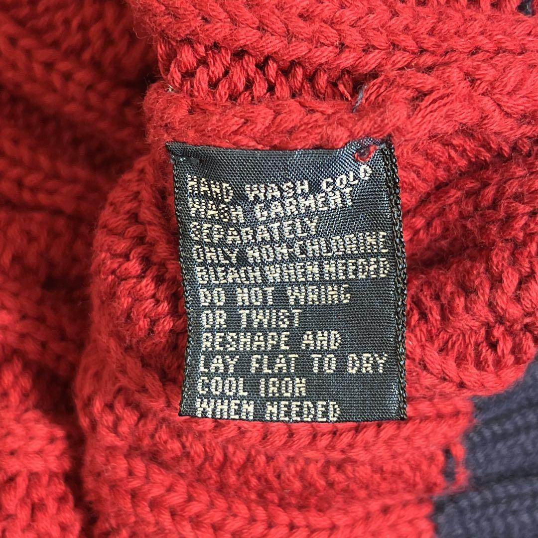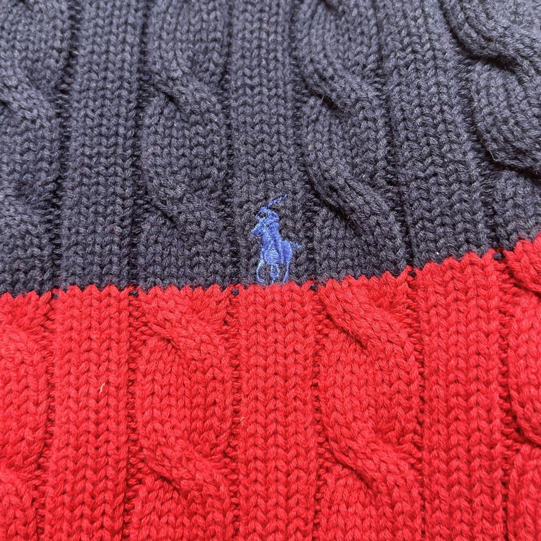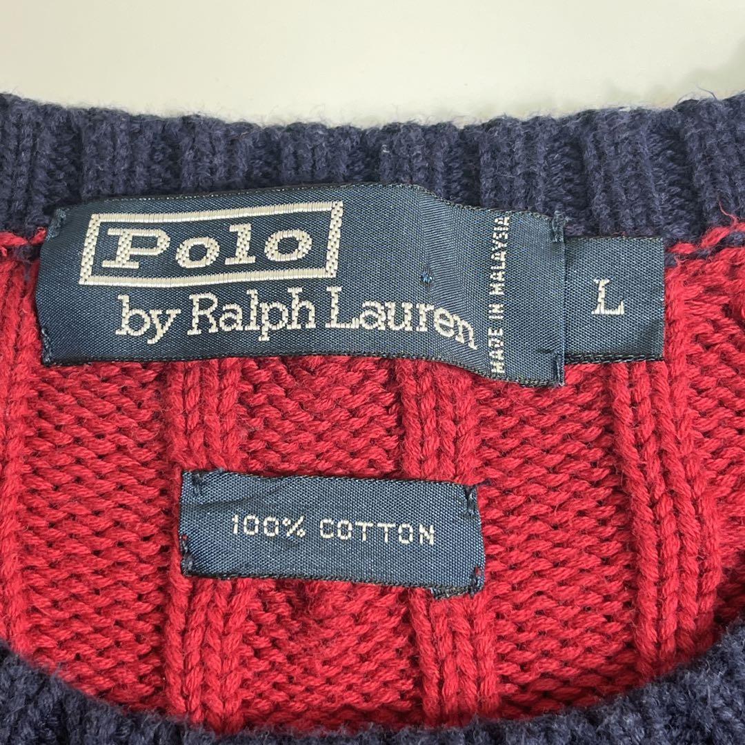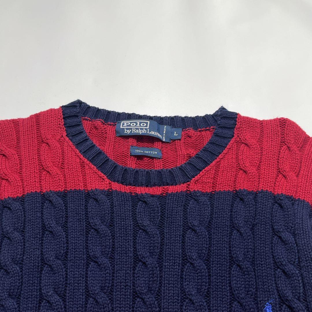 【90’s POLO RALPH LAUREN Cable Knit Sweater Navy Red Border L】