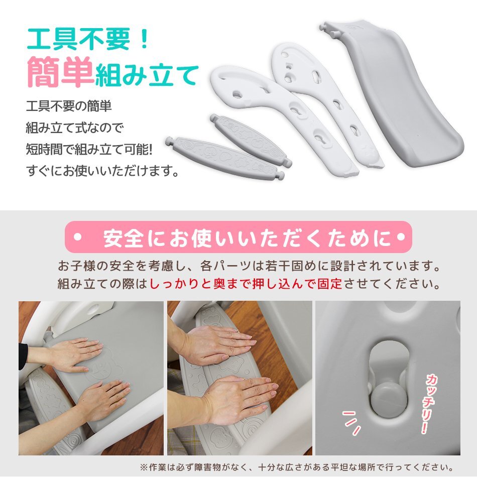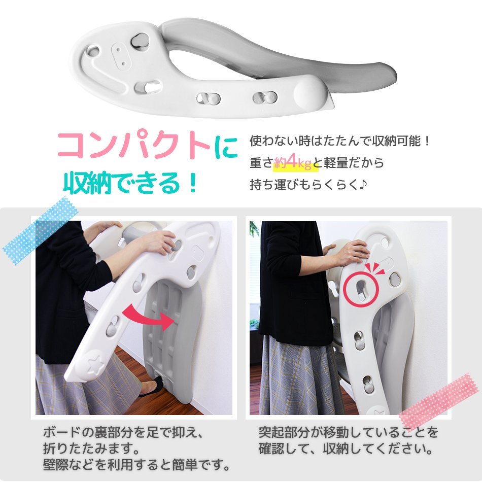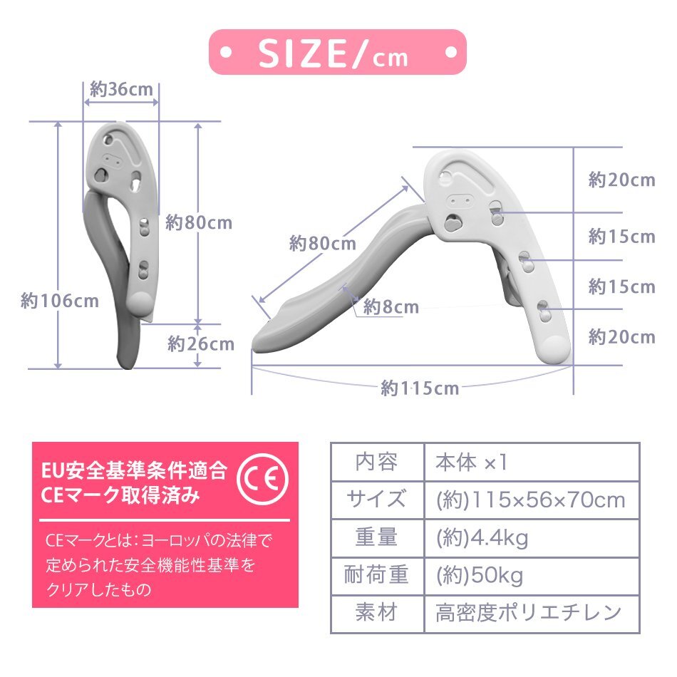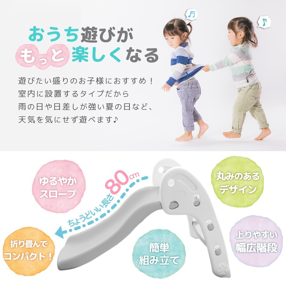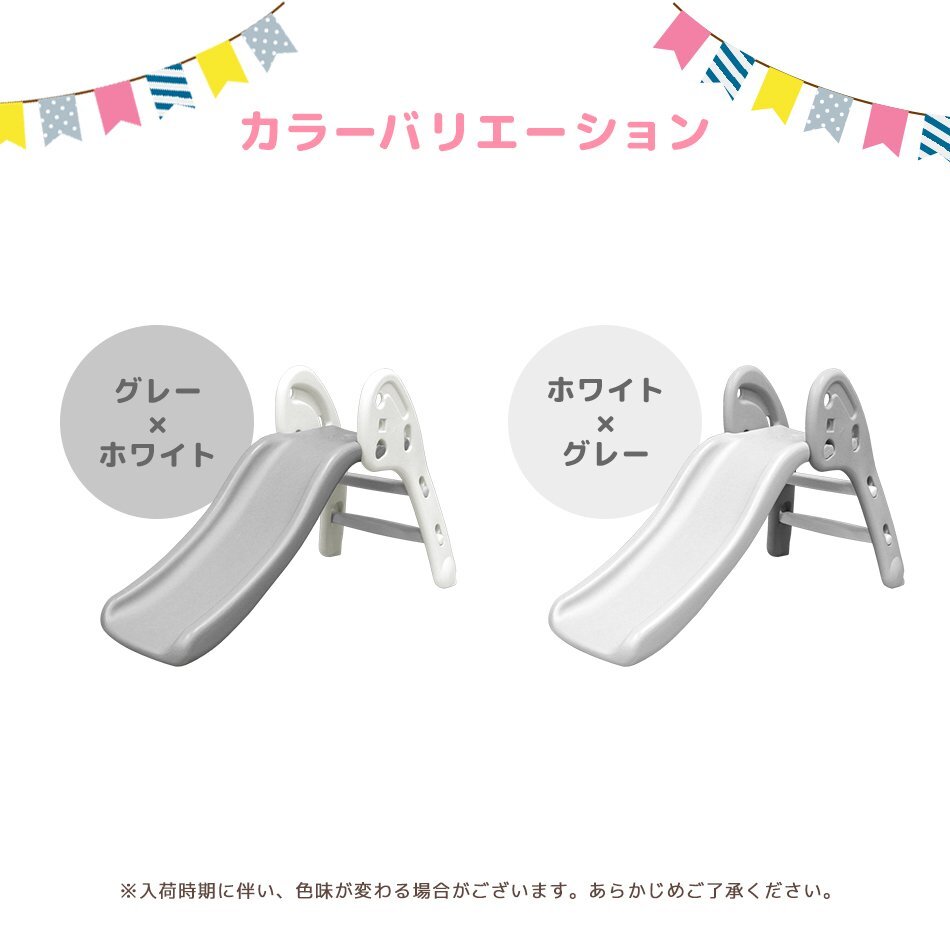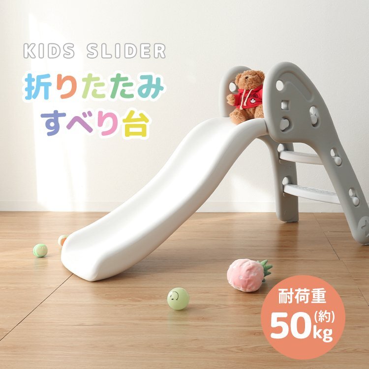いつでも遊べる折りたたみ式すべり台です お子様が使うには十分な耐荷重50kgと、安心して遊ばせることができるアイテム!! お家の中で遊ぶことができるので、夏の強い日差しや梅雨の時、 冬の寒い日などを気にせずに、一年中いつでも元気に遊ぶことができます。 差し込む・引き上げ・はめ込むだけの簡単組立! 工具は一切必要ありません♪ 使わないときはカンタン一押しでコンパクトに収納! 移動やお掃除もラクラク♪ ♪誕生日プレゼント・クリスマスプレゼントにもおすすめ♪ 【商品仕様】 ・カラー:ホワイト×グレー ・サイズ:(約)115cm×56cm×70cm ・重量:(約)4.4kg ・耐荷重:(約)50kg ・材質:高密度ポリエチレン 【注意事項】 ・必ず保護者のもとでご使用し、お子様の行動には十分ご注意ください。 ・屋外でのご使用には一切責任を負いかねます。予めご了承ください。 ・耐荷重以上の重量を製品にかけると破損や事故の原因になります。 ・大変危険ですので、2人以上で同時に使用しないでください ・ラッピングは承っておりません。 ・海外製品のため梱包や輸送による本体の細かな傷や擦れ・汚れがある場合がございますのでご理解、ご了承ください。 ・商品は、モニターによって色合いが異なって見える場合があります。 ・仕様・デザインは改良のため予告なく変更することがあります。 ・折りたたむ際は、指を挟まないようにお気を付けください |