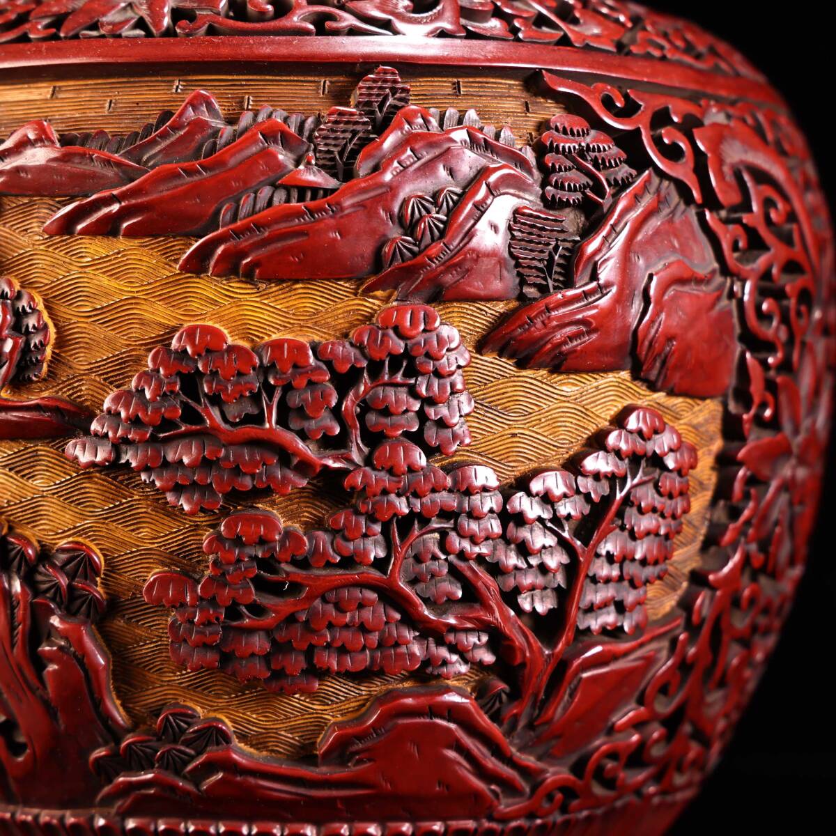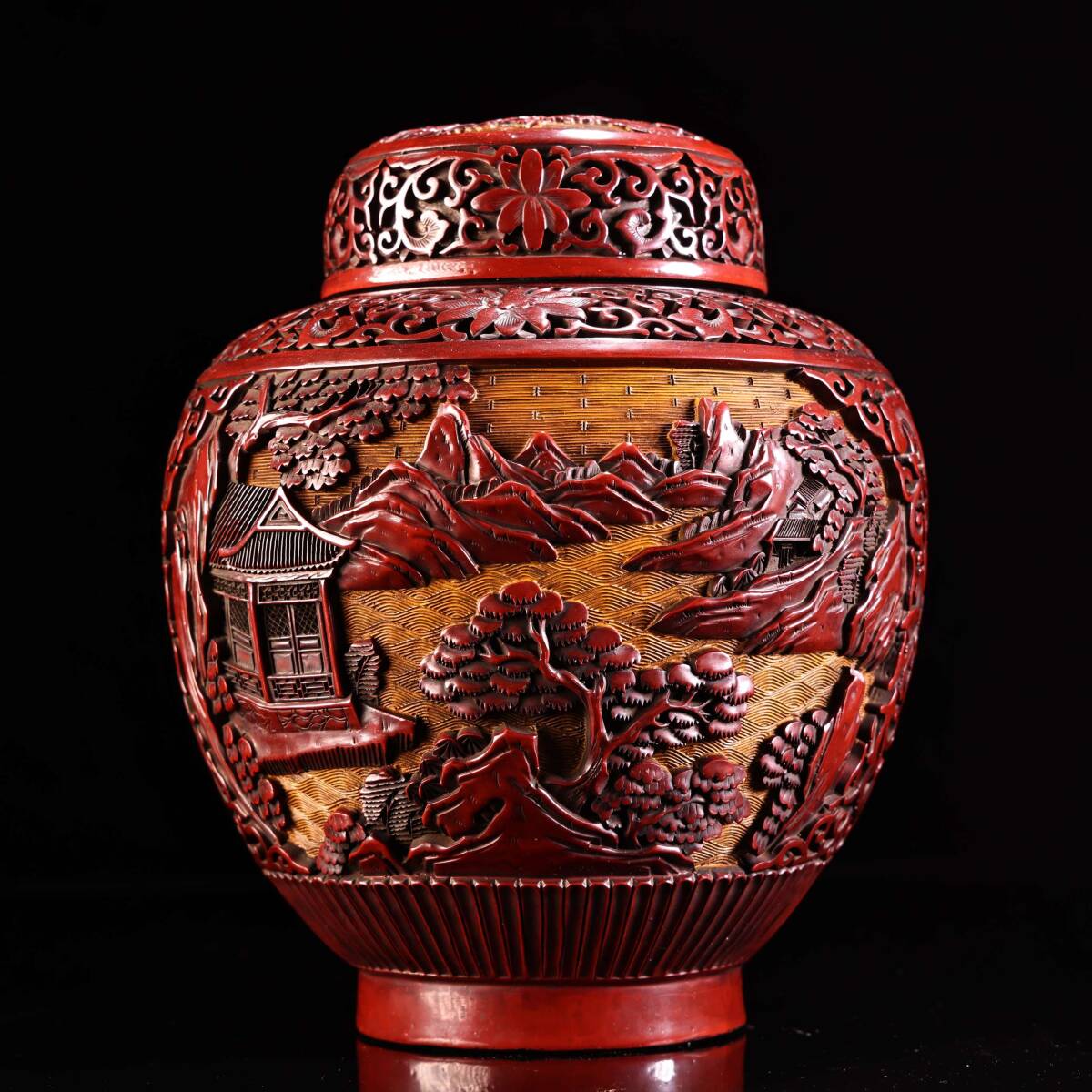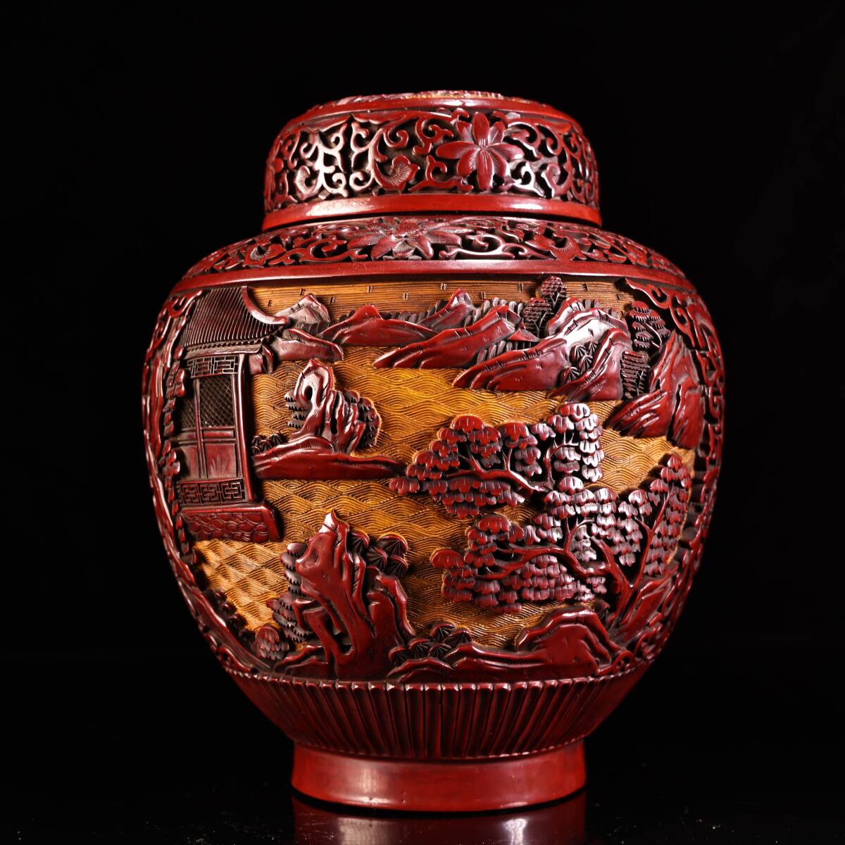 館蔵 大清乾隆年製 木胎漆器 剔紅 堆朱 山水紋 罐 古擺件 古置物 古董品 時代物 賞物 貴重 稀少珍品 中国古美術 古美味 蔵出