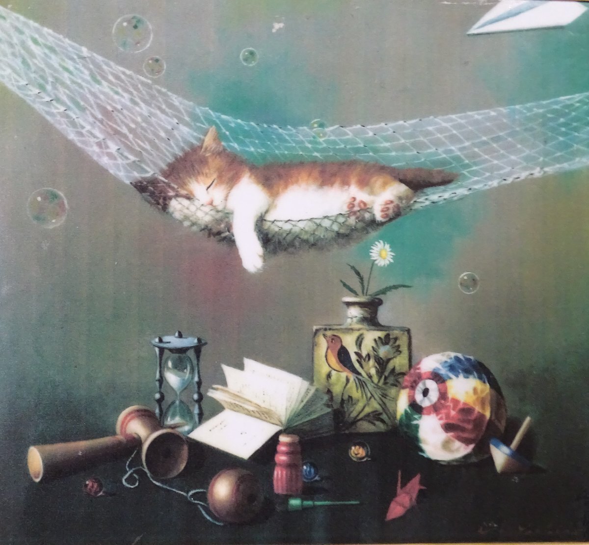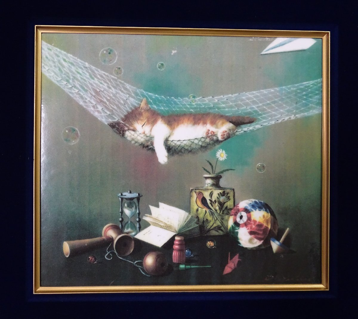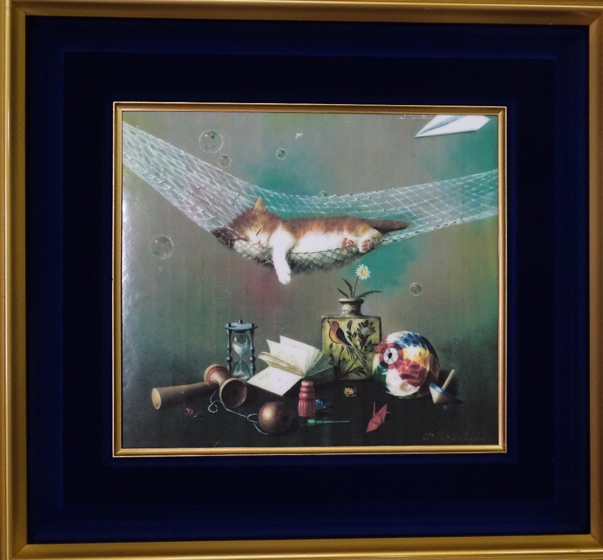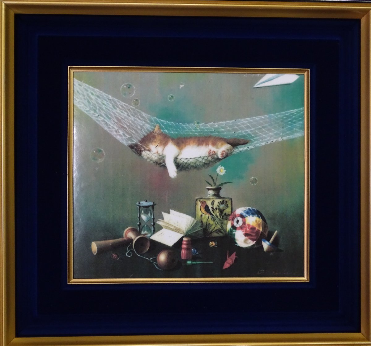 ・作者: 八代亜紀 ・画題: ハンモックと猫 ・技法:複製画 ・NO-R6-11-15.8