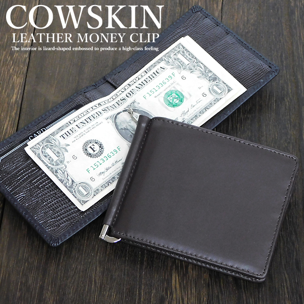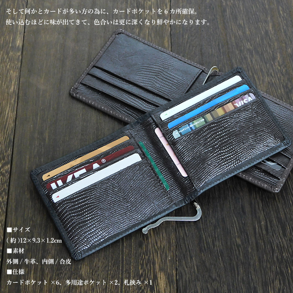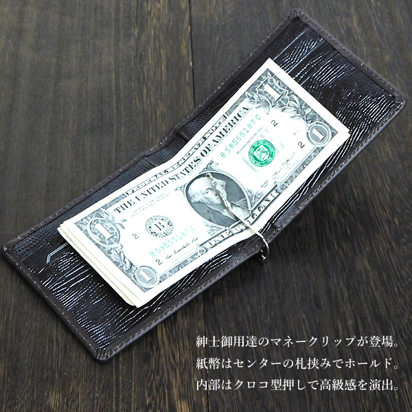 送料無料 マネークリップ メンズ 牛革 メンズ 財布 インナー リザード型押し 二つ折り財布 カードケース パスケース ブラウン 新品□