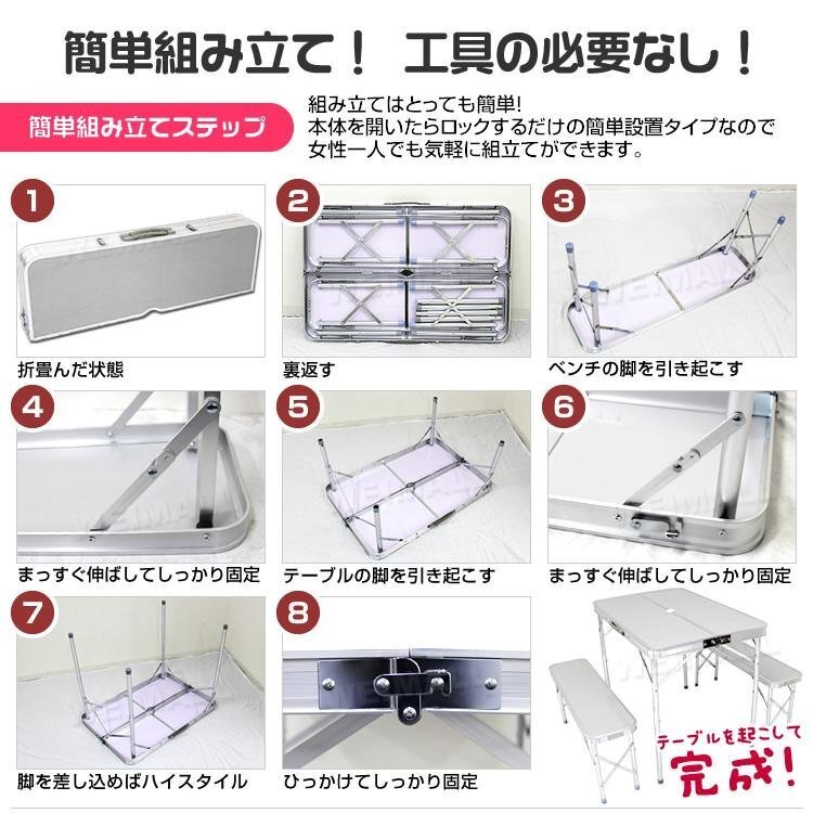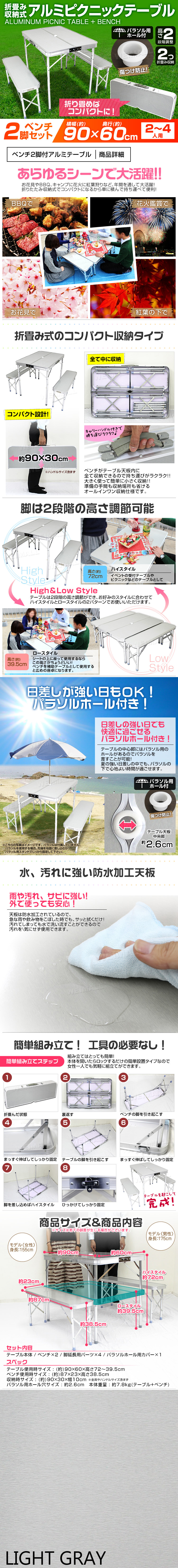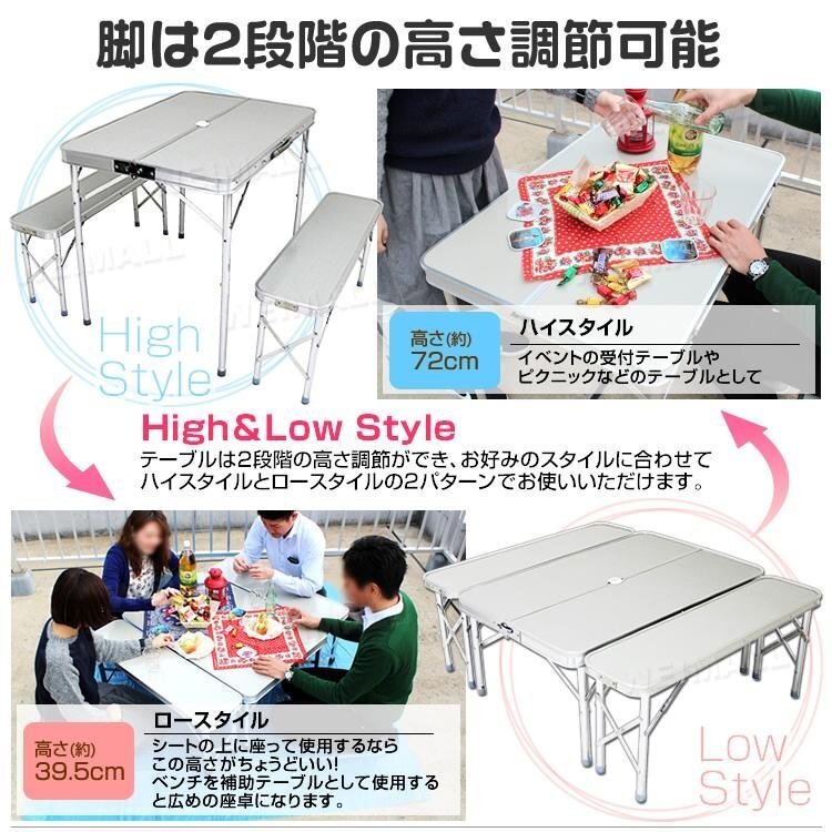 | 軽量アルミ製+取っ手付きで気軽に持ちだして、アウトドアやBBQにぴったりのテーブル&ベンチセットです。 テーブルの中に椅子を収納することで、車のトランクに入れる時や持ち運びの時に便利です!! 組み立てはとっても簡単! 開いてロックするだけの簡単設置タイプなので女性一人でも気軽に組立てができます。 高さは「ハイスタイル」「ロースタイル」の2段階調節。 お好みや用途に合わせて使い分けることができる嬉しい仕様♪ 天板中心部にはパラソル用ホールがあるので、ベランダやテラスでの使用にもおススメです♪ キャンプ、バーベキュー、お花見などにとても便利! |