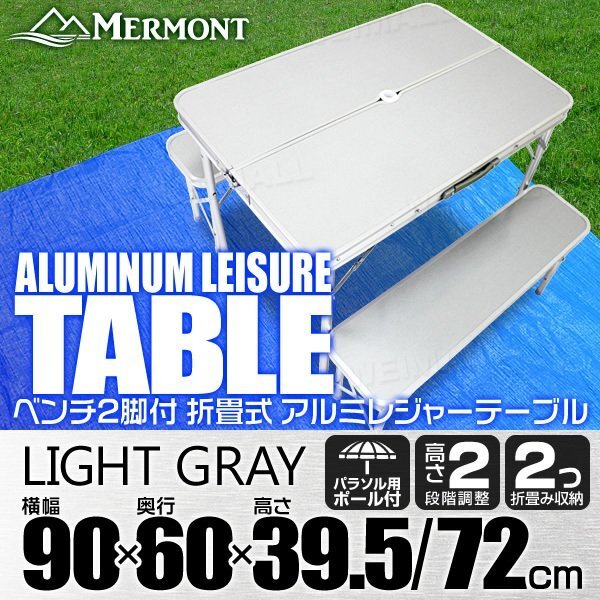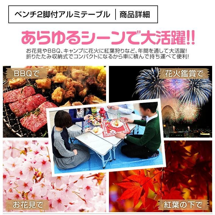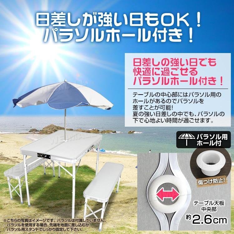 | 折りたたみ収納式 アルミレジャーテーブル 耐熱・耐水加工 パラソル用ホール付き 折りたたみベンチ2脚付きセット |