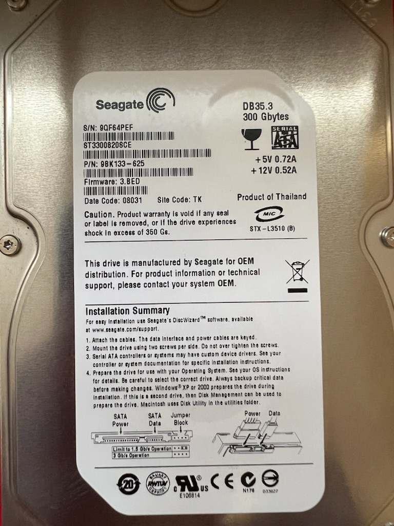 不良返金保証 東芝RDシリーズレコーダー用HDD ☆Seagate製 300GB/3.5インチ/SATA/ST3300820SCE (aa88)