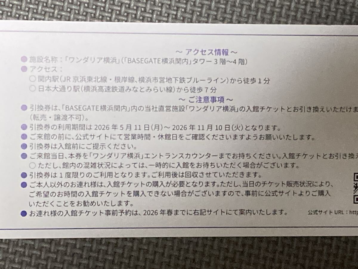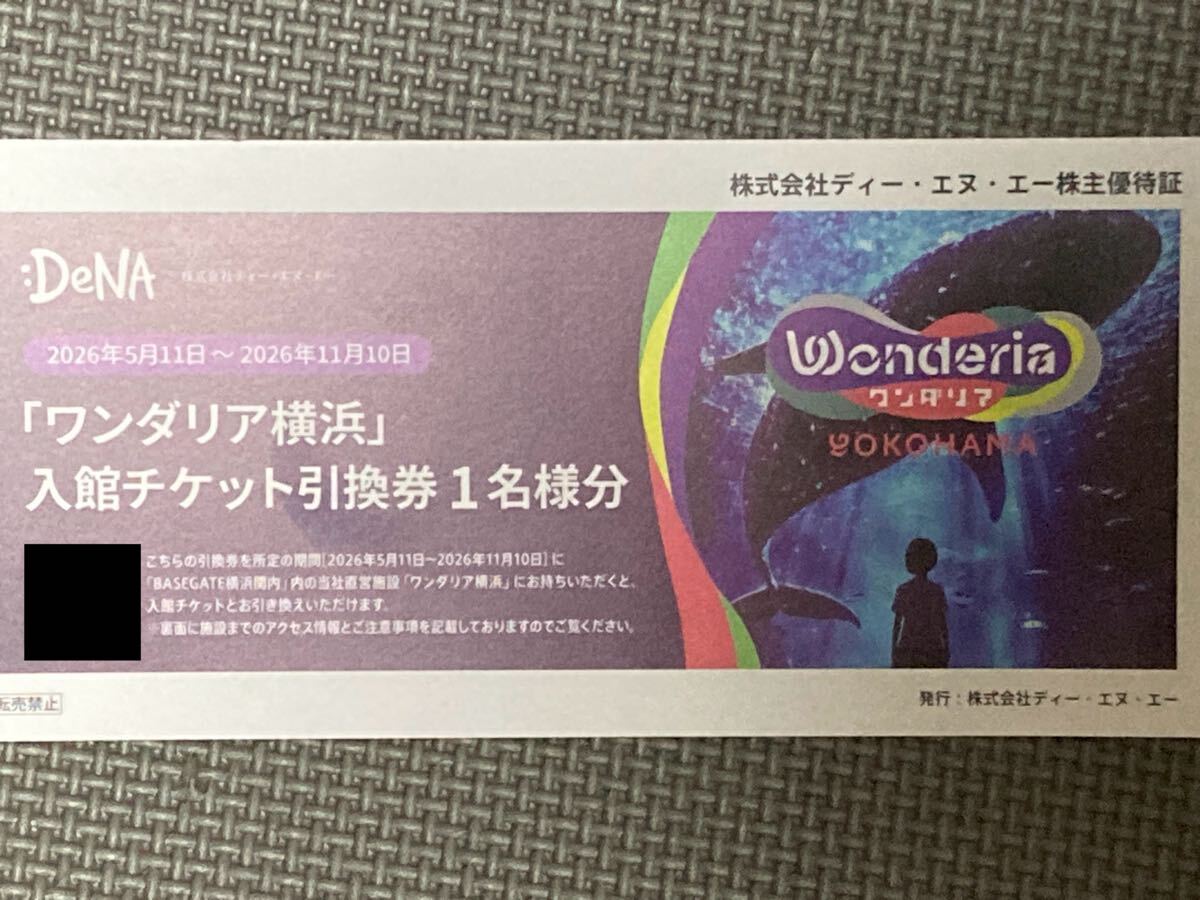 DeNA株主優待のワンダリア横浜入館チケット引換券1枚です。詳細は画像をご確認下さい。有効期間は2026/5/11〜11/10です。