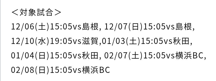 12/06(土)15:05vs島根, 12/07(日)15:05vs島根, 12/10(水)19:05vs滋賀,01/03(土)15:05vs秋田, 01/04(日)15:05vs秋田, 02/07(土)15:05vs横浜BC, 02/08(日)15:05vs横浜BC