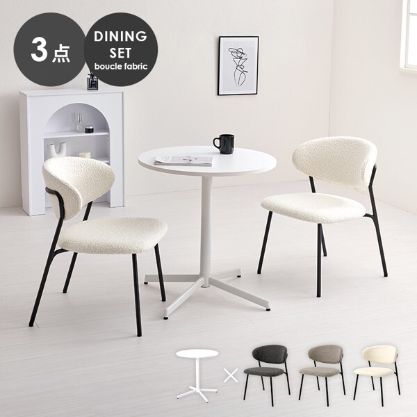 ※現在ご覧の商品ページはホワイトのご購入ページとなります。 ヤフオクの仕様上単一ページに複数バリエーションを掲載することができませんので、他バリエーションが希望の場合は別ページでご購入お願い致します。 ぽこぽことした質感が特徴的なブークレ生地のチェアとホワイトカフェテーブルを合わせた、モダンでありながら温かみのある雰囲気の3点セット。 配達業者を指定いただくことはできません。 北海道/沖縄/離島のお届けに別途中継料金が発生します。 ※別途送料が発生する場合は後ほどご連絡させていただきます。 当店は正規店です。 タイミングによっては在庫切れの場合があります。