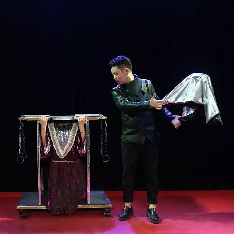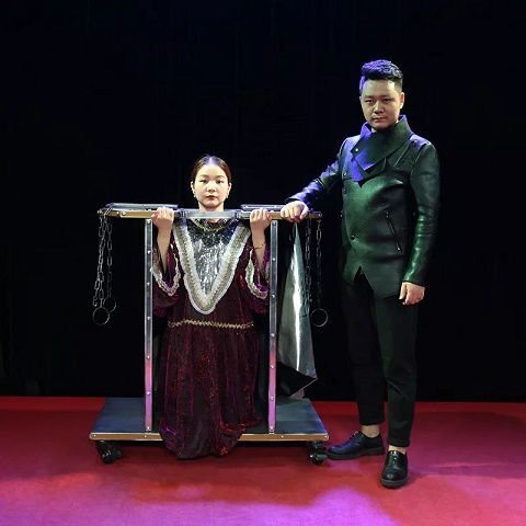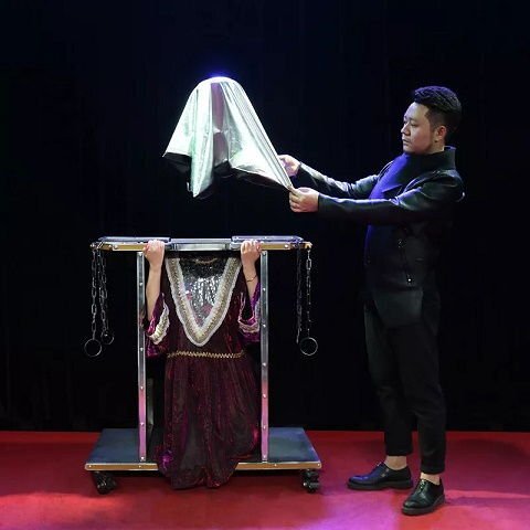 演者が女性の頭にシルクをかぶせ、刃で頭を切断します!